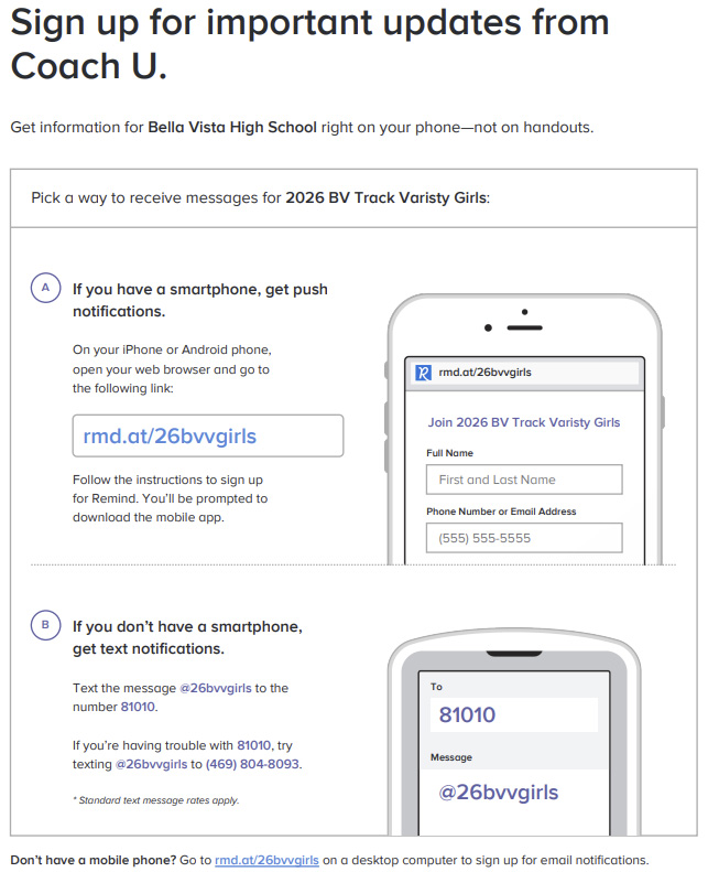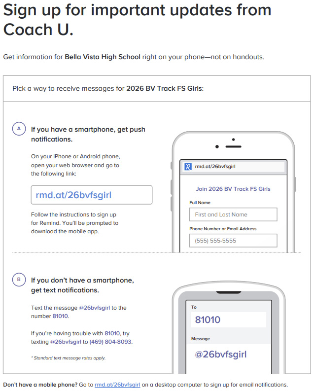 To receive Bella Vista Track and Field text message or email announcements follow these instructions.