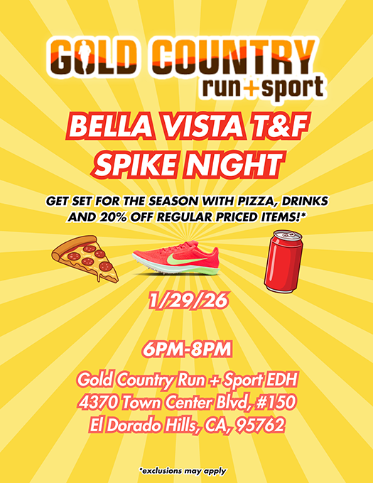 2026 Bella Vista Spike Night at Gold Country: Gold Country Run and Sport is having a BV track and field spike night on Thursday, January 29 from 6:00 to 8:00 pm. They are offering a 20% discount to Bella Vista team members along with free pizza and drinks. They are located at 4370 Town Center Blvd, #150, El Dorado Hills, CA, 95762. Check them out for a great deal on shoes. If you have questions about what to buy just ask a coach!