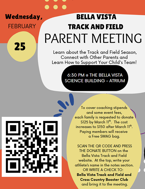 Attention Parents - As a reminder the Track and Field Team is seeking your donation of $125.00 to the BVXCT Booster Club (click/tap for donation form). The money is used to pay for our additional Coaching Stipends, Uniform Replacement and Athlete Entrance Fees. We will be collecting your donations at the Parent Meeting on Wednesday, February 26th at 6:30PM. We accept cash, checks (made out to Bella Vista Track and Cross Country Booster Club with your athlete's name in the memo), Apple Pay or Online Donations. For those that pay on Wednesday there will be a raffle drawing to win a free family pack for entrance into our home track meets.
