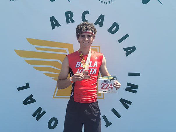 The next day on Saturday morning, senior pole vaulter Grant Hymas began his warm up and raised the eyebrows of the BV coaching staff who witnessed that he was looking stronger than he ever has on his warm up vaults. He looked extremely confident before the competition began and that condidence carried over to his performance. Grant opened at 14-07 and cleared on his first attempt. Continuing into the competition, Grant cleared 15-02 then 15-07 (video - Note clearance!) also on first attempts. It took him three attempts to get his new PR at 16-01 (video) which is now the Bella Vista new school record. That 16-01 vault made him the 2025 open session champion. I have a feeling I'm going to be asked to buy a new pole for Grant because he just keeps going higher and higher!