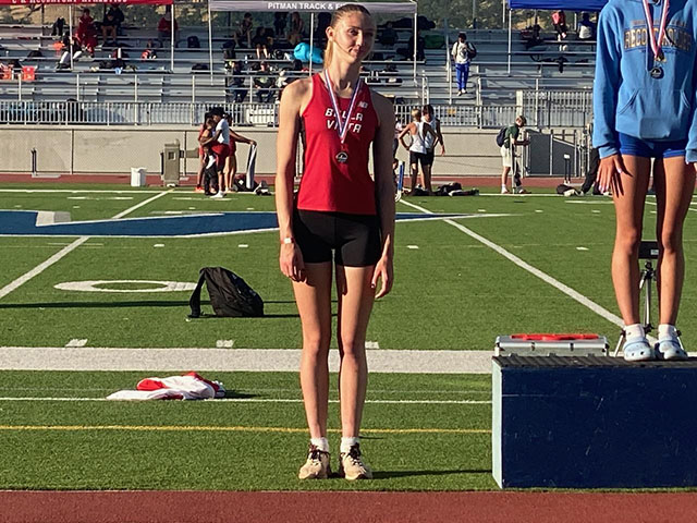 On Friday Night junior Zoe Corder was entered in the rated section of the 3200 meters. Before the meet she let it be known that she was gunning for the BV school record held by Cessair McKinney who ran 10:47.59 at the Sac Joaquin Section (SJS) Masters meet back in 2017. Zoe had perfect weather conditions and an excellent field of runners to push her to her best. She was instructed by Coach Kuphaldt to remain in the back of the pack and slowly surge towards the front as the race progressed. Her strategy worked to perfection as she crossed the finish line in a school record 10:45.70 (video) placing her 9th in the race but first in school history. Zoe is blessed with a tenacious drive and focus which has served her well so far. She is ranked 2nd in the SJS and is looking to improve. After watching her on Friday night I believe she will.