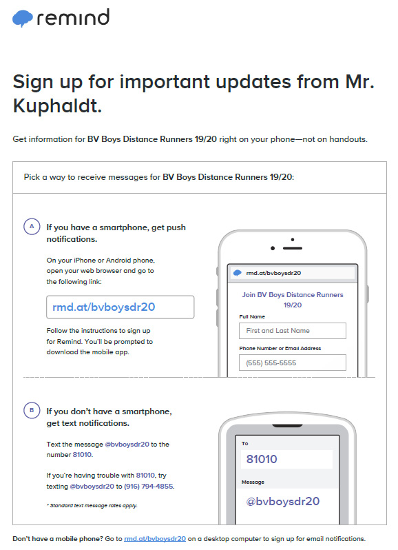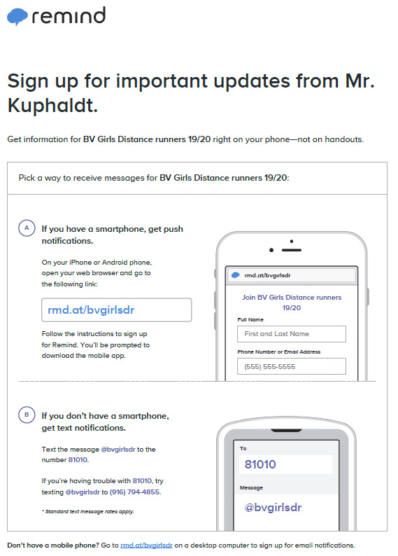 To receive Bella Vista Cross Country text message or email announcements follow these instructions (boys instructions are below the girls).