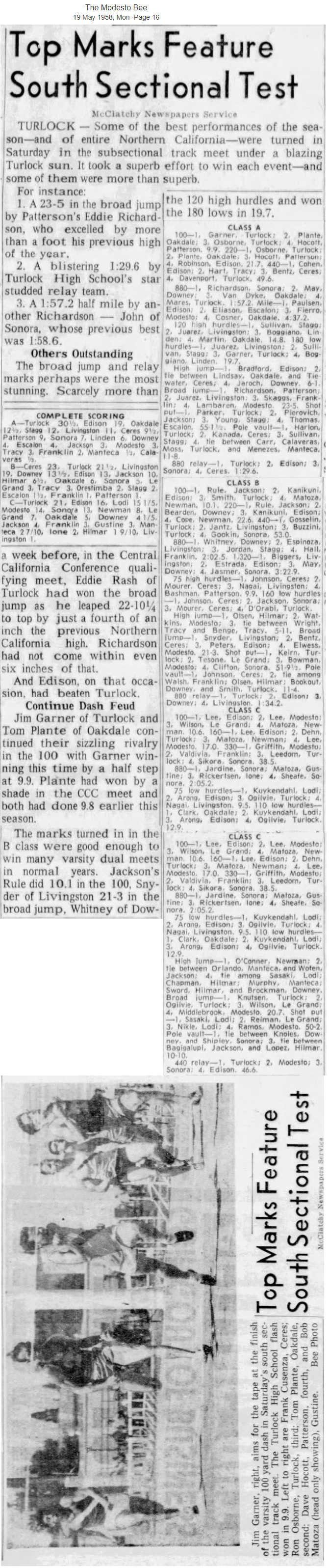 Licensed to Bella Vista High School Hy-Tek's Meet Manager Sac-Joaquin South Sub-Section Finals - 5/17/1958 Turlock High School Results Boys 100 Yard Dash Varsity ============================================================================ Name Year School Finals Wind Points ============================================================================ 1 Garner, Jim 12 Turlock 9.9 Boys 220 Yard Dash Varsity ============================================================================ Name Year School Finals Wind Points ============================================================================ 1 Osborne, Ron 12 Turlock 21.7 Boys 440 Yard Dash Varsity ======================================================================= Name Year School Finals Points ======================================================================= 1 Cohen, George 12 Edison (S) 49.6 Boys 880 Yard Run Varsity ======================================================================= Name Year School Finals Points ======================================================================= 1 Richardson, John 12 Sonora 1:57.2 Boys 1 Mile Run Varsity ======================================================================= Name Year School Finals Points ======================================================================= 1 Paulson, Stuart 12 Edison 4:37.2 Boys 120 Yard Hurdles Varsity ============================================================================ Name Year School Finals Wind Points ============================================================================ 1 Sullivan, Greg 12 Stagg 14.8 Boys 180 Yard Hurdles Varsity ======================================================================= Name Year School Finals Points ======================================================================= 1 Juarez, Rich 12 Livingston 19.7 Boys 4x220 Yard Relay Varsity ======================================================================= School Finals Points ======================================================================= 1 Turlock 1:29.6 Boys High Jump Varsity ======================================================================= Name Year School Finals Points ======================================================================= 1 Bradford, Herb 12 Edison 6-01.00 Boys Pole Vault Varsity ======================================================================= Name Year School Finals Points ======================================================================= 1 Harlan, Jim 12 Turlock 11-08.00 Boys Long Jump Varsity ============================================================================ Name Year School Finals Wind Points ============================================================================ 1 Richardson, Ed 12 Patterson 23-05.00 Boys Shot Put Varsity ======================================================================= Name Year School Finals Points ======================================================================= 1 Parker, Mike 11 Turlock 55-01.50