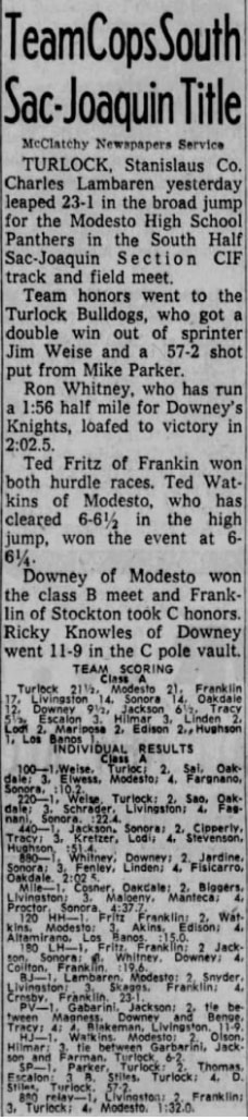 Licensed to Bella Vista High School Hy-Tek's Meet Manager Sac-Joaquin South Sub-Section Finals - 5/23/1959 Turlock High School Results Boys 100 Yard Dash Varsity ============================================================================ Name Year School Finals Wind Points ============================================================================ 1 Weise, Jim 12 Turlock 10.2 Boys 220 Yard Dash Varsity ============================================================================ Name Year School Finals Wind Points ============================================================================ 1 Weise, Jim 12 Turlock 22.4 Boys 440 Yard Dash Varsity ======================================================================= Name Year School Finals Points ======================================================================= 1 Jackson, Dennis 12 Sonora 51.4 Boys 880 Yard Run Varsity ======================================================================= Name Year School Finals Points ======================================================================= 1 Whitney, Ron 11 Downey 2:02.5 Boys 1 Mile Run Varsity ======================================================================= Name Year School Finals Points ======================================================================= 1 Cosner, John 12 Oakdale 4:37.7 Boys 120 Yard Hurdles Varsity ============================================================================ Name Year School Finals Wind Points ============================================================================ 1 Fritz, Ted 12 Franklin 15.0 Boys 180 Yard Hurdles Varsity ======================================================================= Name Year School Finals Points ======================================================================= 1 Fritz, Ted 12 Franklin 19.6 Boys 4x220 Yard Relay Varsity ======================================================================= School Finals Points ======================================================================= 1 Livingston 1:32.0 Boys High Jump Varsity ======================================================================= Name Year School Finals Points ======================================================================= 1 Watkins, Ted 11 Modesto 6-02.00 Boys Pole Vault Varsity ======================================================================= Name Year School Finals Points ======================================================================= 1 Garbarini, Thomas 12 Jackson 11-09.00 Boys Long Jump Varsity ============================================================================ Name Year School Finals Wind Points ============================================================================ 1 Lambaren, Charles 12 Modesto 23-01.00 Boys Shot Put Varsity ======================================================================= Name Year School Finals Points ======================================================================= 1 Parker, Mike 12 Turlock 57-02.00