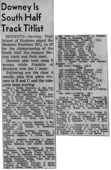 Licensed to Bella Vista High School Hy-Tek's Meet Manager Sac-Joaquin South Sub-Section Finals - 5/21/1960 Modesto Junior College Results Boys 100 Yard Dash Varsity ============================================================================ Name Year School Finals Wind Points ============================================================================ 1 Wolfe, Ken 12 Manteca 9.9 Boys 220 Yard Dash Varsity ============================================================================ Name Year School Finals Wind Points ============================================================================ 1 Sai, John 12 Oakdale 21.8 Boys 440 Yard Dash Varsity ======================================================================= Name Year School Finals Points ======================================================================= 1 Williams, Fred 11 Amador 49.5 Boys 880 Yard Run Varsity ======================================================================= Name Year School Finals Points ======================================================================= 1 Whitney, Ron 12 Downey 1:55.2 Boys 1 Mile Run Varsity ======================================================================= Name Year School Finals Points ======================================================================= 1 Olbrantz, Mike 11 Downey 4:37.8 Boys 120 Yard Hurdles Varsity ============================================================================ Name Year School Finals Wind Points ============================================================================ 1 Watkins, Ted 12 Modesto 14.8 Boys 180 Yard Hurdles Varsity ======================================================================= Name Year School Finals Points ======================================================================= 1 Whitney, Ron 12 Downey 19.4 Boys 4x220 Yard Relay Varsity ======================================================================= School Finals Points ======================================================================= 1 Livingston 1:30.9 Boys High Jump Varsity ======================================================================= Name Year School Finals Points ======================================================================= 1 Watkins, Ted 12 Modesto 6-03.00 Boys Pole Vault Varsity ======================================================================= Name Year School Finals Points ======================================================================= 1 Blakeman, Riley 11 Livingston 12-00.00 1 Knoles, Rick 12 Downey 12-00.00 Boys Long Jump Varsity ============================================================================ Name Year School Finals Wind Points ============================================================================ 1 Skaggs, John 12 Franklin 22-11.50 Boys Shot Put Varsity ======================================================================= Name Year School Finals Points ======================================================================= 1 Maggard, Larry 10 Turlock 51-10.75