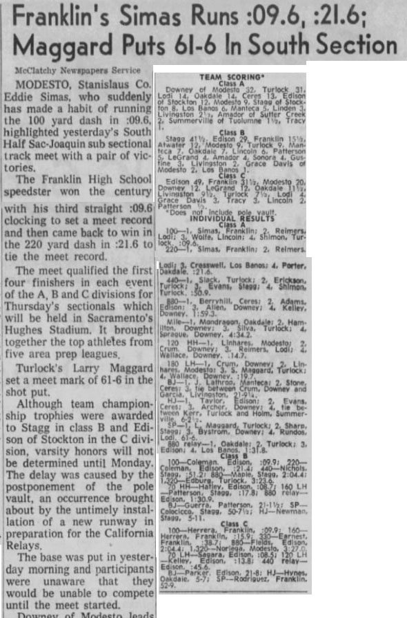 Licensed to Bella Vista High School Hy-Tek's Meet Manager Sac-Joaquin South Sub-Section Finals - 5/17/1962 Modesto Junior College Results Boys 100 Yard Dash Varsity ============================================================================ Name Year School Finals Wind Points ============================================================================ 1 Simas, Eddie 12 Franklin 9.6 Boys 220 Yard Dash Varsity ============================================================================ Name Year School Finals Wind Points ============================================================================ 1 Simas, Eddie 12 Franklin 21.6 Boys 440 Yard Dash Varsity ======================================================================= Name Year School Finals Points ======================================================================= 1 Slack, Herb 12 Turlock 50.6 Boys 880 Yard Run Varsity ======================================================================= Name Year School Finals Points ======================================================================= 1 Berryhill, Larry 11 Ceres 1:59.3 Boys 1 Mile Run Varsity ======================================================================= Name Year School Finals Points ======================================================================= 1 Mondragon, Rudy 12 Oakdale 4:34.2 Boys 120 Yard Hurdles Varsity ============================================================================ Name Year School Finals Wind Points ============================================================================ 1 Linhares, Pete 12 Modesto 14.7 Boys 180 Yard Hurdles Varsity ======================================================================= Name Year School Finals Points ======================================================================= 1 Crum, Jim 12 Downey 19.7 Boys 4x220 Yard Relay Varsity ======================================================================= School Finals Points ======================================================================= 1 Oakdale 1:31.8 Boys High Jump Varsity ======================================================================= Name Year School Finals Points ======================================================================= 1 Taylor, L. W. 11 Edison 6-02.50 Boys Pole Vault Varsity ======================================================================= Name Year School Finals Points ======================================================================= 1 Harvey, John 12 Oakdale 12-00.00 Boys Long Jump Varsity ============================================================================ Name Year School Finals Wind Points ============================================================================ 1 Lathrop, Larry 11 Manteca 21-09.25 Boys Shot Put Varsity ======================================================================= Name Year School Finals Points ======================================================================= 1 Maggard, Larry 12 Turlock 61-06.00