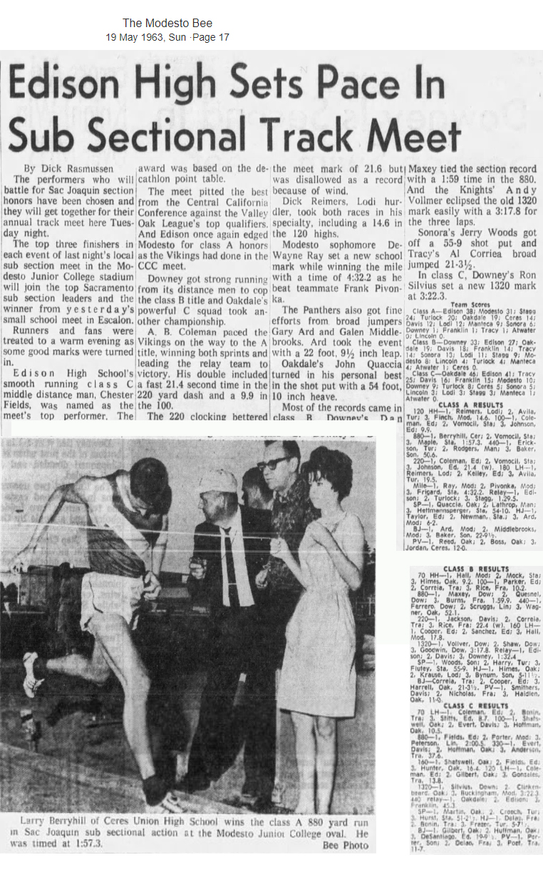 Licensed to Bella Vista High School Hy-Tek's Meet Manager Sac-Joaquin South Sub-Section Finals - 5/18/1963 Modesto Junior College Results Boys 100 Yard Dash Varsity ============================================================================ Name Year School Finals Wind Points ============================================================================ 1 Coleman, A.B. 12 Edison 9.9 Boys 220 Yard Dash Varsity ============================================================================ Name Year School Finals Wind Points ============================================================================ 1 Coleman, A.B. 12 Edison 21.4 Boys 440 Yard Dash Varsity ======================================================================= Name Year School Finals Points ======================================================================= 1 Erickson, Howard 12 Turlock 50.6 Boys 880 Yard Run Varsity ======================================================================= Name Year School Finals Points ======================================================================= 1 Berryhill, Mike 12 Ceres 1:57.3 Boys 1 Mile Run Varsity ======================================================================= Name Year School Finals Points ======================================================================= 1 Ray, Duwayne 10 Modesto 4:32.2 Boys 120 Yard Hurdles Varsity ============================================================================ Name Year School Finals Wind Points ============================================================================ 1 Reimers, Dick 12 Lodi 14.6 Boys 180 Yard Hurdles Varsity ======================================================================= Name Year School Finals Points ======================================================================= 1 Reimers, Dick 12 Lodi 19.5 Boys 4x220 Yard Relay Varsity ======================================================================= School Finals Points ======================================================================= 1 Edison 1:29.5 Boys High Jump Varsity ======================================================================= Name Year School Finals Points ======================================================================= 1 Taylor, L. W. 12 Edison 6-02.00 Boys Pole Vault Varsity ======================================================================= Name Year School Finals Points ======================================================================= 1 Reed, Tom 12 Oakdale 12-00.00 Boys Long Jump Varsity ============================================================================ Name Year School Finals Wind Points ============================================================================ 1 Ard, Gary 12 Modesto 22-09.50 Boys Shot Put Varsity ======================================================================= Name Year School Finals Points ======================================================================= 1 Quaccia, John 12 Oakdale 54-10.00