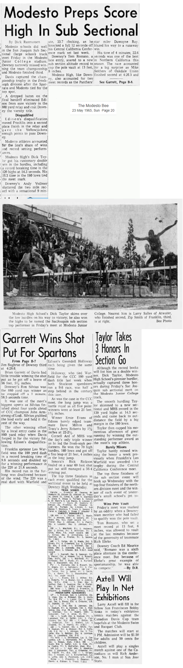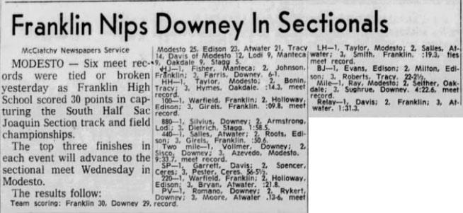 Licensed to Bella Vista High School Hy-Tek's Meet Manager Sac-Joaquin South Sub-Section Finals - 5/21/1965 Modesto Junior College Results Boys 100 Yard Dash Varsity ============================================================================ Name Year School Finals Wind Points ============================================================================ 1 Warfield, Leo 11 Franklin 9.8 Boys 220 Yard Dash Varsity ============================================================================ Name Year School Finals Wind Points ============================================================================ 1 Warfield, Leo 11 Franklin 21.8 Boys 440 Yard Dash Varsity ======================================================================= Name Year School Finals Points ======================================================================= 1 Salles, Larry 12 Atwater 50.6 Boys 880 Yard Run Varsity ======================================================================= Name Year School Finals Points ======================================================================= 1 Silvius, Ron 12 Downey 1:58.5 Boys 1 Mile Run Varsity ======================================================================= Name Year School Finals Points ======================================================================= 1 Ray, Duwayne 12 Modesto 4:22.6 Boys 2 Mile Run Varsity ======================================================================= Name Year School Finals Points ======================================================================= 1 Vollmer, Andy 12 Downey 9:33.7 Boys 120 Yard Hurdles Varsity ============================================================================ Name Year School Finals Wind Points ============================================================================ 1 Taylor, Dick 12 Modesto 14.3 Boys 180 Yard Hurdles Varsity ======================================================================= Name Year School Finals Points ======================================================================= 1 Taylor, Dick 12 Modesto 19.3 Boys 4x220 Yard Relay Varsity ======================================================================= School Finals Points ======================================================================= 1 Grace Davis 1:31.3 Boys High Jump Varsity ======================================================================= Name Year School Finals Points ======================================================================= 1 Fisher, Bruce 12 Manteca 6-01.00 Boys Pole Vault Varsity ======================================================================= Name Year School Finals Points ======================================================================= 1 Romano, Tom 12 Downey 13-06.00 Boys Long Jump Varsity ============================================================================ Name Year School Finals Wind Points ============================================================================ 1 Evans, Dale 12 Edison 22-02.50 Boys Shot Put Varsity ======================================================================= Name Year School Finals Points ======================================================================= 1 Garratt, Brian 12 Grace Davis 56-05.50