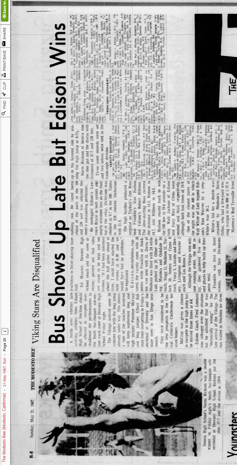 Licensed to Bella Vista High School Hy-Tek's Meet Manager Sac-Joaquin South Sub-Section Finals - 5/19/1967 Downey High School Results Boys 100 Yard Dash Varsity ============================================================================ Name Year School Finals Wind Points ============================================================================ 1 Dickerson, Sam 12 Franklin 9.7 2 Brice, Lawrence 12 Edison 9.9 3 Cannizzaro, Frank 12 Grace Davis 10.2 4 Scott, Darryl 12 Edison 10.3 5 Williams, Matt 12 Atwater 10.4 Boys 220 Yard Dash Varsity ============================================================================ Name Year School Finals Wind Points ============================================================================ 1 Dickerson, Sam 12 Franklin 21.9 2 Brice, Lawrence 12 Edison (S) 22.1 3 Rieger, Ron 11 Oakdale 22.3 4 Scott, Darryl 12 Edison 22.5 5 Cannizzaro, Frank 12 Grace Davis 22.7 Boys 440 Yard Dash Varsity ======================================================================= Name Year School Finals Points ======================================================================= 1 White, John 12 Lodi 50.2 2 Weaver, Ken 12 Edison 50.3 3 Stewart, Roger 11 Oakdale 51.3 4 Morgan, X 12 Edison 51.9 5 Carlson, Don 11 Downey 52.3 Boys 880 Yard Run Varsity ======================================================================= Name Year School Finals Points ======================================================================= 1 Dillon, Dan 11 Modesto 1:57.4 2 White, Walt 12 Lodi 1:58.0 3 Howen, Rick 12 Lodi 2:00.0 4 Bates, Terry 12 Oakdale 2:00.5 5 Cervantes, Robert 11 Los Banos 2:02.1 Boys 1 Mile Run Varsity ======================================================================= Name Year School Finals Points ======================================================================= 1 Kirshenman, Al 12 Lodi 4:23.8 2 Stringham, Kent 12 Lodi 4:25.7 3 Griggs, Randy 12 Modesto 4:28.4 4 Hastings, Wendell 12 Oakdale 4:30.2 5 Carmona, Joe 12 Tracy 4:32.8 Boys 2 Mile Run Varsity ======================================================================= Name Year School Finals Points ======================================================================= 1 Lawson, Jack 11 Grace Davis 9:45.0 2 Valencia, Frank 11 Edison (S) 9:59.5 3 Cosner, Steve 10 Oakdale 10:06.2 4 Bambico, BoBo 12 Manteca 10:07.2 5 Myler, Mike 11 Oakdale 10:08.7 Boys 120 Yard Hurdles Varsity ============================================================================ Name Year School Finals Wind Points ============================================================================ 1 Ross, Jim 12 Turlock 14.5 2 Hudson, Stan 12 Franklin 14.7 3 Hillman, Robert 11 Edison 15.1 4 Folly, John 12 Turlock 15.1 5 Jamison, Rick 12 Grace Davis 15.2 Boys 180 Yard Hurdles Varsity ======================================================================= Name Year School Finals Points ======================================================================= 1 Hudson, Stan 12 Franklin 19.6 2 Jackson, Walter 12 Edison 19.9 3 Rice, Gary 11 Ceres 19.9 4 Alcordo, Tony 12 Livingston 20.2 5 Dread, Otha 12 Edison 21.2 Boys 4x220 Yard Relay Varsity ======================================================================= School Finals Points ======================================================================= 1 Edison 1:29.6 2 Franklin 1:30.0 3 Manteca 1:32.2 4 Modesto 1:32.7 5 Stagg 1:33.1 Boys 4x440 Yard Relay Varsity ======================================================================= School Finals Points ======================================================================= Boys High Jump Varsity ======================================================================= Name Year School Finals Points ======================================================================= 1 Travaille, Bud 11 Manteca 6-03.75 2 Belcher, Tim 12 Grace Davis 6-02.00 3 Dukes, Alvin 11 Franklin 6-02.00 4 Marleau, Tony 12 Manteca 6-00.00 5 Jamison, Rick 12 Grace Davis 6-00.00 Boys Pole Vault Varsity ======================================================================= Name Year School Finals Points ======================================================================= 1 Holloway, Cecil 12 Grace Davis 13-00.00 2 Mandic, James 12 Stagg 12-06.00 3 Rice, Gary 11 Ceres 12-06.00 4 Bush, Harry 11 Franklin 12-06.00 5 Brennan, Tom 12 Oakdale 12-00.00 Boys Long Jump Varsity ============================================================================ Name Year School Finals Wind Points ============================================================================ 1 Vomocil, Boyd 11 Stagg 22-06.50 2 Harris, Kirk 12 Livingston 22-04.50 3 Montanio, Melvin 12 Manteca 22-03.25 4 Champion, Darrel 12 Grace Davis 21-05.25 5 Olbrycht, Lincoln 12 Oakdale 21-04.50 Boys Triple Jump Varsity ============================================================================ Name Year School Finals Wind Points ============================================================================ 1 Augustine, Sam 11 Modesto 44-03.00 2 Ridgeway, Roy 11 Grace Davis 43-07.50 3 Vomocil, Boyd 11 Stagg 42-05.50 4 Fender, Bob 12 Stagg 41-04.00 5 Jackson, Robert 10 Ceres 39-01.50 Boys Shot Put Varsity ======================================================================= Name Year School Finals Points ======================================================================= 1 Rickson, Norm 12 Sonora 57-07.00 2 Spangler, Greg 12 Tracy 55-07.00 3 Rideout, Tom 12 Downey 53-09.00 4 Sivils, Joe 11 Turlock 50-08.00 5 Anderson, Harry 11 Atwater 50-05.00 Boys Discus Throw Varsity ======================================================================= Name Year School Finals Points ======================================================================= 1 Rickson, Norm 12 Sonora 139-00 2 Hillman, Ken 12 Stagg 134-03 3 Huber, Walt 11 Stagg 129-10 4 Anderson, Harry 11 Atwater 122-11 5 Fujimoto, David 11 Tracy 115-10
