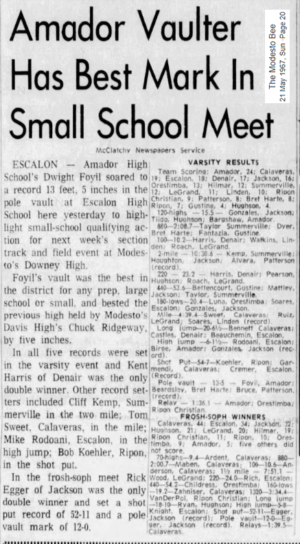 Licensed to Bella Vista High School Hy-Tek's Meet Manager Sac-Joaquin Sub-Section Small School Meet 5/20/1967 Escalon High School Results Boys 100 Yard Dash Varsity ============================================================================ Name Year School Finals Wind Points ============================================================================ 1 Harris, Kent 12 Denair 10.2 Boys 220 Yard Dash Varsity ============================================================================ Name Year School Finals Wind Points ============================================================================ 1 Harris, Kent 12 Denair 23.2 Boys 440 Yard Dash Varsity ======================================================================= Name Year School Finals Points ======================================================================= 1 Bettencourt, John 11 Gustine 53.6 Boys 880 Yard Run Varsity ======================================================================= Name Year School Finals Points ======================================================================= 1 Taylor, Paul 12 Summerville 2:08.7 Boys 1 Mile Run Varsity ======================================================================= Name Year School Finals Points ======================================================================= 1 Sweet, Tom 12 Calaveras 4:39.4 Boys 2 Mile Run Varsity ======================================================================= Name Year School Finals Points ======================================================================= 1 Kemp, Cliff 12 Summerville 10:30.6 Boys 120 Yard Hurdles Varsity ============================================================================ Name Year School Finals Wind Points ============================================================================ 1 Gonzales, Ed 12 Jackson 15.5 Boys 180 Yard Hurdles Varsity ======================================================================= Name Year School Finals Points ======================================================================= 1 Luna, Tony 12 Orestimba 20.4 Boys 4x220 Yard Relay Varsity ======================================================================= School Finals Points ======================================================================= 1 Amador 1:36.1 Boys 4x440 Yard Relay Varsity ======================================================================= School Finals Points ======================================================================= Boys High Jump Varsity ======================================================================= Name Year School Finals Points ======================================================================= 1 Rodoani, Mike 12 Escalon 6-01.50 Boys Pole Vault Varsity ======================================================================= Name Year School Finals Points ======================================================================= 1 Foyil, Dwight 12 Amador 13-05.00 Boys Long Jump Varsity ============================================================================ Name Year School Finals Wind Points ============================================================================ 1 Bennett, Terry 12 Calaveras 20-06.50 Boys Triple Jump Varsity ============================================================================ Name Year School Finals Wind Points ============================================================================ Boys Shot Put Varsity ======================================================================= Name Year School Finals Points ======================================================================= 1 Koehler, Bob 12 Ripon 54-07.00 Boys Discus Throw Varsity ======================================================================= Name Year School Finals Points =======================================================================