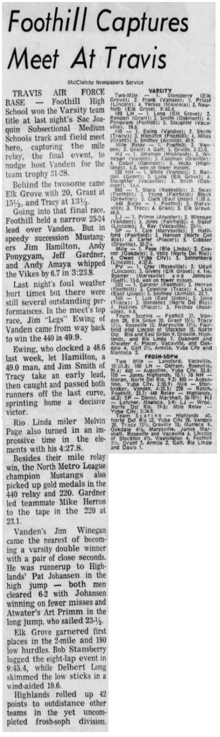 Licensed to Bella Vista High School Hy-Tek's Meet Manager Sac-Joaquin Sub-Section Medium School Meet 5/23/1969 Vanden High School Results Boys 100 Yard Dash Varsity ============================================================================ Name Year School Finals Wind Points ============================================================================ 1 Luis, Manuel 12 East Union 9.8 Boys 220 Yard Dash Varsity ============================================================================ Name Year School Finals Wind Points ============================================================================ 1 Gardner, Jeff 12 Foothill 23.1 Boys 440 Yard Dash Varsity ======================================================================= Name Year School Finals Points ======================================================================= 1 Ewing, Jim 12 Vanden 49.9 Boys 880 Yard Run Varsity ======================================================================= Name Year School Finals Points ======================================================================= 1 Sharp, Terry 12 Roseville 1:58.6 Boys 1 Mile Run Varsity ======================================================================= Name Year School Finals Points ======================================================================= 1 Paige, Mel 12 Rio Linda 4:27.8 Boys 2 Mile Run Varsity ======================================================================= Name Year School Finals Points ======================================================================= 1 Stansberry, Mike 12 Elk Grove 9:45.4 Boys 120 Yard Hurdles Varsity ============================================================================ Name Year School Finals Wind Points ============================================================================ 1 White, Charlie 12 Vanden 14.4 Boys 180 Yard Hurdles Varsity ======================================================================= Name Year School Finals Points ======================================================================= 1 Long, Tom 12 Elk Grove 19.6 Boys 4x110 Yard Relay Varsity ======================================================================= School Finals Points ======================================================================= 1 Foothill 44.0 Boys 4x440 Yard Relay Varsity ======================================================================= School Finals Points ======================================================================= 1 Foothill 3:23.8 Boys High Jump Varsity ======================================================================= Name Year School Finals Points ======================================================================= 1 Johanson, Pat 12 Highlands 6-02.00 Boys Pole Vault Varsity ======================================================================= Name Year School Finals Points ======================================================================= 1 Cray, Bob 12 Roseville 13-00.00 Boys Long Jump Varsity ============================================================================ Name Year School Finals Wind Points ============================================================================ 1 Primm, Art 12 Atwater 23-00.50 Boys Triple Jump Varsity ============================================================================ Name Year School Finals Wind Points ============================================================================ Boys Shot Put Varsity ======================================================================= Name Year School Finals Points ======================================================================= 1 Caine, Vaughn 12 Marysville 55-02.25 Boys Discus Throw Varsity ======================================================================= Name Year School Finals Points =======================================================================