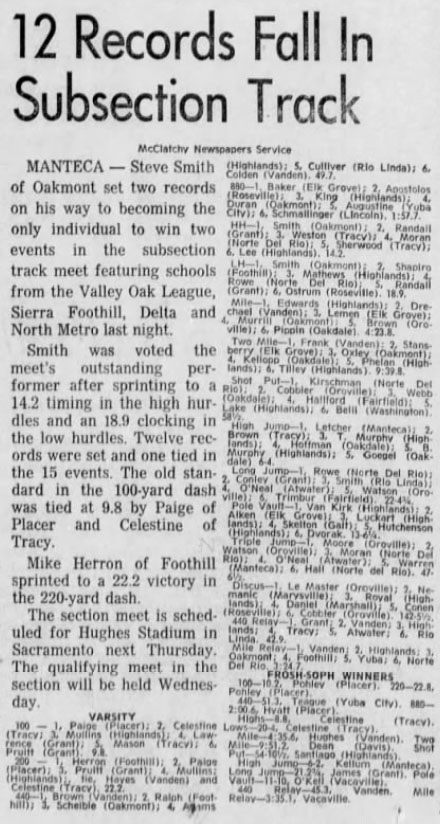 Licensed to Bella Vista High School Hy-Tek's Meet Manager Sac-Joaquin Sub-Section I (Medium School) Meet 5/23/1970 Modesto JC Results Boys 100 Yard Dash Varsity ============================================================================ Name Year School Finals Wind Points ============================================================================ 1 Paige, Willie 10 Placer 9.8 Boys 220 Yard Dash Varsity ============================================================================ Name Year School Finals Wind Points ============================================================================ 1 Herron, Mike 12 Foothill 22.1 Boys 440 Yard Dash Varsity ======================================================================= Name Year School Finals Points ======================================================================= 1 Brown, Will 12 Vanden 49.7 Boys 880 Yard Run Varsity ======================================================================= Name Year School Finals Points ======================================================================= 1 Baker, Gary 12 Elk Grove 1:57.7 Boys 1 Mile Run Varsity ======================================================================= Name Year School Finals Points ======================================================================= 1 Edwards, Gary 10 Highlands 4:23.8 Boys 2 Mile Run Varsity ======================================================================= Name Year School Finals Points ======================================================================= 1 Howard, Frank 12 Vanden 9:39.8 Boys 120 Yard Hurdles Varsity ============================================================================ Name Year School Finals Wind Points ============================================================================ 1 Smith, Steve 12 Oakmont 14.2 Boys 180 Yard Hurdles Varsity ======================================================================= Name Year School Finals Points ======================================================================= 1 Smith, Steve 12 Oakmont 18.9 Boys 4x110 Yard Relay Varsity ======================================================================= School Finals Points ======================================================================= 1 Grant 42.9 Boys 4x440 Yard Relay Varsity ======================================================================= School Finals Points ======================================================================= 1 Vanden 3:24.7 Boys High Jump Varsity ======================================================================= Name Year School Finals Points ======================================================================= 1 Letcher, Dennis 12 Manteca 6-04.00 Boys Pole Vault Varsity ======================================================================= Name Year School Finals Points ======================================================================= 1 Van Kirk, Jack 12 Highlands 13-06.25 Boys Long Jump Varsity ============================================================================ Name Year School Finals Wind Points ============================================================================ 1 Wroe, Bill 12 Norte Del Rio 22-04.75 Boys Triple Jump Varsity ============================================================================ Name Year School Finals Wind Points ============================================================================ 1 Moore, Kevin 12 Oroville 47-06.50 Boys Shot Put Varsity ======================================================================= Name Year School Finals Points ======================================================================= 1 Kirschenman, Ken 12 Norte Del Rio 58-00.50 Boys Discus Throw Varsity ======================================================================= Name Year School Finals Points ======================================================================= 1 LeMaster, Mark 12 Oroville 142-05