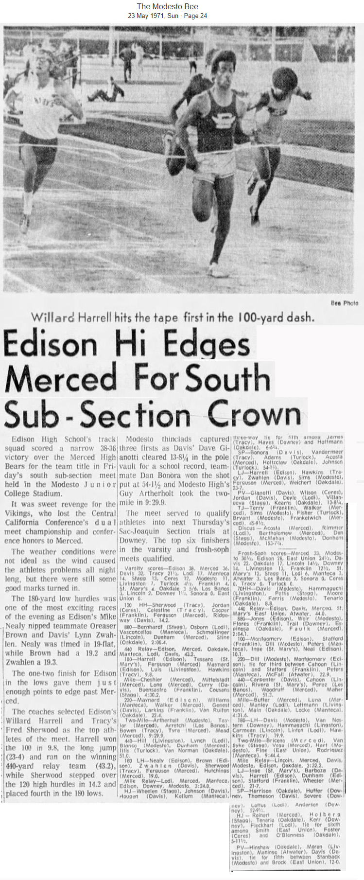 Licensed to Bella Vista High School Hy-Tek's Meet Manager Sac-Joaquin Sub-Section I Meet 5/22/1971 Modesto JC Results Boys 100 Yard Dash Varsity ============================================================================ Name Year School Finals Wind Points ============================================================================ 1 Harrell, Willard 12 Edison 9.8 Boys 220 Yard Dash Varsity ============================================================================ Name Year School Finals Wind Points ============================================================================ 1 Maynard, Leon 12 Edison 22.4 Boys 440 Yard Dash Varsity ======================================================================= Name Year School Finals Points ======================================================================= 1 Hill, Randy 11 Livingston 51.0 Boys 880 Yard Run Varsity ======================================================================= Name Year School Finals Points ======================================================================= 1 Bernhardt, Ron 11 Stagg 2:00.4 Boys 1 Mile Run Varsity ======================================================================= Name Year School Finals Points ======================================================================= 1 Cheshier, Mike 12 Merced 4:30.2 Boys 2 Mile Run Varsity ======================================================================= Name Year School Finals Points ======================================================================= 1 Arthurholt, Guy 12 Modesto 9:29.9 Boys 120 Yard Hurdles Varsity ============================================================================ Name Year School Finals Wind Points ============================================================================ 1 Sherwood, Fred 12 Tracy 14.2 Boys 180 Yard Hurdles Varsity ======================================================================= Name Year School Finals Points ======================================================================= 1 Nealy, Michael 11 Edison 19.0 Boys 4x110 Yard Relay Varsity ======================================================================= School Finals Points ======================================================================= 1 Edison 43.2 Boys 4x440 Yard Relay Varsity ======================================================================= School Finals Points ======================================================================= 1 Lodi 3:24.0 Boys High Jump Varsity ======================================================================= Name Year School Finals Points ======================================================================= 1 Wheelen, Mike 12 Stagg 6-06.75 Boys Pole Vault Varsity ======================================================================= Name Year School Finals Points ======================================================================= 1 Gianotti, Dave 12 Grace Davis 13-08.25 Boys Long Jump Varsity ============================================================================ Name Year School Finals Wind Points ============================================================================ 1 Harrell, Willard 12 Edison 23-07.00 Boys Triple Jump Varsity ============================================================================ Name Year School Finals Wind Points ============================================================================ 1 Terry, Anthony 12 Franklin 45-09.50 Boys Shot Put Varsity ======================================================================= Name Year School Finals Points ======================================================================= 1 Bonora, Dan 12 Grace Davis 54-01.50 Boys Discus Throw Varsity ======================================================================= Name Year School Finals Points ======================================================================= 1 Acosta, Ben 12 Merced 153-07