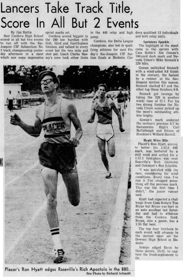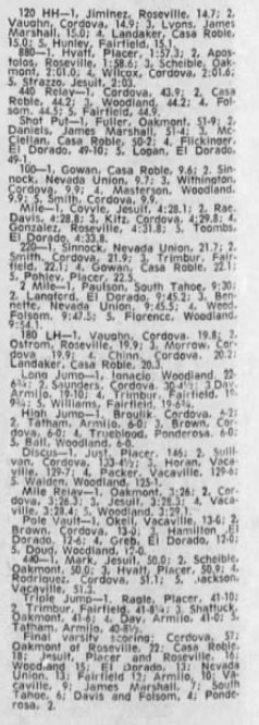 Licensed to Bella Vista High School Hy-Tek's Meet Manager Sac-Joaquin Sub-Section III Meet 5/21/1971 Cordova High School Results Boys 100 Yard Dash Varsity ============================================================================ Name Year School Finals Wind Points ============================================================================ 1 Gowan, Jim 12 Casa Roble 9.6 NWI 2 Sinnock, Mike 12 Nevada Union 9.7 NWI 3 Withington, Brad 12 Cordova 9.9 NWI 4 Masterson, Chuck 12 Woodland 9.9 NWI 5 Smith, Darrell 10 Cordova 9.9 NWI Boys 220 Yard Dash Varsity ============================================================================ Name Year School Finals Wind Points ============================================================================ 1 Sinnock, Mike 12 Nevada Union 21.9 NWI 2 Smith, Darrell 10 Cordova 21.9 NWI 3 Trimbur, John 12 Fairfield 22.1 NWI 4 Gowan, Jim 12 Casa Roble 22.1 NWI 5 Pohley, Jay 10 Placer 22.5 NWI Boys 440 Yard Dash Varsity ======================================================================= Name Year School Finals Points ======================================================================= 1 Mark, Bob 12 Jesuit 50.0 2 Scheible, Ben 12 Oakmont 50.0 3 Hyatt, Ron 11 Placer 50.9 4 Rodriguez, Rod 11 Cordova 51.1 5 Jackson, Robert 11 Vacaville 51.3 Boys 880 Yard Run Varsity ======================================================================= Name Year School Finals Points ======================================================================= 1 Hyatt, Ron 11 Placer 1:57.3 2 Apostolos, Rick 12 Roseville 1:58.6 3 Scheible, Ben 12 Oakmont 2:01.0 4 Wilcox, Bob 12 Cordova 2:01.6 5 Strazzo, Tim 11 Jesuit 2:03.0 Boys 1 Mile Run Varsity ======================================================================= Name Year School Finals Points ======================================================================= 1 Coyle, Tim 12 Jesuit 4:28.1 2 Rae, Eric 12 Davis 4:28.8 3 Kitz, Ken 10 Cordova 4:29.8 4 Gonzalez, Santiago 11 Roseville 4:31.8 5 Toombs, Mike 12 El Dorado 4:33.8 Boys 2 Mile Run Varsity ======================================================================= Name Year School Finals Points ======================================================================= 1 Paulson, Guy 12 South Tahoe 9:30.0 2 Langford, Rich 12 El Dorado 9:45.2 3 Bennette, Bob 12 Nevada Union 9:45.5 4 Weed, John 12 Folsom 9:47.5 5 Flores, Pete 12 Woodland 9:54.1 Boys 120 Yard Hurdles Varsity ============================================================================ Name Year School Finals Wind Points ============================================================================ 1 Jiminez, Joe 12 Roseville 14.7 NWI 2 Vaughn, Jim 12 Cordova 14.9 NWI 3 Lyons, Marty 12 James Marshall 15.0 NWI 4 Landaker, David 12 Casa Roble 15.0 NWI 5 Hunley, Grayson 12 Fairfield 15.1 NWI Boys 180 Yard Hurdles Varsity ======================================================================= Name Year School Finals Points ======================================================================= 1 Vaughn, Jim 12 Cordova 19.8 2 Ostrom, Sig 12 Roseville 19.9 3 Morrow, Dave 12 Cordova 19.9 4 Chinn, Jeff 12 Cordova 20.2 5 Landaker, David 12 Casa Roble 20.3 Boys 4x110 Yard Relay Varsity ======================================================================= School Finals Points ======================================================================= 1 Cordova 43.9 2 Casa Roble 44.2 3 Woodland 44.2 4 Folsom 44.5 5 Fairfield 44.9 Boys 4x440 Yard Relay Varsity ======================================================================= School Finals Points ======================================================================= 1 Oakmont 3:26.0 2 Cordova 3:26.3 3 Jesuit 3:28.3 4 Vacaville 3:28.4 5 Woodland 3:29.1 Boys High Jump Varsity ======================================================================= Name Year School Finals Points ======================================================================= 1 Broulik, Ron 11 Cordova 6-02.00 2 Tatham, Chris 11 Armijo 6-00.00 3 Brown, Jim 12 Cordova 6-00.00 4 Trueblood, Kit 12 Ponderosa 6-00.00 5 Ball, Gary 11 Woodland 6-00.00 Boys Pole Vault Varsity ======================================================================= Name Year School Finals Points ======================================================================= 1 Okell, Jack 11 Vacaville 13-00.00 2 Brown, Jim 12 Cordova 13-00.00 3 Hamilton, Bruce 12 El Dorado 12-06.00 4 Greb, George 12 El Dorado 12-00.00 5 Doud, Tom 11 Woodland 12-00.00 Boys Long Jump Varsity ============================================================================ Name Year School Finals Wind Points ============================================================================ 1 Ignacio, Steve 12 Woodland 22-06.75 NWI 2 Saunders, Gary 11 Cordova 20-04.50 NWI 3 Day, Greg 12 Armijo 19-10.00 NWI 4 Trimbur, John 12 Fairfield 19-09.75 NWI 5 Williams, Cliff 12 Fairfield 19-06.75 NWI Boys Triple Jump Varsity ============================================================================ Name Year School Finals Wind Points ============================================================================ 1 Reome, Rick 12 Placer 41-10.00 NWI 2 Trimbur, John 12 Fairfield 41-08.25 NWI 3 Shattuck, John 11 Oakmont 41-06.00 NWI 4 Day, Greg 12 Armijo 41-00.00 NWI 5 Tatham, Chris 11 Armijo 40-08.50 NWI Boys Shot Put Varsity ======================================================================= Name Year School Finals Points ======================================================================= 1 Fuller, Rich 12 Oakmont 51-08.00 2 Daniels, Ray 12 James Marshall 51-04.00 3 McClellan, Randy 12 Casa Roble 50-02.00 4 Flickinger, Ken 11 El Dorado 49-10.00 5 Logan, Mike 12 El Dorado 49-01.00 Boys Discus Throw Varsity ======================================================================= Name Year School Finals Points ======================================================================= 1 Just, Al 10 Placer 146-00 2 Sullivan, Gary 11 Cordova 133-04 3 Horan, Mike 12 Vacaville 129-07 4