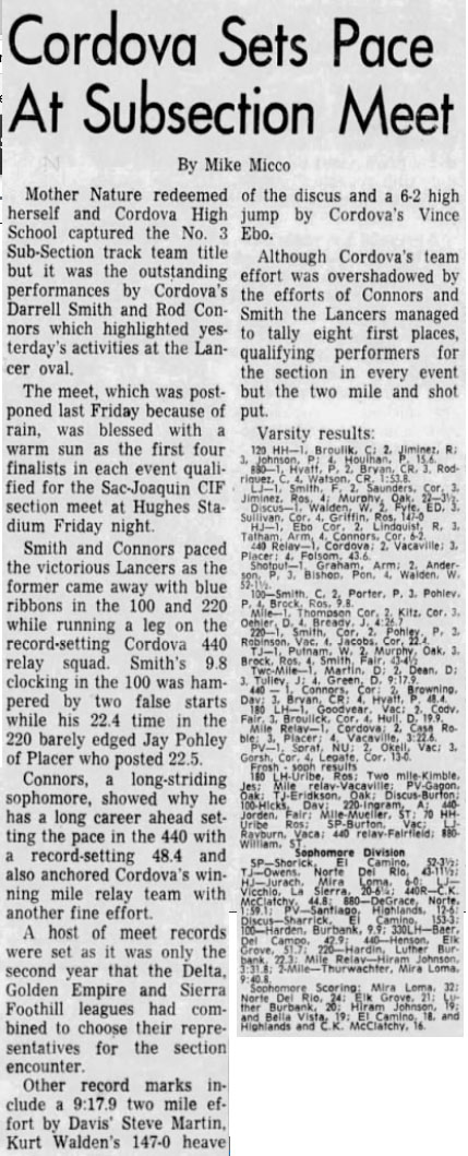 Licensed to Bella Vista High School Hy-Tek's Meet Manager Sac-Joaquin Sub-Section III Meet 5/22/1972 Cordova High School Results Boys 100 Yard Dash Varsity ============================================================================ Name Year School Finals Wind Points ============================================================================ 1 Smith, Darrell 11 Cordova 9.8 NWI 2 Porter, Carlos 11 Placer NT NWI 3 Pohley, Jay 11 Placer NT NWI 4 Brock, Steve 12 Roseville NT NWI Boys 220 Yard Dash Varsity ============================================================================ Name Year School Finals Wind Points ============================================================================ 1 Smith, Darrell 11 Cordova 22.4 NWI 2 Pohley, Jay 11 Placer NT NWI 3 Robinson, Dwayne 12 Vacaville NT NWI 4 Jacobs, John 12 Cordova NT NWI Boys 440 Yard Dash Varsity ======================================================================= Name Year School Finals Points ======================================================================= 1 Connors, Rod 10 Cordova 48.4 2 Browning, Glen 12 Davis NT 3 Bryan, Tim 12 Casa Roble NT 4 Hyatt, Ron 12 Placer NT Boys 880 Yard Run Varsity ======================================================================= Name Year School Finals Points ======================================================================= 1 Hyatt, Ron 12 Placer 1:53.8 2 Bryan, Tim 12 Casa Roble NT 3 Rodriguez, Rod 12 Cordova NT 4 Watson, Donald 12 Casa Roble NT Boys 1 Mile Run Varsity ======================================================================= Name Year School Finals Points ======================================================================= 1 Thompson, Dan 11 Cordova 4:26.7 2 Kitz, Ken 11 Cordova NT 3 Oehler, Robin 11 Davis NT 4 Bredy, Jim 12 Jesuit NT Boys 2 Mile Run Varsity ======================================================================= Name Year School Finals Points ======================================================================= 1 Martin, Steve 11 Davis 9:17.9 2 Dean, Martin 12 Davis NT 3 Tulley, Mike 12 Jesuit NT 4 Green, Gary 11 Davis NT Boys 120 Yard Hurdles Varsity ============================================================================ Name Year School Finals Wind Points ============================================================================ 1 Broulik, Ron 12 Cordova 15.6 NWI 2 Jiminez, Joe 12 Roseville NT NWI 3 Johnson, Bill 12 Placer NT NWI 4 Houlihan, Mike 11 Ponderosa NT NWI Boys 180 Yard Hurdles Varsity ======================================================================= Name Year School Finals Points ======================================================================= 1 Goodyear, Rickie 12 Vacaville 19.7 2 Cody, X 12 Fairfield NT 3 Broulik, Ron 12 Cordova NT 4 Hull, John 11 Davis NT Boys 4x110 Yard Relay Varsity ======================================================================= School Finals Points ======================================================================= 1 Cordova 43.2 2 Vacaville NT 3 Placer NT 4 Folsom NT Boys 4x440 Yard Relay Varsity ======================================================================= School Finals Points ======================================================================= 1 Cordova 3:22.6 2 Casa Roble NT 3 Placer NT 4 Vacaville NT Boys High Jump Varsity ======================================================================= Name Year School Finals Points ======================================================================= 1 Ebo, Vince 12 Cordova 6-02.00 2 Lindquist, Gary 12 Roseville NH 3 Tatham, Chris 12 Armijo NH 4 Connors, Rod 10 Cordova NH Boys Pole Vault Varsity ======================================================================= Name Year School Finals Points ======================================================================= 1 Spratt, Unknown 12 Nevada Union 13-00.00 2 Okell, Jack 12 Vacaville NH 3 Gorsch, Richard 12 Cordova NH 4 Legate, Jim 12 Cordova NH Boys Long Jump Varsity ============================================================================ Name Year School Finals Wind Points ============================================================================ 1 Smith, David 12 Fairfield 22-03.50 NWI 2 Saunders, Gary 12 Cordova ND NWI 3 Jiminez, Joe 12 Roseville ND NWI 4 Murphy, Eric 12 Oakmont ND NWI Boys Triple Jump Varsity ============================================================================ Name Year School Finals Wind Points ============================================================================ 1 Putman, Randy 11 Woodland 43-04.50 NWI 2 Murphy, Eric 12 Oakmont ND NWI 3 Brock, Steve 12 Roseville ND NWI 4 Smith, David 12 Fairfield ND NWI Boys Shot Put Varsity ======================================================================= Name Year School Finals Points ======================================================================= 1 Graham, Richard 11 Armijo 52-01.50 2 Anderson, Gary 11 Placer ND 3 Bishop, Ken 12 Ponderosa ND 4 Walden, Kurt 12 Woodland ND Boys Discus Throw Varsity ======================================================================= Name Year School Finals Points ======================================================================= 1 Walden, Kurt 12 Woodland 147-00 2 Fyfe, Jim 11 El Dorado ND 3 Sullivan, Gary 12 Cordova ND 4 Griffin, Gary 12 Roseville ND