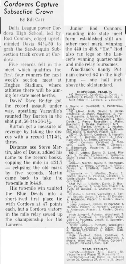 Licensed to Bella Vista High School Hy-Tek's Meet Manager Sac-Joaquin Sub-Section III Meet 5/18/1973 Cordova High School Results Boys 100 Yard Dash Varsity ============================================================================ Name Year School Finals Wind Points ============================================================================ 1 Ingram, Lepoleon 11 Armijo 10.0 NWI 2 Heaton, Paul 12 Jesuit NT NWI 3 Dawkins, Fred 12 Cordova NT NWI 4 Stevenson, Mike 11 Davis NT NWI 5 Hughes, Brian 11 Placer NT NWI Boys 220 Yard Dash Varsity ============================================================================ Name Year School Finals Wind Points ============================================================================ 1 Smith, Darrell 12 Cordova 22.1 NWI 2 Ingram, Lepoleon 11 Armijo NT NWI 3 Heaton, Paul 12 Jesuit NT NWI 4 Hoey, Mike 11 Fairfield NT NWI 5 Smith, Gerald 12 Cordova NT NWI Boys 440 Yard Dash Varsity ======================================================================= Name Year School Finals Points ======================================================================= 1 Connors, Rod 11 Cordova 48.8 2 Monseth, Rick 11 Galt NT 3 Smith, Darrell 12 Cordova NT 4 Edmondson, Drew 12 Vacaville NT 5 Jordan, J 11 Fairfield NT Boys 880 Yard Run Varsity ======================================================================= Name Year School Finals Points ======================================================================= 1 Lopez, Dave 12 Davis 1:57.4 2 Land, Rick 12 Placer NT 3 Yriate, John 12 Cordova NT 4 Williams, Tom 11 South Tahoe NT 5 Archaleta, X 11 Cordova NT Boys 1 Mile Run Varsity ======================================================================= Name Year School Finals Points ======================================================================= 1 Martin, Steve 12 Davis 4:21.7 2 Thompson, Dan 12 Cordova NT 3 Ringo, Loren 12 Cordova NT 4 Miller, X 12 Davis NT 5 Empfield, Dan 12 South Tahoe NT Boys 2 Mile Run Varsity ======================================================================= Name Year School Finals Points ======================================================================= 1 Martin, Steve 12 Davis 9:44.3 2 Green, Gary 12 Davis NT 3 Valuska, George 12 Cordova NT 4 White, Jim 11 South Tahoe NT 5 Sweeny, Phil 11 Placer NT Boys 120 Yard Hurdles Varsity ============================================================================ Name Year School Finals Wind Points ============================================================================ 1 Uribe, Mark 11 Roseville 14.9 NWI 2 Hull, John 12 Davis NT NWI 3 Perry, Rocky 11 Roseville NT NWI 4 Malm, Gorden 12 Oakmont NT NWI 5 Drake, Ron 12 Fairfield NT NWI Boys 180 Yard Hurdles Varsity ======================================================================= Name Year School Finals Points ======================================================================= 1 Hull, John 12 Davis 19.7 2 Uribe, Mark 11 Roseville NT 3 Mann, Ed 11 Vacaville NT 4 Perry, Rocky 11 Roseville NT 5 Malm, Gorden 12 Oakmont NT Boys 4x110 Yard Relay Varsity ======================================================================= School Finals Points ======================================================================= 1 Cordova 43.2 2 Davis NT 3 Fairfield NT 4 Placer NT 5 Vacaville NT Boys 4x440 Yard Relay Varsity ======================================================================= School Finals Points ======================================================================= 1 Cordova 3:24.8 2 Vacaville NT 3 Davis NT 4 Oakmont NT 5 Ponderosa NT Boys High Jump Varsity ======================================================================= Name Year School Finals Points ======================================================================= 1 Putman, Randy 12 Woodland 6-03.00 2 Rozier, Bob 11 Cordova NH 3 Forsythe, Tom 12 Vacaville NH 4 Palumbo, Tony 12 Jesuit NH 5 Spangler, Pat 12 Oakmont NH Boys Pole Vault Varsity ======================================================================= Name Year School Finals Points ======================================================================= 1 Berg, Steve 12 Cordova 13-00.00 2 Brown, Steve 12 Galt NH 3 Gagon, Bruce 11 Oakmont NH 4 Moote, Paul 12 Woodland NH 5 Phipps, Lawrence 12 Cordova NH Boys Long Jump Varsity ============================================================================ Name Year School Finals Wind Points ============================================================================ 1 Jobson, Steve 12 El Dorado 21-09.00 NWI 2 Hardey, Jim 12 Placer ND NWI 3 Harbert, David 12 Cordova ND NWI 4 Anderson, Gary 12 Placer ND NWI 5 Reefer, X 12 Davis ND NWI Boys Triple Jump Varsity ============================================================================ Name Year School Finals Wind Points ============================================================================ 1 Putman, Randy 12 Woodland 44-00.00 NWI Boys Shot Put Varsity ======================================================================= Name Year School Finals Points ======================================================================= 1 Reifer, Dave 12 Davis 56-03.00 2 Burton, Ray 11 Vacaville ND 3 Anderson, Gary 12 Placer ND 4 Fyfe, Jim 12 El Dorado ND 5 Graham, Richard 12 Armijo ND Boys Discus Throw Varsity ======================================================================= Name Year School Finals Points ======================================================================= 1 Burton, Ray 11 Vacaville 171-05 2 Taylor, Brett 11 Nevada Union ND 3 Fyfe, Jim 12 El Dorado ND 4 Anderson, Gary 12 Placer ND 5 Reifer, Dave 12 Davis ND