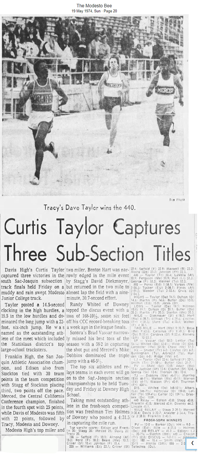 Licensed to Bella Vista High School Hy-Tek's Meet Manager Sac-Joaquin Sub-Section I Meet 5/17/1974 Modesto Junior College Results Boys 100 Yard Dash Varsity ============================================================================ Name Year School Finals Wind Points ============================================================================ 1 Saffold, Tim 12 Franklin 10.0 2 Almond, Dwight 12 Atwater 10.2 3 Ford, X 12 Franklin 10.2 4 Beale, Tim 12 Merced 10.2 5 Criner, Dick 12 Stagg 10.4 6 Johnson, X 12 Franklin 10.4 Boys 220 Yard Dash Varsity ============================================================================ Name Year School Finals Wind Points ============================================================================ 1 Williams, Phillip 11 Edison 22.7 2 Criner, Dick 12 Stagg 22.9 3 Saffold, Tim 12 Franklin 22.9 4 Maxwell, Pat 11 Beyer 23.2 5 Moore, Craig 12 Grace Davis 23.2 6 Johnson, X 12 Franklin 23.3 Boys 440 Yard Dash Varsity ======================================================================= Name Year School Finals Points ======================================================================= 1 Taylor, David 12 Tracy 50.4 2 LaVelie, Richard 12 Atwater 50.9 3 Ferguson, John 12 Merced 50.9 4 Hall, Clay 11 Lincoln 51.3 5 George, Troy 11 Franklin 52.3 6 Weimer, Michael 11 Turlock 52.3 Boys 880 Yard Run Varsity ======================================================================= Name Year School Finals Points ======================================================================= 1 Perez, Henry 12 Edison 1:58.5 2 Vargas, Lupe 12 Merced 2:00.3 3 Tucker, X 12 East Union 2:00.7 4 Fields, Clyde 12 Atwater 2:01.2 5 Weder, Rick 11 Turlock 2:02.6 6 Orvis, Scott 12 Oakdale 2:04.3 Boys 1 Mile Run Varsity ======================================================================= Name Year School Finals Points ======================================================================= 1 Diehmeyer, Dave 11 Stagg 4:18.2 2 Hart, Benton 12 Modesto 4:20.7 3 Sillivan, David 12 Tracy 4:28.6 4 Casillas, Roger 12 Franklin 4:30.3 5 Starn, Dan 11 Turlock 4:30.4 6 Walker, Stanley 12 Franklin 4:30.5 Boys 2 Mile Run Varsity ======================================================================= Name Year School Finals Points ======================================================================= 1 Hart, Brenton 12 Modesto 9:30.7 2 Bega, Richard 12 Merced 9:43.0 3 Casillas, Roger 12 Franklin 9:49.5 4 Bird, Steve 12 Downey 9:52.4 5 Cordova, Joe 12 Stagg 9:52.4 6 Romero, Pierre 12 St Mary's 10:03.7 Boys 120 Yard Hurdles Varsity ============================================================================ Name Year School Finals Wind Points ============================================================================ 1 Taylor, Curtis 12 Grace Davis 14.5 2 Dutson, Larry 12 Oakdale 14.6 3 Martin, John 12 Franklin 14.6 4 Butler, Dave 12 Downey 15.0 5 Hillman, Benjamin 11 Edison 15.0 Boys 180 Yard Hurdles Varsity ======================================================================= Name Year School Finals Points ======================================================================= 1 Taylor, Curtis 12 Grace Davis 19.5 2 Hillman, Benjamin 11 Edison 19.7 3 Dutson, Larry 12 Oakdale 20.1 4 Butler, Dave 12 Downey 20.2 5 Martin, John 12 Franklin 20.3 6 Slayton, Perry 12 Merced 20.3 Boys 4x110 Yard Relay Varsity ======================================================================= School Finals Points ======================================================================= 1 Edison 43.8 2 Stagg 43.8 3 Franklin 43.8 4 Merced 43.9 5 Downey 44.3 6 Lincoln 45.1 Boys 4x440 Yard Relay Varsity ======================================================================= School Finals Points ======================================================================= 1 Stagg 3:29.5 2 Merced 3:30.6 3 Grace Davis 3:32.7 4 Atwater 3:34.4 5 Tracy 3:38.8 6 Franklin 3:40.5 Boys High Jump Varsity ======================================================================= Name Year School Finals Points ======================================================================= 1 Snyder, Tom 12 Tracy 6-02.00 2 Clayton, Nick 12 Stagg 6-02.00 3 Burningham, Greg 12 Turlock 6-00.00 4 Albrecht, Steve 12 Tokay 6-00.00 5 Harden, Steve 11 Sonora 6-00.00 6 Ridge, Mark 12 Merced 6-00.00 Boys Pole Vault Varsity ======================================================================= Name Year School Finals Points ======================================================================= 1 Stahl, John 12 Sonora 13-00.00 2 Adair, Steve 12 Modesto 12-06.00 3 Jackson, Jeff 12 Atwater 12-06.00 4 Clayton, Nick 12 Stagg 12-06.00 5 Spence, Mike 12 Sonora 12-06.00 6 Thorson, Tom 11 Beyer 12-06.00 Boys Long Jump Varsity ============================================================================ Name Year School Finals Wind Points ============================================================================ 1 Taylor, Curtis 12 Grace Davis 22-06.00 2 Saffold, Tim 12 Franklin 22-01.00 3 Smith, Randy 12 Tracy 21-10.75 4 Butler, Dave 12 Downey 21-07.00 Boys Triple Jump Varsity ============================================================================ Name Year School Finals Wind Points ============================================================================ 1 Dobbins, Mike 11 Merced 46-05.50 2 Morring, Jerry 11 Edison 46-01.50 3 Watson, Lonnie 12 Modesto 45-11.00 4 Warren, Vincent 11 Edison 44-11.00 5 Wasson, Malcolm 12 Franklin 43-09.00 6 Thurmon, X 12 Franklin 43-08.75 Boys Shot Put Varsity ======================================================================= Name Year School Finals Points ======================================================================= 1 Vassar, Brad 11 Sonora 58-02.00 2 Leffler, Duke 12 Tokay 54-00.50 3 Whited, Rick 12 Downey 53-08.50 4 Webb, Sid 12 Oakdale 53-06.00 5 Carpenter, Larry 12 Modesto 52-10.00 6 Chase, Mark 12 Merced 51-03.00 Boys Discus Throw Varsity ======================================================================= Name 