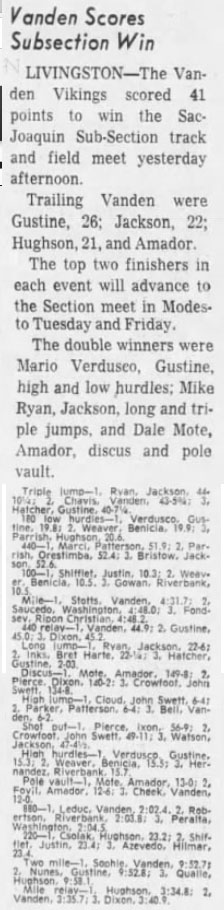 Licensed to Bella Vista High School Hy-Tek's Meet Manager Sac-Joaquin Sub-Section IV (Small Schools) Meet 5/17/1974 Livingston High School Results Boys 100 Yard Dash Varsity ============================================================================ Name Year School Finals Wind Points ============================================================================ 1 Shifflett, Steve 11 Justin Siena 10.3 2 Weaver, Don 12 Benicia 10.5 3 Gowan, X 12 Riverbank 10.5 Boys 220 Yard Dash Varsity ============================================================================ Name Year School Finals Wind Points ============================================================================ 1 Csolak, Ron 12 Hughson 23.2 2 Shifflett, Steve 11 Justin Siena 23.4 3 Azevedo, Cliff 12 Hilmar 23.4 Boys 440 Yard Dash Varsity ======================================================================= Name Year School Finals Points ======================================================================= 1 Marci, John 11 Patterson 51.9 2 Parrish, David 12 Orestimba 52.4 3 Bristow, Paul 11 Jackson 52.6 Boys 880 Yard Run Varsity ======================================================================= Name Year School Finals Points ======================================================================= 1 Leduc, Tony 11 Vanden 2:02.4 2 Robertson, X 12 Riverbank 2:03.8 3 Peralta, Robert 12 Washington 2:04.5 Boys 1 Mile Run Varsity ======================================================================= Name Year School Finals Points ======================================================================= 1 Stotts, Max 12 Vanden 4:31.7 2 Sauceda, Juan 12 Washington 4:48.0 3 Fondse, Kevin 11 Ripon Christian 4:48.2 Boys 2 Mile Run Varsity ======================================================================= Name Year School Finals Points ======================================================================= 1 Sophie, Tim 12 Vanden 9:52.7 2 Nunes, Art 11 Gustine 9:52.8 3 Qualle, Martin 12 Hughson 9:58.1 Boys 120 Yard Hurdles Varsity ============================================================================ Name Year School Finals Wind Points ============================================================================ 1 Verdusco, Mario 12 Gustine 15.3 2 Weaver, Don 12 Benicia 15.5 3 Hernandez, Juan 12 Riverbank 15.7 Boys 180 Yard Hurdles Varsity ======================================================================= Name Year School Finals Points ======================================================================= 1 Verdusco, Mario 12 Gustine 19.8 2 Weaver, Don 12 Benicia 19.9 3 Parrish, X 12 Hughson 20.6 Boys 4x110 Yard Relay Varsity ======================================================================= School Finals Points ======================================================================= 1 Vanden 44.9 2 Gustine 45.0 3 Dixon 45.2 Boys 4x440 Yard Relay Varsity ======================================================================= School Finals Points ======================================================================= 1 Hughson 3:34.8 2 Vanden 3:35.7 3 Dixon 3:40.9 Boys High Jump Varsity ======================================================================= Name Year School Finals Points ======================================================================= 1 Cloud, Ed 12 John Swett 6-04.00 2 Parker, Terry 12 Patterson 6-04.00 3 Bell, Dino 11 Vanden 6-02.00 Boys Pole Vault Varsity ======================================================================= Name Year School Finals Points ======================================================================= 1 Mote, Dale 12 Amador 13-00.00 2 Foyil, Randy 12 Amador 12-06.00 3 Cheek, Dave 12 Vanden 12-00.00 Boys Long Jump Varsity ============================================================================ Name Year School Finals Wind Points ============================================================================ 1 Ryan, Mike 12 Jackson 22-06.00 2 Inks, Richard 11 Bret Harte 22-00.25 3 Hatcher, Jeff 12 Gustine 21-03.00 Boys Triple Jump Varsity ============================================================================ Name Year School Finals Wind Points ============================================================================ 1 Ryan, Mike 12 Jackson 44-10.25 2 Chavis, Walt 12 Vanden 43-05.75 3 Hatcher, Jeff 12 Gustine 40-07.25 Boys Shot Put Varsity ======================================================================= Name Year School Finals Points ======================================================================= 1 Pierce, Russell 12 Dixon 56-09.00 2 Crowfoot, X 12 John Swett 49-11.00 3 Watson, Gary 12 Jackson 47-04.50 Boys Discus Throw Varsity ======================================================================= Name Year School Finals Points ======================================================================= 1 Mote, Dale 12 Amador 149-08 2 Pierce, Russell 12 Dixon 140-02 3 Crowfoot, X 12 John Swett 134-08