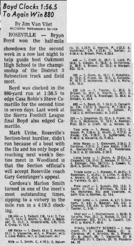 Licensed to Bella Vista High School Hy-Tek's Meet Manager Sac-Joaquin Sub-Section III Meet 5/23/1975 Oakmont High School Results Boys 100 Yard Dash Varsity ============================================================================ Name Year School Finals Wind Points ============================================================================ 1 Dunn, Johnathon 12 Armijo 10.1 NWI 2 Rubatsky, John 11 Davis 10.2 NWI 3 Frank, Tim 12 Woodland 10.2 NWI 4 Kennedy, Randy 11 Placer 10.3 NWI 5 MacKenzie, Bill 11 Vacaville 10.3 NWI 6 Ralls, Jim 12 Casa Roble 10.4 NWI Boys 220 Yard Dash Varsity ============================================================================ Name Year School Finals Wind Points ============================================================================ 1 Singleton, Wendell 11 Davis 22.4 NWI 2 Frank, Tim 12 Woodland 22.5 NWI 3 MacKenzie, Bill 11 Vacaville 22.9 NWI 4 Roemer, David 12 Ponderosa 23.5 NWI 5 Croft, John 11 Oakmont NT NWI 6 Nelson, X 12 Davis NT NWI Boys 440 Yard Dash Varsity ======================================================================= Name Year School Finals Points ======================================================================= 1 Croft, John 11 Oakmont 50.7 2 Lord, Drew 12 Placer 50.8 3 Gibson, Jerry 12 Fairfield 50.8 4 Armstrong, Gregory 12 Armijo 50.9 5 Brown, Mark 12 Oakmont 52.2 6 Morgan, Larry 12 El Dorado 52.4 Boys 880 Yard Run Varsity ======================================================================= Name Year School Finals Points ======================================================================= 1 Boyd, Bryan 12 Oakmont 1:56.5 2 Camarillo, Steve 12 Casa Roble 1:57.3 3 Harris, Dave 12 Placer 1:58.2 4 Sanchez, Tom 12 Marysville 1:58.3 5 Gibson, Jerry 12 Fairfield 1:58.3 6 Williamoski, X 12 Armijo 2:01.0 Boys 1 Mile Run Varsity ======================================================================= Name Year School Finals Points ======================================================================= 1 Smith, Marlon 12 Cordova 4:19.3 2 Navarro, Dan 10 Oakmont 4:22.9 3 Harris, Dave 12 Placer 4:23.5 4 VanArkel, Bob 12 Casa Roble 4:23.8 5 Barton, Terry 11 Jesuit 4:26.4 6 Brown, Mike 11 Ponderosa 4:26.6 Boys 2 Mile Run Varsity ======================================================================= Name Year School Finals Points ======================================================================= 1 Reed, Rod 11 Jesuit 9:27.1 2 Wood, Dean 12 Placer 9:36.4 3 Wulff, Bob 12 Jesuit 9:37.0 4 Rinde, Dennis 11 Casa Roble 9:38.7 5 Sutherland, Gary 12 Cordova 9:40.2 6 Navarro, Dan 10 Oakmont 9:40.3 Boys 120 Yard Hurdles Varsity ============================================================================ Name Year School Finals Wind Points ============================================================================ 1 Talbot, Don 12 Casa Roble 14.6 NWI 2 Taylor, Mel 12 Cordova 14.9 NWI 3 Worth, X 12 Lindhurst 15.0 NWI 4 Roediger, Kent 11 Oakmont 15.2 NWI 5 Hilderbrand, Brian 11 Casa Roble 15.3 NWI 6 Craig, Dave 12 Vacaville 15.4 NWI Boys 330 Yard Hurdles Varsity ======================================================================= Name Year School Finals Points ======================================================================= 1 Taylor, Mel 12 Cordova 39.5 2 Brown, Mark 12 Oakmont 39.7 3 Worth, X 12 Lindhurst 39.7 4 Craig, Dave 12 Vacaville 39.8 5 Roediger, Kent 11 Oakmont 40.4 6 Wilson, X 12 Vacaville 40.8 Boys 4x110 Yard Relay Varsity ======================================================================= School Finals Points ======================================================================= 1 Davis 43.6 2 Armijo 43.7 3 Vacaville 44.5 4 Placer 44.5 5 Casa Roble 44.7 6 Oakmont 44.7 Boys 4x440 Yard Relay Varsity ======================================================================= School Finals Points ======================================================================= 1 Oakmont 3:26.5 2 Cordova 3:27.6 3 Casa Roble 3:29.5 4 Marysville 3:35.4 5 Ponderosa 3:36.2 6 El Dorado 3:38.9 Boys High Jump Varsity ======================================================================= Name Year School Finals Points ======================================================================= 1 Jones, Bill 12 Armijo 6-07.00 2 Graham, Terry 11 Vacaville 6-06.00 3 Beaver, Randy 12 El Dorado 6-02.00 4 Chalecki, Ken 12 Casa Roble 6-00.00 5 Dimes, Keith 11 Vacaville 6-00.00 6 Taylor, Ernie 11 Cordova 5-10.00 Boys Pole Vault Varsity ======================================================================= Name Year School Finals Points ======================================================================= 1 Suzuki, Ken 12 Del Oro 13-00.00 2 Speth, Neil 12 Oakmont 13-00.00 3 Firchua, Tom 11 Roseville 13-00.00 4 Morphew, Joe 12 Nevada Union 12-06.00 4 Valeriote, X 12 Armijo 12-06.00 6 Skelton, Dale 12 Galt 12-06.00 Boys Long Jump Varsity ============================================================================ Name Year School Finals Wind Points ============================================================================ 1 Dunn, Johnathan 12 Armijo 22-02.25 NWI 2 Chalecki, Ken 12 Casa Roble 21-05.00 NWI 3 Nelson, Matt 10 Placer 21-01.50 NWI 4 Ebinger, Scott 12 Ponderosa 20-11.50 NWI 5 Caldwell, John 12 Cordova 20-09.00 NWI 6 Smith, X 12 Ponderosa 20-03.25 NWI Boys Triple Jump Varsity ============================================================================ Name Year School Finals Wind Points ============================================================================ 1 Hassey, Tom 12 Fairfield 46-05.25 NWI 2 Robinson, Tony 11 Cordova 45-03.25 NWI 3 Little, K 11 Fairfield 43-08.50 NWI 4 Myers, Ken 12 Oakmont 42-04.00 NWI 5 Brooks, Vince 12 Jesuit 42-01.25 NWI 6 Yardley, Pat 11 Oakmont 42-01.00 NWI Boys Shot Put Varsity ======================================================================= Name Year School Finals Points ======================================================================= 1 Michelmore, Dave 12 Jesuit 53-10.00 2 Sarette, Dick 11 
