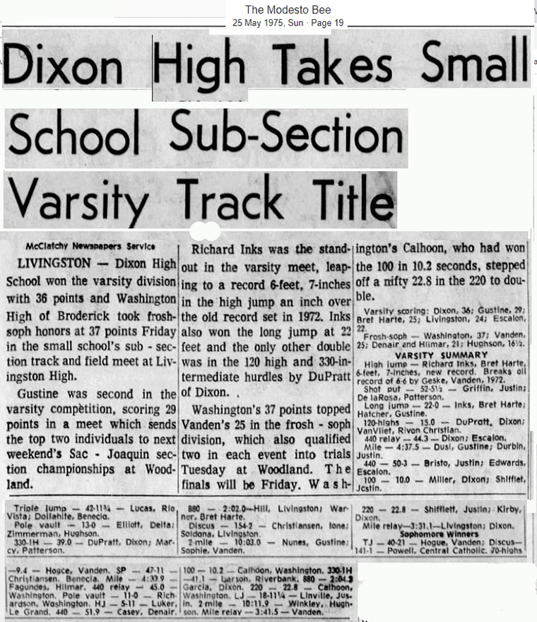 Licensed to Bella Vista High School Hy-Tek's Meet Manager Sac-Joaquin Sub-Section IV (Small Schools) Meet 5/23/1975 Livingston High School Results Boys 100 Yard Dash Varsity ============================================================================ Name Year School Finals Wind Points ============================================================================ 1 Miller, Steven 11 Dixon 10.0 Boys 220 Yard Dash Varsity ============================================================================ Name Year School Finals Wind Points ============================================================================ 1 Shifflett, Steve 12 Justin Siena 22.8 Boys 440 Yard Dash Varsity ======================================================================= Name Year School Finals Points ======================================================================= 1 Bristow, Paul 12 Jackson 50.3 Boys 880 Yard Run Varsity ======================================================================= Name Year School Finals Points ======================================================================= 1 Hill, John 12 Livingston 2:02.0 Boys 1 Mile Run Varsity ======================================================================= Name Year School Finals Points ======================================================================= 1 Dusi, Frank 12 Gustine 4:37.5 Boys 2 Mile Run Varsity ======================================================================= Name Year School Finals Points ======================================================================= 1 Nunes, Art 12 Gustine 10:03.0 Boys 120 Yard Hurdles Varsity ============================================================================ Name Year School Finals Wind Points ============================================================================ 1 DuPratt, Val 12 Dixon 15.0 Boys 330 Yard Hurdles Varsity ======================================================================= Name Year School Finals Points ======================================================================= 1 DuPratt, Val 12 Dixon 39.0 Boys 4x110 Yard Relay Varsity ======================================================================= School Finals Points ======================================================================= 1 Dixon 44.3 Boys 4x440 Yard Relay Varsity ======================================================================= School Finals Points ======================================================================= 1 Livingston 3:31.1 Boys High Jump Varsity ======================================================================= Name Year School Finals Points ======================================================================= 1 Inks, Richard 12 Bret Harte 6-07.00 Boys Pole Vault Varsity ======================================================================= Name Year School Finals Points ======================================================================= 1 Elliott, Dave 12 Delta 13-00.00 Boys Long Jump Varsity ============================================================================ Name Year School Finals Wind Points ============================================================================ 1 Inks, Richard 12 Bret Harte 22-00.00 Boys Triple Jump Varsity ============================================================================ Name Year School Finals Wind Points ============================================================================ 1 Lucas, Anthony 12 Rio Vista 42-11.75 Boys Shot Put Varsity ======================================================================= Name Year School Finals Points ======================================================================= 1 Griffin, Alan 11 John Swett 52-05.50 Boys Discus Throw Varsity ======================================================================= Name Year School Finals Points ======================================================================= 1 Christiansen, John 12 Ione 154-02