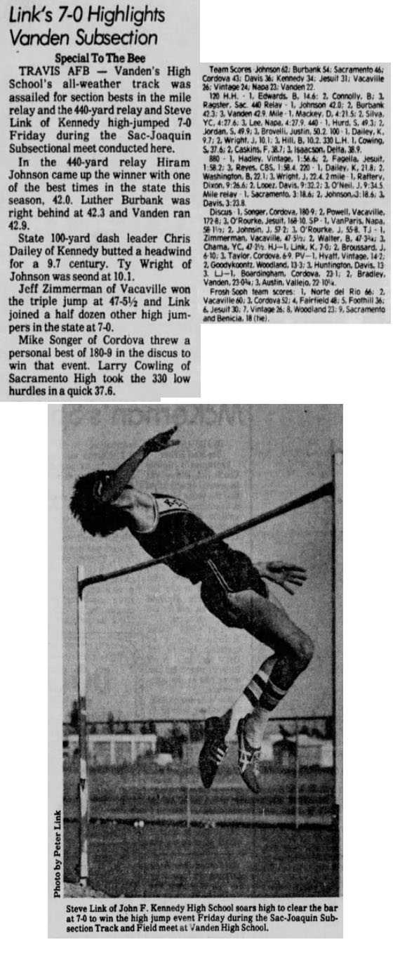 Licensed to Bella Vista High School Hy-Tek's Meet Manager Sac-Joaquin Sub-Section III Meet 5/20/1977 Vanden High School Results Boys 100 Yard Dash Varsity ============================================================================ Name Year School Finals Wind Points ============================================================================ 1 Dailey, Chris 12 Kennedy 9.7 NWI 2 Wright, Tyran 11 Hiram Johnson 10.1 NWI 3 Hill, Mike 12 Luther Burbank 10.2 NWI Boys 220 Yard Dash Varsity ============================================================================ Name Year School Finals Wind Points ============================================================================ 1 Dailey, Chris 12 Kennedy 21.8 NWI 2 Washington, Mike 11 Luther Burbank 22.1 NWI 3 Wright, Tyran 11 Hiram Johnson 22.4 NWI Boys 440 Yard Dash Varsity ======================================================================= Name Year School Finals Points ======================================================================= 1 Heard, Jim 12 Sacramento 49.3 2 Jordan, Michael 12 Sacramento 49.9 3 Brovelli, Jim 12 Justin-Siena 50.2 Boys 880 Yard Run Varsity ======================================================================= Name Year School Finals Points ======================================================================= 1 Hadley, Paul 11 Vintage 1:56.6 2 Faggella, Steve 12 Jesuit 1:58.2 3 Reyes, Jorge 10 Christian Brothers 1:58.4 Boys 1 Mile Run Varsity ======================================================================= Name Year School Finals Points ======================================================================= 1 Mackey, Steve 11 Davis 4:21.5 2 Silva, Marcos 11 Yuba City 4:27.6 3 Lee, Tim 12 Napa 4:27.9 Boys 2 Mile Run Varsity ======================================================================= Name Year School Finals Points ======================================================================= 1 Raftery, Rich 12 Dixon 9:26.6 2 Lopez, Pa 12 Davis 9:32.2 3 O'Neil, Tom 12 Jesuit 9:34.5 Boys 120 Yard Hurdles Varsity ============================================================================ Name Year School Finals Wind Points ============================================================================ 1 Edwards, Ron 12 Luther Burbank 14.6 NWI 2 Conley, Brian 12 Luther Burbank NT NWI 3 Ragster, Siro 11 Sacramento NT NWI Boys 330 Yard Hurdles Varsity ======================================================================= Name Year School Finals Points ======================================================================= 1 Cowling, Larry 11 Sacramento 37.6 2 Gaskins, Kevin 11 Foothill 38.7 3 Isaacson, Steve 12 Delta 38.9 Boys 4x110 Yard Relay Varsity ======================================================================= School Finals Points ======================================================================= 1 Hiram Johnson 42.0 2 Luther Burbank 42.3 3 Vanden 42.9 Boys 4x440 Yard Relay Varsity ======================================================================= School Finals Points ======================================================================= 1 Sacramento 3:18.6 2 Hiram Johnson 3:18.6 3 Davis 3:23.8 Boys High Jump Varsity ======================================================================= Name Year School Finals Points ======================================================================= 1 Link, Steve 12 Kennedy 7-00.00 2 Broussard, Dave 12 Hiram Johnson 6-10.00 3 Taylor, Ernie 12 Cordova 6-09.00 Boys Pole Vault Varsity ======================================================================= Name Year School Finals Points ======================================================================= 1 Hyatt, Brett 11 Vintage 14-02.00 2 Goodykoontz, Jim 12 Woodland 13-03.00 3 Huntington, Steve 11 Davis 13-03.00 Boys Long Jump Varsity ============================================================================ Name Year School Finals Wind Points ============================================================================ 1 Boardingham, Don 12 Cordova 23-01.00 NWI 2 Bradley, Ken 12 Vanden 23-00.75 NWI 3 Austin, Ron 12 Vallejo 22-10.75 NWI Boys Triple Jump Varsity ============================================================================ Name Year School Finals Wind Points ============================================================================ 1 Zimmerman, Jeff 12 Vacaville 47-05.50 NWI 2 Wafer, Sherman 12 Luther Burbank 47-03.75 NWI 3 Chima, Jaswant 12 Yuba City 47-02.50 NWI Boys Shot Put Varsity ======================================================================= Name Year School Finals Points ======================================================================= 1 Van Paris, Jeff 12 Napa 58-01.50 2 Johnson, James 12 Hiram Johnson 57-02.00 3 O'Rourke, Randy 11 Jesuit 55-08.00 Boys Discus Throw Varsity ======================================================================= Name Year School Finals Points ======================================================================= 1 Songer, Mike 12 Cordova 180-09 2 Powell, David 12 Vacaville 172-08 3 O'Rourke, Randy 11 Jesuit 168-10
