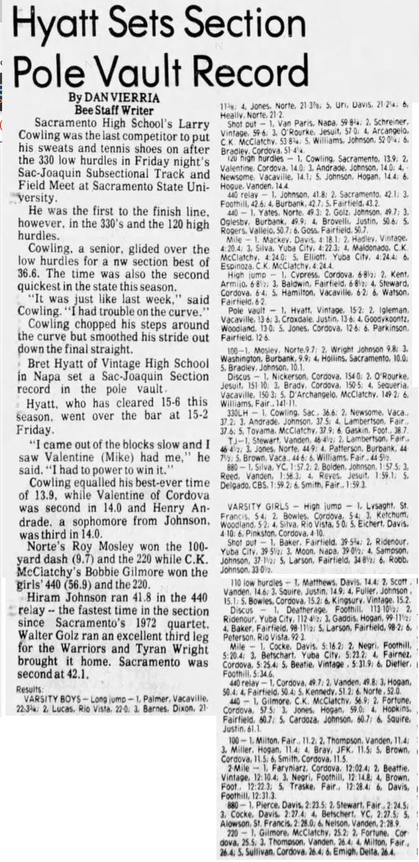 Licensed to Bella Vista High School Hy-Tek's Meet Manager Sac-Joaquin Sub-Section III Meet 5/19/1978 Vanden High School Results Girls 100 Yard Dash Varsity ============================================================================ Name Year School Finals Wind Points ============================================================================ 1 Milton, Shiri 10 Fairfield 11.2 NWI 2 Thompson, Carol 11 Vanden 11.4 NWI 3 Miller, Cynthia 10 Hogan 11.4 NWI 4 Bray, Ruth Ann 12 Kennedy 11.5 NWI 5 Brown, Pat 12 Cordova 11.5 NWI 6 Smith, Michelle 11 Cordova 11.5 NWI Girls 220 Yard Dash Varsity ============================================================================ Name Year School Finals Wind Points ============================================================================ 1 Gilmore, Bobby 12 McClatchy 25.2 NWI 2 Fortune, La Jean 12 Cordova 25.5 NWI 3 Thompson, Carol 11 Vanden 26.4 NWI 4 Milton, Shiri 10 Fairfield 26.4 NWI 5 Sullivan, Jean Ann 10 Cordova 26.4 NWI 6 Emigh, Karen 11 Delta 26.4 NWI Girls 440 Yard Dash Varsity ======================================================================= Name Year School Finals Points ======================================================================= 1 Gilmore, Bobby 12 McClatchy 56.9 2 Fortune, La Jean 12 Cordova 57.5 3 Jones, Cynthia 12 Hogan 59.0 4 Hopkins, X 12 Fairfield 60.7 5 Cardoza, Shelly 11 Hiram Johnson 60.7 6 Squire, Alynn 12 Justin-Siena 61.1 Girls 880 Yard Run Varsity ======================================================================= Name Year School Finals Points ======================================================================= 1 Pierce, Becky 11 Davis 2:23.5 2 Stewart, Colleen 12 Fairfield 2:24.5 3 Cocke, Debbie 11 Davis 2:27.4 4 Betschart, Mindy 10 Yuba City 2:27.5 5 Alowson, X 12 St Francis 2:28.0 6 Nelson, Linda 11 Vanden 2:28.9 Girls 1 Mile Run Varsity ======================================================================= Name Year School Finals Points ======================================================================= 1 Cocke, Debbie 11 Davis 5:16.2 2 Negri, Franchesca 10 Foothill 5:20.4 3 Betschart, Mindy 10 Yuba City 5:23.2 4 Faryniarz, Debbie 10 Cordova 5:25.4 5 Beatie, Nina 12 Vintage 5:31.9 6 Dietler, Pam 11 Foothill 5:34.6 Girls 2 Mile Run Varsity ======================================================================= Name Year School Finals Points ======================================================================= 1 Faryniarz, Debbie 10 Cordova 12:02.4 2 Beatie, Nina 12 Vintage 12:10.4 3 Negri, Franchesca 11 Foothill 12:14.8 4 Brown, Jenny 12 Foothill 12:22.3 5 Traske, X 12 Fairfield 12:28.4 6 Davis, Ellen 12 Foothill 12:31.3 Girls 110 Yard Hurdles Varsity ============================================================================ Name Year School Finals Wind Points ============================================================================ 1 Matthews, Val 12 Davis 14.4 NWI 2 Scott, Joyce 11 Vanden 14.6 NWI 3 Squire, Alynn 12 Justin-Siena 14.9 NWI 4 Fuller, Tenise 10 Hiram Johnson 15.1 NWI 5 Bowles, Joyce 11 Cordova 15.2 NWI 6 Kingsury, Penny 10 Vintage 15.2 NWI Girls 4x110 Yard Relay Varsity ======================================================================= School Finals Points ======================================================================= 1 Cordova 49.7 2 Vanden 49.8 3 Hogan 50.4 4 Fairfield 50.4 5 Kennedy 51.2 6 Norte Del Rio 52.0 Girls 4x440 Yard Relay Varsity ======================================================================= School Finals Points ======================================================================= Girls High Jump Varsity ======================================================================= Name Year School Finals Points ======================================================================= 1 Lysaght, Karen 9 St Francis 5-04.00 2 Bowles, Joyce 12 Cordova 5-04.00 3 Ketcham, Carmen 10 Woodland 5-02.00 4 Silva, Kathy 12 Rio Vista 5-00.00 5 Eichert, Laura 10 Davis 4-10.00 6 Pinkston, Cynthia 11 Cordova 4-10.00 Girls Long Jump Varsity ============================================================================ Name Year School Finals Wind Points ============================================================================ Girls Shot Put Varsity ======================================================================= Name Year School Finals Points ======================================================================= 1 Baker, Christina 12 Fairfield 39-05.75 2 Ridenour, Jill 12 Yuba City 39-05.50 3 Moon, Marcie 12 Napa 39-00.50 4 Sampson, Stephanie 11 Hiram Johnson 37-01.50 5 Larson, Carolynn 10 Fairfield 34-08.50 6 Robb, Toni 11 Hiram Johnson 33-00.50 Girls Discus Throw Varsity ======================================================================= Name Year School Finals Points ======================================================================= 1 Deatherage, Debbie 12 Foothill 113-10 2 Ridenour, Jill 12 Yuba City 112-04 3 Gaddis, X 12 Hogan 99-11 4 Baker, Christina 12 Fairfield 98-11 5 Larson, Carolynn 10 Fairfield 98-02 6 Peterson, Sherry 12 Rio Vista 92-03 Boys 100 Yard Dash Varsity ============================================================================ Name Year School Finals Wind Points ============================================================================ 1 Mosley, Roy 11 Norte Del Rio 9.7 NWI 2 Wright, Tyran 12 Hiram Johnson 9.8 NWI 3 Washington, Mike 12 Luther Burbank 9.9 NWI 4 Hollins, Kevin 12 Sacramento 10.0 NWI 5 Bradley, Anthony 12 Hiram Johnson 10.1 NWI Boys 220 Yard Dash Varsity ============================================================================ Name Year School Finals Wind Points ============================================================================ Boys 440 Yard Dash Varsity ======================================================================= Name Year School Finals Points ======================================================================= 1 Yates, Darryl 12 Norte Del Rio 49.3 2 Golz, Walter 12 Hiram John