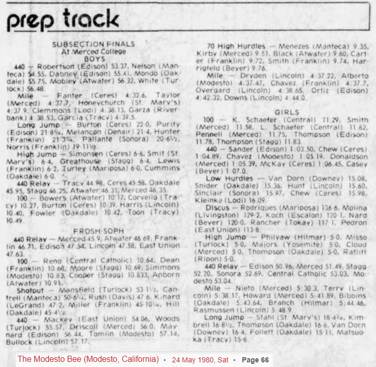 Licensed to Bella Vista High School Hy-Tek's Meet Manager Sac-Joaquin Sub-Section I Meet 5/23/1980 Merced Junior College Results Girls 100 Yard Dash Varsity ============================================================================ Name Year School Finals Wind Points ============================================================================ 1 Schaefer, Karen 10 Central Catholic 11.29 2 Smith, Monica 11 Merced 11.58 3 Schaefer, Lori 10 Central Catholic 11.62 4 Pennell, Brenda 9 Merced 11.75 5 Thompson, Rochelle 10 Edison 11.78 6 Thompson, Brenda 11 Stagg 11.83 Girls 220 Yard Dash Varsity ======================================================================== Name Year School Finals Wind H# ======================================================================== 1 Sanders, Devy 12 Edison (S) 25.62 2 Schaefer, Karen 10 Central Catholic 25.82 3 Gerimia, Unknown 12 Edison 26.79 4 McKay, Shawna 11 Ceres 26.85 5 Parson, Unknown 12 Sonora 27.09 6 Chew, Rhonda 11 Ceres 27.25 Girls 440 Yard Dash Varsity =================================================================== Name Year School Finals =================================================================== 1 Sanders, Devy 12 Edison (S) 1:03.50 2 Chew, Rhonda 11 Ceres 1:04.89 3 Chavez, Theresa 10 Modesto 1:05.19 4 Donaldson, Kim 10 Merced 1:05.39 5 McKay, Shawna 11 Ceres 1:06.45 6 Casey, Corine 9 Beyer 1:07.00 Girls 880 Yard Run Varsity =================================================================== Name Year School Finals =================================================================== 1 Neito, Shelly 11 Merced 2:17.1 2 Anderson, Tammy 11 Beyer 2:17.5 3 Morilla, Carla 12 Tokay 2:23.6 4 Donaldson, Kim 9 Merced 2:23.9 5 Chavez, Theresa 10 Modesto 2:27.4 6 Smith, Brenda 10 Tracy 2:27.7 Girls 1 Mile Run Varsity ======================================================================= Name Year School Finals ======================================================================= 1 Neito, Shelly 11 Merced 5:30.30 2 Perry, Jill 10 Lincoln 5:38.17 3 Horward, Ulaine 10 Merced 5:41.89 4 Bibbins, Lori 9 Oakdale 5:43.64 5 Branch, Debbie 12 Hilmar 5:44.46 6 Rasmussen, Julie 9 Lincoln 5:48.90 Girls 2 Mile Run Varsity ======================================================================= Name Year School Finals Points ======================================================================= 1 Chituras, Charleen 11 Downey 11:34.68 2 Massey, Marla 11 Merced 11:58.25 3 Hughes, Lili 12 Merced 12:04.40 4 Perry, Jill 10 Lincoln 12:11.01 5 Brazil, Mary 12 Hilmar 12:14.01 6 Fletcher, Marie 11 Turlock 12:18.30 Girls 110 Yard Hurdles Varsity ======================================================================== Name Year School Finals Wind ======================================================================== 1 Van Dorn, Debbie 12 Downey 15.08 2 Snider, Kathy 12 Oakdale 15.36 3 Hunt, Kelly 11 Lincoln 15.60 4 Sinclair, Danette 10 Sonora 15.97 5 Chew, Rhonda 11 Ceres 15.98 6 Kleinke, Cindy 11 Lodi 16.09 Girls 330 Yard Hurdles Varsity ======================================================================= Name Year School Finals Points ======================================================================= Girls 4x110 Yard Relay Varsity =================================================================== School Finals =================================================================== 1 Edison 50.96 2 Merced 51.49 3 Stagg 52.20 4 Sonora 52.69 5 Central Catholic 53.03 6 Modesto 53.04 Girls 4x440 Yard Relay Varsity ======================================================================= School Finals Points ======================================================================= 1 Merced 4:07.25 2 Beyer 4:09.61 3 Ceres 4:10.88 4 St Mary's 4:13.03 5 Hilmar 4:15.38 6 Stagg 4:18.93 Girls High Jump Varsity ======================================================================= Name Year School Finals Points ======================================================================= 1 Philyaw, Julia 12 Hilmar 5-00.00 2 Misso, Teresa 11 Turlock 5-00.00 3 Majors, Sharon 10 Yosemite 5-00.00 4 Cloud, Susan 10 Merced 5-00.00 5 Thompson, Monica 12 Oakdale 5-00.00 6 Ratliff, Eleanor 11 Ripon 5-00.00 Girls Long Jump Varsity ============================================================================ Name Year School Finals Wind Points ============================================================================ 1 Stahl, Karen 12 St Mary's 18-04.75 2 Kimbrell, Leslie 9 Beyer 16-08.50 3 Thompson, Monica 12 Oakdale 16-06.00 4 Van Dorn, Debbie 12 Downey 16-04.00 5 Follett, Cheryl 11 Oakdale 15-11.00 6 Matsuoka, Lori 11 Tracy 15-06.00 Girls Triple Jump Varsity ============================================================================ Name Year School Finals Wind Points ============================================================================ Girls Shot Put Varsity ======================================================================= Name Year School Finals ======================================================================= 1 Koch, Becky 12 Escalon 40-03.75 2 Rodriguez, Mel 11 Mariposa 40-03.00 3 Jones, Dot 10 Hilmar 38-10.75 4 Sayad, Julie 12 Hughson 34-10.75 5 Molina, Teresa 11 Livingston 34-08.25 6 Fillipini, Pam 10 Manteca 34-07.75 Girls Discus Throw Varsity ======================================================================= Name Year School Finals ======================================================================= 1 Rodriguez, Mel 11 Mariposa 136-06 2 Molina, Teresa 11 Livingston 129-02 3 Koch, Becky 12 Escalon 120-01 4 Nard, Maureen 11 Beyer 120-00 5 Rancher, Monica 11 Tokay 117-01 6 Pedron, Jennifer 11 East Union 113-08 Boys 100 Yard Dash Varsity ============================================================================ Name Year School Finals Wind Points ============================================================================ 1 Bowers, Scott 12 Atwater 10.17 2 Corvello, Steve 12 Tracy 10.27 3 Burton, Carl 12 Ceres 10.39 4 Harris, Ermon 11 Lincoln 10.40 5