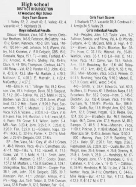 Licensed to Bella Vista High School Hy-Tek's Meet Manager Sac-Joaquin Sub-Section III Meet 5/11/1984 Woodland High School Results Girls 100 Meter Dash Varsity ============================================================================ Name Year School Finals Wind Points ============================================================================ 1 Qualls, Pam 12 Luther Burbank 11.8 NWI 2 Wright, Michelle 11 Armijo 12.0 NWI 3 Seals, Kim 9 Armijo 12.1 NWI 4 Brewer, Regina 12 Hogan 12.3 NWI 5 Reese, Shilon 11 Luther Burbank 12.4 NWI Girls 220 Yard Dash Varsity ============================================================================ Name Year School Finals Wind Points ============================================================================ 1 Qualls, Pam 12 Luther Burbank 25.1 NWI 2 Wright, Michelle 11 Armijo 25.4 NWI 3 Brewer, Regina 12 Hogan 25.8 NWI 4 Downey, Rachelle 12 Highlands 25.8 NWI 5 Smith, Laurie 9 Valley 26.0 NWI Girls 440 Yard Dash Varsity ======================================================================= Name Year School Finals Points ======================================================================= 1 Smith, D'Angela 9 Valley 59.4 2 Edwards, Shanna 11 Vallejo 60.3 3 Brothers, Marie 11 St Francis 61.1 4 Beckius, Carolyn 11 Napa 61.6 5 Broadway, Tina 12 Luther Burbank 62.2 Girls 880 Yard Run Varsity ======================================================================= Name Year School Finals Points ======================================================================= 1 Mooney, Joni 12 Vacaville 2:21.9 2 Bushling, Laurie 12 Yuba City 2:22.4 3 Kelley, Joanne 11 St Francis 2:26.1 4 Fish, Linda 9 Napa 2:26.5 5 Rasmussen, Marilyn 11 Elk Grove 2:28.9 Girls 1 Mile Run Varsity ======================================================================= Name Year School Finals Points ======================================================================= 1 Mooney, Joni 12 Vacaville 5:05.8 2 Pinkner, Sally 12 Davis 5:14.5 3 Bushling, Laurie 12 Yuba City 5:16.0 4 Madell, Robin 11 Davis 5:27.0 5 Coate, Dee Dee 9 Will C. Wood 5:40.6 Girls 2 Mile Run Varsity ======================================================================= Name Year School Finals Points ======================================================================= 1 Mooney, Joni 12 Vacaville 11:00.1 2 Pinkner, Sally 12 Davis 11:09.8 3 Madell, Robin 11 Davis 11:44.2 4 Albertazzi, Anne 11 St Francis 12:43.5 5 Jensen, Tracy 11 Vacaville 12:50.3 Girls 110 Yard Hurdles Varsity ============================================================================ Name Year School Finals Wind Points ============================================================================ 1 Hill, Misako 11 Cordova 14.7 NWI 2 Knox, Danielle 11 Vacaville 14.7 NWI 3 Colvin, Rhonda 9 Vanden 15.4 NWI 4 Nichols, Marci 12 Armijo 15.6 NWI 5 Broadway, Tina 12 Luther Burbank 15.6 NWI Girls 330 Yard Hurdles Varsity ======================================================================= Name Year School Finals Points ======================================================================= 1 Broadway, Tina 12 Luther Burbank 46.7 2 Emberley, Tracey 12 Napa 46.7 3 Colvin, Rhonda 9 Vanden 47.2 4 Hayes, Maggy 10 McClatchy 48.2 5 Sampo, Staci 12 Davis 48.5 Girls 4x110 Yard Relay Varsity ======================================================================= School Finals Points ======================================================================= 1 Luther Burbank 49.2 2 Armijo 49.6 3 Cordova 49.9 4 Valley 50.1 5 Vallejo 50.2 50.5 Girls 4x440 Yard Relay Varsity ======================================================================= School Finals Points ======================================================================= 1 Luther Burbank 4:11.3 2 Vanden 4:11.3 3 Napa 4:12.9 4 Valley 4:14.7 5 McClatchy 4:17.1 Girls High Jump Varsity ======================================================================= Name Year School Finals Points ======================================================================= 1 Peoples, Sharon 12 Hiram Johnson 5-02.00 2 Taylor, Tina 11 Vacaville 5-02.00 3 Sullivan, KC 10 Benicia 4-10.00 4 Finney, Pam 11 Vallejo 4-10.00 5 Worlds, Lesia 12 Luther Burbank 4-10.00 6 McCants, Kim 9 Cordova 4-10.00 Girls Long Jump Varsity ============================================================================ Name Year School Finals Wind Points ============================================================================ 1 Hendrix, Caroline 11 McClatchy 17-11.50 NWI 2 Rogers, Stacey 9 Hiram Johnson 17-11.00 NWI 3 Chambers, Vivian 10 Cordova 17-03.00 NWI 4 Callahan, Kelly 12 Kennedy 17-03.00 NWI 5 Joe, Alycia 10 Valley 16-10.00 NWI Girls Triple Jump Varsity ============================================================================ Name Year School Finals Wind Points ============================================================================ 1 Callahan, Kelly 12 Kennedy 39-09.25 NWI 2 Hendrix, Caroline 11 McClatchy 36-01.50 NWI 3 Joe, Alycia 10 Valley 34-11.75 NWI 4 Nortier, Nicole 12 Vacaville 34-11.50 NWI 5 Chambers, Vivian 10 Cordova 34-06.50 NWI Girls Shot Put Varsity ======================================================================= Name Year School Finals Points ======================================================================= 1 Brown, Yvette 12 Vacaville 40-02.75 2 Blockton, China 12 Luther Burbank 38-02.50 3 Hom, Stacey 11 Cordova 37-11.25 4 Mitchell, Martista 12 Vallejo 35-08.75 5 Warlick, Sherry 11 Vacaville 35-01.00 Girls Discus Throw Varsity ======================================================================= Name Year School Finals Points ======================================================================= 1 Hom, Stacey 11 Cordova 145-06 2 Blockton, China 12 Luther Burbank 132-04 3 Brown, Yvette 12 Vacaville 117-10 4 Durham, Z 12 Woodland 110-09 5 Worlds, Lesia 12 Luther Burbank 106-00 Boys 100 Meter Dash Varsity ============================================================================ Name Year School Finals Win