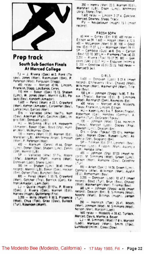 Girls 3200 Meter Run Varsity ======================================================================= Name Year School Finals Points ======================================================================= 1 Donovan, Colleen 12 Lodi 10:47.7 Girls 100 Meter Hurdles Varsity ======================================================================== Name Year School Finals Wind ======================================================================== 1 Johnson, Chrishelle 10 Stagg 14.80 Girls 300 Meter Hurdles Varsity ======================================================================= Name Year School Finals Points ======================================================================= 1 Johnson, Chrishelle 10 Stagg 44.85 Girls 4x100 Meter Relay Varsity =================================================================== School Finals =================================================================== 1 Merced 49.58 Girls 4x400 Meter Relay Varsity ======================================================================= School Finals Points ======================================================================= 1 Modesto 4:08.62 Girls High Jump Varsity ======================================================================= Name Year School Finals Points ======================================================================= 1 Keon, Kim 12 Lincoln 5-04.00 Girls Long Jump Varsity ============================================================================ Name Year School Finals Wind Points ============================================================================ 1 Simmons, Mona 12 Modesto 17-08.50 Girls Triple Jump Varsity ============================================================================ Name Year School Finals Wind Points ============================================================================ Girls Shot Put Varsity ======================================================================= Name Year School Finals ======================================================================= 1 Tillman, Tracy 11 Edison 37-01.00 Girls Discus Throw Varsity ======================================================================= Name Year School Finals ======================================================================= 1 Gray, Nina 11 Tokay 123-10 Boys 100 Meter Dash Varsity ============================================================================ Name Year School Finals Wind Points ============================================================================ 1 Henry, Palente 11 Merced 11.00 Boys 200 Meter Dash Varsity ============================================================================ Name Year School Finals Wind Points ============================================================================ 1 Henry, Palente 11 Merced 22.0 Boys 400 Meter Dash Varsity ======================================================================= Name Year School Finals Points ======================================================================= 1 Markum, Bryan 11 Ceres 49.44 Boys 800 Meter Run Varsity ======================================================================= Name Year School Finals Points ======================================================================= 1 Perez, Tony 11 Manteca 1:55.75 Boys 1600 Meter Run Varsity ======================================================================= Name Year School Finals Points ======================================================================= 1 Perez, Tony 11 Manteca 4:22.1 Boys 3200 Meter Run Varsity ======================================================================= Name Year School Finals Points ======================================================================= 1 Mills, Ron 12 Manteca 9:50.3 Boys 110 Meter Hurdles Varsity ============================================================================ Name Year School Finals Wind Points ============================================================================ 1 Baker, Tim 11 Oakdale 15.13 Boys 300 Meter Hurdles Varsity ======================================================================= Name Year School Finals Points ======================================================================= 1 Shaben, Andy 11 Lincoln 38.60 Boys 4x100 Meter Relay Varsity ======================================================================= School Finals Points ======================================================================= 1 Merced 42.96 Boys 4x400 Meter Relay Varsity ======================================================================= School Finals Points ======================================================================= 1 Lincoln 3:27.4 Boys High Jump Varsity ======================================================================= Name Year School Finals Points ======================================================================= 1 McGinnis, Mirl 12 Riverbank 6-09.00 Boys Pole Vault Varsity ======================================================================= Name Year School Finals Points ======================================================================= 1 Neugebauer, Rick 12 Hughson 15-01.00 Boys Long Jump Varsity ============================================================================ Name Year School Finals Wind Points ============================================================================ 1 Qualle, Kevin 12 Hughson 22-10.25 Boys Triple Jump Varsity ============================================================================ Name Year School Finals Wind Points ============================================================================ 1 Rivera, Jon 11 Oakdale 46-02.00 Boys Shot Put Varsity ======================================================================= Name Year School Finals Points ======================================================================= 1 Valladao, Ray 12 Atwater 57-07.75 Boys Discus Throw Varsity ======================================================================= Name Year School Finals Points ============================