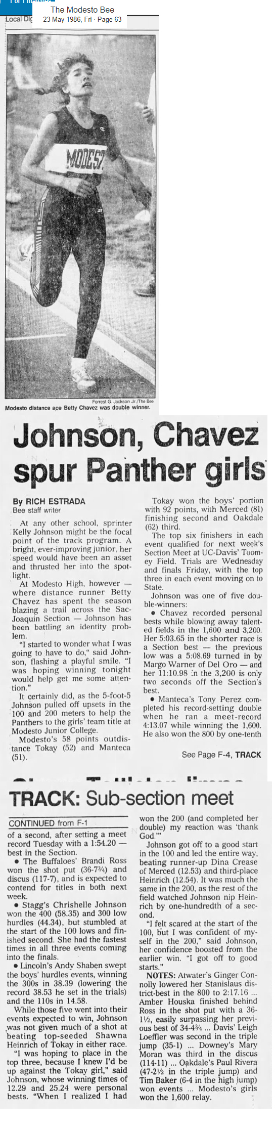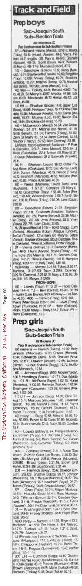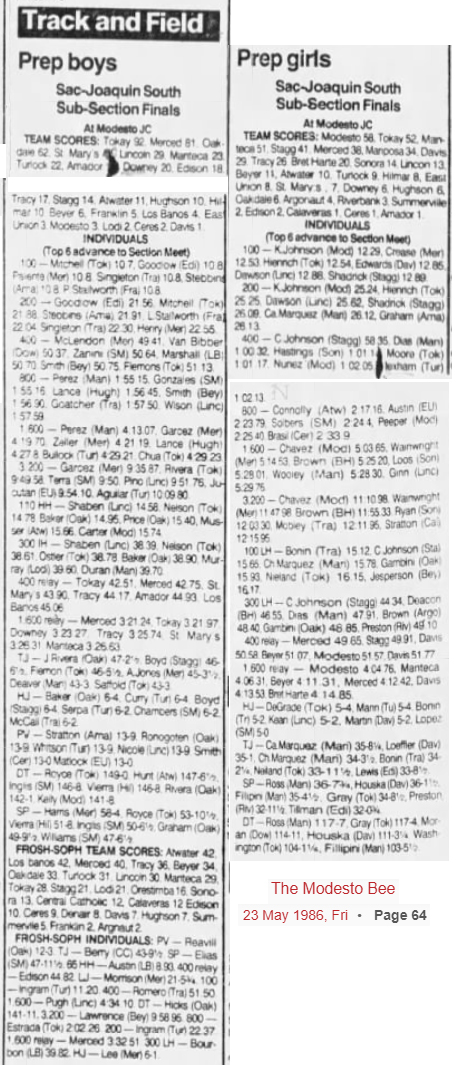 Girls 3200 Meter Run Varsity ======================================================================= Name Year School Finals Points ======================================================================= 1 Chavez, Betty 12 Modesto 11:10.98 2 Wainwright, Stacey 12 Merced 11:47.98 3 Brown, Michelle 9 Bret Harte 11:55.33 4 Ryan, Kathy 12 Sonora 12:03.30 5 Mobley, Londa 12 Tracy 12:11.95 6 Stratton, Traci 10 Calaveras 12:15.95 Girls 100 Meter Hurdles Varsity ======================================================================== Name Year School Finals Wind ======================================================================== 1 Bonin, Janine 11 Tracy 15.12 2 Johnson, Chrishelle 11 Stagg 15.65 3 Marquez, Cherrie 12 Mariposa 15.78 4 Gambini, Tori 12 Oakdale 15.93 5 Nieland, Kristen 10 Tokay 16.15 6 Jesperson, Jenelle 11 Beyer 16.17 Girls 300 Meter Hurdles Varsity ======================================================================= Name Year School Finals Points ======================================================================= 1 Johnson, Chrishelle 11 Stagg 44.34 2 Deacon, Heather 12 Bret Harte 46.55 3 Dias, Amanda 9 Manteca 47.91 4 Brown, Wendy 10 Argonaut 48.40 5 Gambini, Tori 12 Oakdale 48.85 6 Preston, Nancy 12 Riverbank 49.10 Girls 4x100 Meter Relay Varsity =================================================================== School Finals =================================================================== 1 Merced 49.65 2 Stagg 49.91 3 Grace Davis 50.58 4 Beyer 51.07 5 Modesto 51.57 Girls 4x400 Meter Relay Varsity ======================================================================= School Finals Points ======================================================================= 1 Modesto 4:04.76 2 Manteca 4:06.31 3 Beyer 4:11.31 4 Merced 4:12.42 5 Grace Davis 4:13.53 6 Bret Harte 4:14.85 Girls High Jump Varsity ======================================================================= Name Year School Finals Points ======================================================================= 1 Dagrady, Stacey 11 Tokay 5-04.00 2 Mann, Jenni 11 Turlock 5-04.00 3 Bonin, Janine 11 Tracy 5-02.00 4 Kean, Kim 12 Lincoln 5-02.00 5 Martin, Annette 11 Grace Davis 5-02.00 6 Lopez, Kim 11 St Mary's 5-00.00 Girls Long Jump Varsity ============================================================================ Name Year School Finals Wind Points ============================================================================ 1 Marquez, Carrie 12 Mariposa 17-07.00 2 Lundquist, Sonia 12 Hilmar 16-10.75 3 Cipponeri, Josephine 12 Hughson 16-07.25 4 Bonin, Janine 11 Tracy 16-05.00 5 Fagnani, Gina 12 Summerville 16-00.00 6 Loeffler, Leigh 12 Grace Davis 15-11.50 Girls Triple Jump Varsity ============================================================================ Name Year School Finals Wind Points ============================================================================ 1 Marquez, Carrie 12 Mariposa 35-08.25 2 Loeffler, Leigh 12 Grace Davis 35-01.00 3 Marquez, Cherrie 12 Mariposa 34-03.50 4 Bonin, Janine 11 Tracy 34-02.25 5 Nieland, Kristen 12 Tokay 33-11.50 6 Lewis, Sheila 12 Edison 33-08.50 Girls Shot Put Varsity ======================================================================= Name Year School Finals ======================================================================= 1 Ross, Brandi 12 Manteca 36-07.75 2 Houska, Amber 12 Grace Davis 36-01.50 3 Fillipini, Mitzi 11 Manteca 35-04.50 4 Gray, Nina 12 Tokay 34-08.50 5 Preston, Nancy 12 Riverbank 32-11.50 6 Tillman, Tracy 12 Edison 32-00.75 Girls Discus Throw Varsity ======================================================================= Name Year School Finals ======================================================================= 1 Ross, Brandi 12 Manteca 117-07 2 Gray, Nina 12 Tokay 117-04 3 Moran, Mary 11 Downey 114-11 4 Houska, Amber 12 Grace Davis 111-03 5 Washington, Cheryl 12 Tokay 104-01 6 Fillipini, Mitzi 11 Manteca 103-05 Boys 100 Meter Dash Varsity ============================================================================ Name Year School Finals Wind Points ============================================================================ 1 Mitchell, Lamar 12 Tokay 10.7 2 Goodlow, Devon 11 Tokay 10.8 3 Palente, Henry 12 Merced 10.8 4 Singleton, Clay 12 Tracy 10.8 5 Stebbins, David 11 Amador 10.8 6 Stallworth, Prince 12 Franklin 10.8 Boys 200 Meter Dash Varsity ============================================================================ Name Year School Finals Wind Points ============================================================================ 1 Goodlow, Devon 11 Tokay 21.56 2 Mitchell, Lamar 12 Tokay 21.88 3 Stebbins, David 11 Amador 21.91 4 Stallworth, Lewis 12 Franklin 22.04 5 Singleton, Clay 12 Tracy 22.30 6 Henry, Palente 12 Merced 22.55 Boys 400 Meter Dash Varsity ======================================================================= Name Year School Finals Points ======================================================================= 1 McLendon, Kevin 12 Merced 49.41 2 Van Bibber, Richie 12 Downey 50.37 3 Zanini, Steve 12 St Mary's 50.64 4 Marshall, Stacy 12 Los Banos 50.70 5 Smith, Jeff 12 Beyer 50.75 6 Flemons, Jeff 11 Tokay 51.13 Boys 800 Meter Run Varsity ======================================================================= Name Year School Finals Points ======================================================================= 1 Perez, Tony 12 Manteca 1:55.15 2 Gonzales, Art 11 St Mary's 1:55.16 3 Lance, Todd 12 Hughson 1:56.45 4 Smith, Jeff 12 Beyer 1:56.90 5 Goatcher, Roger 12 Tracy 1:57.50 6 Wilson, Dennis 12 Lincoln 1:57.59 Boys 1600 Meter Run Varsity ======================================================================= Name Year School Finals Points ======================================================================= 1 Perez, Tony 12 Manteca 4:13.07 2 Garcez, David 12 Merced 4:19.70 3 Zeller, Rich 11 Merced 4:21.19 4 Lance, Todd 12 Hughson 4:27.80 5 Bullock, Keith 11 Turlock 4:29.21 6 Chua, Francis 12 Tokay 4:29.23 Boys 320