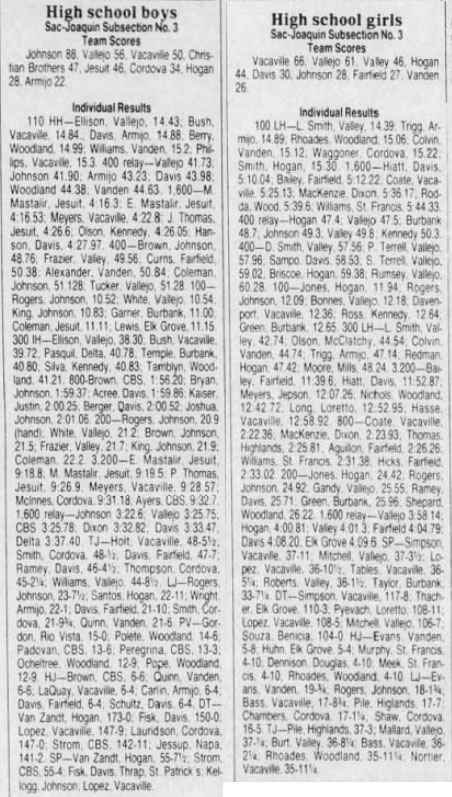 Licensed to Bella Vista High School Hy-Tek's Meet Manager Sac-Joaquin Sub-Section III Meet 5/23/1986 Hughes Stadium Results Girls 100 Meter Dash Varsity ============================================================================ Name Year School Finals Wind Points ============================================================================ 1 Jones, Shadon 10 Hogan 11.94 NWI 2 Rogers, Stacey 11 Hiram Johnson 12.09 NWI 3 Bonner, Tracy 12 Vallejo 12.18 NWI 4 Davenport, Sonia 12 Vacaville 12.36 NWI 5 Ross, Stacey 12 Kennedy 12.64 NWI 6 Green, Rhonda 12 Luther Burbank 12.65 NWI Girls 200 Meter Dash Varsity ============================================================================ Name Year School Finals Wind Points ============================================================================ 1 Jones, Shadon 10 Hogan 24.42 NWI 2 Rogers, Stacey 11 Hiram Johnson 24.92 NWI 3 Gandy, Veronica 12 Vallejo 25.55 NWI 4 Ramey, Dana 11 Davis 25.71 NWI 5 Green, Rhonda 12 Luther Burbank 25.96 NWI 6 Shephard, Kim 11 Woodland 26.22 NWI Girls 400 Meter Dash Varsity ======================================================================= Name Year School Finals Points ======================================================================= 1 Smith, D'Angela 11 Valley 57.56 2 Terrell, Pam 12 Vallejo 57.96 3 Sampo, Stephanie 10 Davis 58.53 4 Terrell, Shirly 9 Vallejo 59.02 5 Briscoe, Charmaine 12 Hogan 59.38 6 Rumsey, Doreen 12 Vallejo 60.28 Girls 800 Meter Run Varsity ======================================================================= Name Year School Finals Points ======================================================================= 1 Coate, Dee Dee 11 Vacaville 2:22.36 2 MacKenzie, Gabrielle 10 Dixon 2:23.93 3 Thomas, Evla 11 Highlands 2:25.81 4 Aguillon, Clariza 12 Fairfield 2:26.26 5 Williams, X 12 St Francis 2:31.38 6 Hicks, Tangie 12 Fairfield 2:33.02 Girls 1600 Meter Run Varsity ======================================================================= Name Year School Finals Points ======================================================================= 1 Hiatt, Malanie 11 Davis 5:10.04 2 Bailey, Wanda 10 Fairfield 5:12.22 3 Coate, Dee Dee 11 Vacaville 5:25.13 4 MacKenzie, Gabrielle 10 Dixon 5:36.17 5 Rodda, Michele 9 Vacaville 5:39.60 6 Williams, X 12 St Francis 5:44.33 Girls 3200 Meter Run Varsity ======================================================================= Name Year School Finals Points ======================================================================= 1 Bailey, Wanda 10 Fairfield 11:39.60 2 Hiatt, Malanie 11 Davis 11:52.87 3 Myers, Patrice 11 Vacaville 12:07.26 4 Nichols, Marcia 12 Woodland 12:42.72 5 Long, Shauna 11 Loretto 12:52.95 6 Hasse, Wendi 12 Vacaville 12:58.92 Girls 100 Meter Hurdles Varsity ============================================================================ Name Year School Finals Wind Points ============================================================================ 1 Smith, Laurie 11 Valley 14.39 NWI 2 Trigg, Clara 11 Armijo 14.89 NWI 3 Rhoades, Stephanie 11 Woodland 15.06 NWI 4 Colvin, Rhonda 11 Vanden 15.12 NWI 5 Waggoner, Tammy 11 Cordova 15.22 NWI 6 Smith, Derena 12 Hogan 15.30 NWI Girls 300 Meter Hurdles Varsity ======================================================================= Name Year School Finals Points ======================================================================= 1 Smith, Laurie 11 Valley 42.74 2 Olson, Tami 9 McClatchy 44.54 3 Colvin, Rhonda 11 Vanden 44.74 4 Trigg, Clara 11 Armijo 47.14 5 Redmond, Nicole 9 Hogan 47.42 6 Moore, Michelle 9 Cordova 48.24 Girls 4x100 Meter Relay Varsity ======================================================================= School Finals Points ======================================================================= 1 Hogan 47.4 2 Vallejo 47.5 3 Luther Burbank 48.7 4 Hiram Johnson 49.3 5 Valley 49.8 6 Kennedy 50.3 Girls 4x400 Meter Relay Varsity ======================================================================= School Finals Points ======================================================================= 1 Vallejo 3:58.14 2 Hogan 4:00.81 3 Valley 4:01.30 4 Fairfield 4:04.79 5 Davis 4:08.20 6 Elk Grove 4:09.60 Girls High Jump Varsity ======================================================================= Name Year School Finals Points ======================================================================= 1 Evans, Angela 11 Vanden 5-08.00 2 Huhn, Kris 12 Elk Grove 5-04.00 3 Murphy, Letitia 11 St Francis 4-10.00 4 Denison, Ann 9 Woodland 4-10.00 5 Meek, Jackie 11 St Francis 4-10.00 6 Rhoades, Stephanie 11 Woodland 4-10.00 Girls Long Jump Varsity ============================================================================ Name Year School Finals Wind Points ============================================================================ 1 Evans, Angela 11 Vanden 19-00.25 NWI 2 Rogers, Stacey 11 Hiram Johnson 18-01.25 NWI 3 Bass, Melynee 11 Vacaville 17-08.25 NWI 4 Pile, Lolita 12 Highlands 17-07.00 NWI 5 Chambers, Vivian 12 Cordova 17-01.25 NWI 6 Shaw, Christina 12 Cordova 16-05.00 NWI Girls Triple Jump Varsity ============================================================================ Name Year School Finals Wind Points ============================================================================ 1 Pile, Lolita 12 Highlands 37-03.00 2 Mallard, Kim 10 Vallejo 37-00.25 3 Burt, Michelle 10 Valley 36-08.25 4 Bass, Melynee 10 Vacaville 36-02.25 5 Rhoades, Stephanie 11 Woodland 35-11.25 6 Nortier, Nicole 12 Vacaville 35-11.25 Girls Shot Put Varsity ======================================================================= Name Year School Finals Points ======================================================================= 1 Simpson, Pat 11 Vacaville 37-11.00 2 Mitchell, Martrescia 12 Vallejo 37-03.50 3 Lopez, Tracy 10 Vacaville 36-10.50 4 Tables, Jackie 12 Vacaville 36-05.25 5 Roberts, Deann 12 Valley 36-01.50 6 Taylor, Latesia 9 Luther Burbank 33-07.25 Girls Discus Throw Varsity ==================================