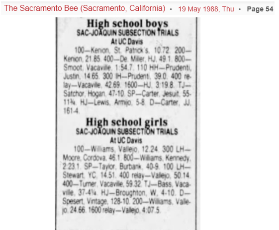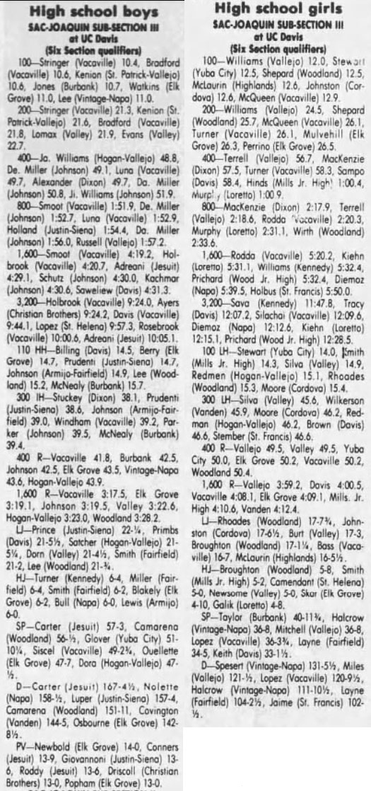 Licensed to Bella Vista High School Hy-Tek's Meet Manager Sac-Joaquin Sub-Section III Meet 5/20/1988 UC Davis Results Girls 100 Meter Dash Varsity ============================================================================ Name Year School Finals Wind Points ============================================================================ 1 Williams, Chris 11 Vallejo 12.0 NWI 2 Stewart, Kwani 10 Yuba City 12.5 NWI 3 Shephard, Kim 12 Woodland 12.5 NWI 4 McLaurin, Tanya 12 Highlands 12.6 NWI 5 Johnson, Monica 12 Cordova 12.6 NWI 6 McQueen, M 12 Vacaville 12.9 NWI Girls 200 Meter Dash Varsity ============================================================================ Name Year School Finals Wind Points ============================================================================ 1 Williams, Chris 11 Vallejo 24.5 NWI 2 Shephard, Kim 12 Woodland 25.7 NWI 3 McQueen, M 12 Vacaville 26.1 NWI 4 Turner, Geri 11 Vacaville 26.1 NWI 5 Mulvehill, Melissa 10 Elk Grove 26.3 NWI 6 Perrino, Jerri 12 Elk Grove 26.5 NWI Girls 400 Meter Dash Varsity ======================================================================= Name Year School Finals Points ======================================================================= 1 Terrell, Shirly 11 Vallejo 56.7 2 MacKenzie, Gabrielle 11 Dixon 57.5 3 Turner, Geri 11 Vacaville 58.3 4 Sampo, Stephanie 12 Davis 58.4 5 Hinds, Legretta 9 Cordova 1:00.4 6 Murphy, Jennifer 10 Loretto 1:00.9 Girls 800 Meter Run Varsity ======================================================================= Name Year School Finals Points ======================================================================= 1 MacKenzie, Gabrielle 11 Dixon 2:17.9 2 Terrell, Shirly 11 Vallejo 2:18.6 3 Rodda, Michele 11 Vacaville 2:20.3 4 Murphy, Jennifer 10 Loretto 2:31.1 5 Wirth, Carrie 12 Woodland 2:33.6 Girls 1600 Meter Run Varsity ======================================================================= Name Year School Finals Points ======================================================================= 1 Rodda, Michelle 11 Vacaville 5:20.2 2 Kiehn, K 9 Loretto 5:31.1 3 Williams, Liv 12 Kennedy 5:32.4 4 Prichard, P 9 Will C Wood 5:34.4 5 Diemoz, Lisa 12 Napa 5:39.5 6 Holbus, Amy 10 St Francis 5:50.0 Girls 3200 Meter Run Varsity ======================================================================= Name Year School Finals Points ======================================================================= 1 Sava, Emily 10 Kennedy 11:47.8 2 Tracy, Sarah 10 Davis 12:07.2 3 Silachai, Joy 11 Vacaville 12:09.6 4 Diemoz, Lisa 12 Napa 12:12.6 5 Kiehn, K 9 Loretto 12:15.1 6 Prichard, P 9 Will C Wood 12:28.5 Girls 100 Meter Hurdles Varsity ============================================================================ Name Year School Finals Wind Points ============================================================================ 1 Stewart, Kwani 10 Yuba City 14.0 NWI 2 Smith, Tanya 9 Cordova 14.3 NWI 3 Silva, Michelle 11 Valley 14.9 NWI 4 Redmond, Nicole 11 Hogan 15.1 NWI 5 Rhoades, Stephanie 12 Woodland 15.3 NWI 6 Moore, Michelle 12 Cordova 15.4 NWI Girls 300 Meter Hurdles Varsity ======================================================================= Name Year School Finals Points ======================================================================= 1 Silva, Michelle 11 Valley 45.6 2 Wilkerson, Marissa 12 Vanden 45.9 3 Moore, Michelle 12 Cordova 46.2 4 Redmond, Nicole 11 Hogan 46.2 5 Brown, Katie 9 Davis 46.6 6 Stember, Michelle 12 St Francis 46.6 Girls 4x100 Meter Relay Varsity ======================================================================= School Finals Points ======================================================================= 1 Vallejo 49.5 2 Valley 49.5 3 Yuba City 50.0 4 Vacaville 50.2 5 Elk Grove 50.3 6 Cordova 50.4 Girls 4x400 Meter Relay Varsity ======================================================================= School Finals Points ======================================================================= 1 Vallejo 3:59.2 2 Davis 4:00.5 3 Vacaville 4:08.1 4 Elk Grove 4:09.1 5 Cordova 4:10.6 6 Vanden 4:12.4 Girls High Jump Varsity ======================================================================= Name Year School Finals Points ======================================================================= 1 Broughton, JC 11 Armijo 5-08.00 2 Smith, Tanya 9 Cordova 5-02.00 3 Commendant, Tosha 10 St Helena 5-00.00 4 Newsome, N 12 Valley 5-00.00 5 Skar, K. 12 Elk Grove 4-10.00 6 Galik, G 11 Loretto 4-08.00 Girls Long Jump Varsity ============================================================================ Name Year School Finals Wind Points ============================================================================ 1 Rhoades, Stephanie 12 Woodland 17-07.75 NWI 2 Johnston, Monica 12 Cordova 17-06.50 NWI 3 Burt, Michelle 12 Valley 17-03.00 NWI 4 Broughton, JC 11 Woodland 17-01.25 NWI 5 Bass, Melynee 12 Vacaville 16-07.00 NWI 6 McLaurin, Tanya 12 Highlands 16-05.50 NWI Girls Triple Jump Varsity ============================================================================ Name Year School Finals Wind Points ============================================================================ 1 Bass, Melynee 12 Vacaville 37-04.50 Girls Shot Put Varsity ======================================================================= Name Year School Finals Points ======================================================================= 1 Taylor, Latesia 11 Luther Burbank 40-11.75 2 Halcrow, Stephanie 12 Vintage 36-08.00 3 Mitchell, Danyel 10 Vallejo 36-08.00 4 Lopez, Tracy 12 Vacaville 36-03.75 5 Layne, Tonisha 12 Fairfield 34-05.00 6 Keith, K 12 Davis 33-01.50 Girls Discus Throw Varsity ======================================================================= Name Year School Finals Points ======================================================================= 1 Spessert, Connie 11 Vintage 131-05 2 Miles, Sabrina 12 Vallejo 121-00 3 Lopez, Tracy 11 Vacaville 120-09 4 Halcrow, Stephanie 12 Vintage 111-10 5 Layne, Tonisha 12 Fairfield 104