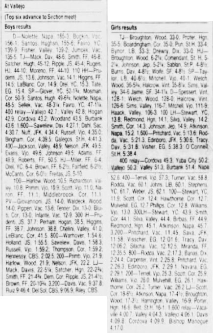 Licensed to Bella Vista High School Hy-Tek's Meet Manager Sac-Joaquin Sub-Section III Meet 5/19/1989 Vallejo High School Results Girls 100 Meter Dash Varsity ============================================================================ Name Year School Finals Wind Points ============================================================================ 1 Stewart, Kwani 11 Yuba City 11.9 NWI 2 Scott, Angie 11 Cordova 12.4 NWI 3 Hawthorne, Tamura 9 Cordova 12.7 NWI 4 Mulvehill, Melissa 10 Elk Grove 12.7 NWI 5 Phillips, X 12 Cordova 12.8 NWI 6 Williams, Chris 12 Vallejo 13.0 NWI Girls 200 Meter Dash Varsity ============================================================================ Name Year School Finals Wind Points ============================================================================ 1 Terrell, Shirly 12 Vallejo 25.3 NWI 2 Scott, Angie 11 Cordova 25.9 NWI 3 Williams Chris 12 Vallejo 26.0 NWI 4 Mulvehill, Melissa 10 Elk Grove 26.1 NWI 5 Hawthorne, Tamura 9 Cordova 26.2 NWI 6 Turner, Geri 12 Vacaville 26.2 NWI Girls 400 Meter Dash Varsity ======================================================================= Name Year School Finals Points ======================================================================= 1 Terrell, Shirly 12 Vallejo 57.3 2 Turner, Geri 12 Vacaville 58.8 3 Rodda, Michele 12 Vacaville 60.1 4 Johns, Tanisha 9 Luther Burbank 60.1 5 Stephens, Unknown 12 Yuba City 61.7 6 Weber, Andi 9 Justin-Siena 62.1 Girls 800 Meter Run Varsity ======================================================================= Name Year School Finals Points ======================================================================= 1 Rodda, Michele 12 Vacaville 2:17.3 2 Banas, Bridget 12 Dixon 2:24.4 3 Carpenter, Candace 9 Vintage 2:25.8 4 Prichard, Brooke 11 Vacaville 2:26.3 5 Edinboro, Shaune 12 Kennedy 2:29.1 6 Navarro, S. 11 Elk Grove 2:29.1 Girls 1600 Meter Run Varsity ======================================================================= Name Year School Finals Points ======================================================================= 1 Prichard, Brooke 11 Vacaville 5:13.6 2 Rodda, Michele 12 Vacaville 5:21.3 3 Edinboro, Shaune 12 Kennedy 5:30.6 4 Tracy, Sarah 12 Davis 5:31.8 5 Visscher, Sonja 11 Elk Grove 5:38.3 6 O'Connell, X 12 St Helena 5:38.4 Girls 3200 Meter Run Varsity ======================================================================= Name Year School Finals Points ======================================================================= 1 Prichard, Brooke 10 Vacaville 11:45.0 2 Sava, Emily 11 Kennedy 11:58.0 3 Visscher, Sonja 11 Elk Grove 12:01.6 4 Tracy, Sarah 12 Davis 12:06.2 5 Silachai, Joy 12 Vacaville 12:12.5 6 Miranda, Laura 12 Fairfield 12:35.5 Girls 100 Meter Hurdles Varsity ============================================================================ Name Year School Finals Wind Points ============================================================================ 1 Stewart, Kwani 11 Yuba City 13.8 NWI 2 Redmond, Nicole 12 Hogan 14.1 NWI 3 Silva, Michelle 12 Valley 14.2 NWI 4 Smith, Tanya 10 Cordova 14.3 NWI 5 Johnson, Michelle 9 Willis Jepson 14.9 NWI 6 Atkinson, Martha 12 Napa 15.2 NWI Girls 300 Meter Hurdles Varsity ======================================================================= Name Year School Finals Points ======================================================================= 1 Stewart, Kwani 11 Yuba City 43.9 2 Smith, Tanya 10 Cordova 44.1 3 Silva, Michelle 12 Valley 44.4 4 Birbas, Vicki 11 Fairfield 44.9 5 Redmond, Nicole 12 Hogan 45.1 6 Atkinson, Martha 12 Napa 45.7 Girls 4x100 Meter Relay Varsity ======================================================================= School Finals Points ======================================================================= 1 Cordova 49.3 2 Yuba City 50.2 3 Vallejo 50.3 4 Valley 51.3 5 Luther Burbank 51.4 6 Napa 52.6 Girls 4x400 Meter Relay Varsity ======================================================================= School Finals Points ======================================================================= 1 Vacaville 4:00.7 2 Valley 4:04.3 3 Vallejo 4:06.1 4 Davis 4:09.8 5 Cordova 4:09.9 6 Bishop Manogue 4:17.0 Girls High Jump Varsity ======================================================================= Name Year School Finals Points ======================================================================= 1 Broughton, JC 12 Woodland 6-02.25 2 Commendant, Tosha 11 St Helena 5-02.25 3 Johnson, Michelle 9 Willis Jepson 5-01.75 4 Sablan, Marita 11 St Patrick/St Vincent 4-08.50 5 Burris, X 12 Davis 4-08.50 6 Wolfe, X 12 St Francis 4-08.50 Girls Long Jump Varsity ============================================================================ Name Year School Finals Wind Points ============================================================================ 1 Scott, Angie 11 Cordova 18-06.50 NWI 2 Atkinson, Martha 12 Napa 17-04.50 NWI 3 Broughton, JC 12 Woodland 17-03.50 NWI 4 Harrington, Terene 9 Valley 16-09.00 NWI 5 Porter, Unknown 12 Hogan 16-06.00 NWI 6 Belt, Jocelyn 12 St Helena 16-01.00 NWI Girls Triple Jump Varsity ============================================================================ Name Year School Finals Wind Points ============================================================================ 1 Broughton, JC 12 Woodland 36-00.00 2 Porter, Unknown 12 Hogan 35-05.00 3 Boardingham, X 12 Cordova 35-00.00 4 Pun, Kelly 10 St Helena 33-04.00 5 Bynor, X 12 Luther Burbank 33-03.00 6 Drewry, Kerry 11 Dixon 33-00.00 Girls Shot Put Varsity ======================================================================= Name Year School Finals Points ======================================================================= 1 Taylor, Latesia 12 Luther Burbank 40-06.50 2 Mitchell, Danyel 11 Vallejo 40-01.00 3 Welch, Mari 12 Woodland 36-05.75 4 Halcrow, Stephanie 11 Vintage 35-08.25 5 Sims, Denise 11 Valley 34-06.00 6 Jaime, Margo 12 St Francis 34-01.25 Girls Discus Throw Varsity ==============================================================