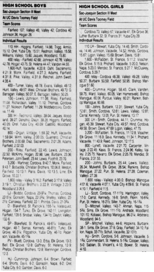 Licensed to Bella Vista High School Hy-Tek's Meet Manager Sac-Joaquin Sub-Section III Meet 5/18/1990 UC Davis Results Girls 100 Meter Dash Varsity ============================================================================ Name Year School Finals Wind Points ============================================================================ 1 Johns, Tanisha 10 Luther Burbank 12.31 NWI 2 Stewart, Kwani 12 Yuba City 12.61 NWI 3 Smith, Tanya 11 Cordova 12.61 NWI 4 Lewis, Unknown 11 Vallejo 12.81 NWI 5 Carral, X 12 Kennedy 13.05 NWI 6 Pun, Kelly 11 St Helena 13.17 NWI Girls 200 Meter Dash Varsity ============================================================================ Name Year School Finals Wind Points ============================================================================ 1 Johns, Tanisha 10 Luther Burbank 25.44 NWI 2 Lewis, Unknown 11 Vallejo 26.34 NWI 3 Mulvehill, Melissa 11 Elk Grove 26.54 NWI 4 Rankins, Ericka 12 Bishop Manogue 27.22 NWI 5 Pun, Kelly 11 St Helena 27.28 NWI 6 Coleman, Kisher 11 Vallejo 27.39 NWI Girls 400 Meter Dash Varsity ======================================================================= Name Year School Finals Points ======================================================================= 1 Crummie, LaShandra 10 Hogan 58.45 2 Clark, Maryann 12 Vanden 59.75 3 Ward, Brandy 12 Vallejo 60.05 4 Van Hamersveld, X 12 Bishop Manogue 60.06 5 Purdue, Sheree 11 Valley 60.21 6 Rankins, Ericka 12 Bishop Manogue 60.88 Girls 800 Meter Run Varsity ======================================================================= Name Year School Finals Points ======================================================================= 1 Lynette, Kristi 11 Vacaville 2:21.70 2 Carpenter, Candace 10 Vintage 2:22.45 3 Kassis, Kolleen 12 St Francis 2:24.96 4 Kelly, Tiffany 11 Valley 2:25.75 5 Navarro, S. 12 Elk Grove 2:25.78 6 Mendez, Cecilia 12 St Francis 2:31.55 Girls 1600 Meter Run Varsity ======================================================================= Name Year School Finals Points ======================================================================= 1 McFadden, Cybelle 9 St Francis 5:11.2 2 Visscher, Sonja 12 Elk Grove 5:15.9 3 Prichard, Brooke 11 Vacaville 5:20.0 4 Nelson, Danielle 9 Napa 5:23.0 5 Mendez, Cecilia 12 St Francis 5:27.7 6 McCluskey, Leanne 10 Cordova 5:29.7 Girls 3200 Meter Run Varsity ======================================================================= Name Year School Finals Points ======================================================================= 1 McFadden, Cybelle 9 St Francis 11:12.8 2 Visscher, Sonja 12 Elk Grove 11:16.9 3 Sava, Emily 12 Kennedy 11:34.1 4 Prichard, Brooke 11 Vacaville 11:43.9 5 Reed, Shannon 10 Hiram Johnson 12:17.5 Girls 100 Meter Hurdles Varsity ============================================================================ Name Year School Finals Wind Points ============================================================================ 1 Stewart, Kwani 12 Yuba City 14.45 NWI 2 Smith, Tanya 11 Cordova 14.46 NWI 3 Johnson, Michelle 10 Vacaville 14.52 NWI 4 Hinds, Legretta 11 Cordova 15.67 NWI 5 Ligon, Esher 10 Vallejo 15.69 NWI 6 Brown, Katie 11 Davis 15.81 NWI Girls 300 Meter Hurdles Varsity ======================================================================= Name Year School Finals Points ======================================================================= 1 Smith, Tanya 12 Cordova 44.11 2 Crummie, LaShandra 10 Hogan 45.39 3 Stewart, Kwani 12 Yuba City 49.57 4 Hinds, Legretta 11 Cordova 49.58 5 Brown, Katie 11 Davis 49.69 6 Ligon, Esher 10 Vallejo 49.75 Girls 4x100 Meter Relay Varsity ======================================================================= School Finals Points ======================================================================= 1 Cordova 48.38 2 Vallejo 49.28 3 Valley 50.37 4 Luther Burbank 50.59 5 Fairfield 50.95 6 Bishop Manogue 51.60 Girls 4x400 Meter Relay Varsity ======================================================================= School Finals Points ======================================================================= 1 Vallejo 4:00.0 2 Bishop Manogue 4:01.6 3 Vacaville 4:07.1 4 Yuba City 4:09.6 5 St Francis 4:10.1 6 Fairfield 4:11.5 Girls High Jump Varsity ======================================================================= Name Year School Finals Points ======================================================================= 1 Smith, Tanya 11 Cordova 5-06.00 2 Johnson, Michelle 10 Vacaville 5-01.75 3 Commendant, Tosha 12 St Helena 5-01.75 4 Cooper, Unknown 11 Vallejo 5-00.00 5 Sablan, Marita 12 St Patrick/St Vincent 4-10.00 6 Bower, Amy 12 St Helena 4-10.00 Girls Long Jump Varsity ============================================================================ Name Year School Finals Wind Points ============================================================================ 1 Scott, Angie 12 Cordova 17-11.50 NWI 2 Harrington, Terene 10 Valley 17-00.00 NWI 3 Carral, X 12 Kennedy 16-08.00 NWI 4 Smith, Theresa 10 Florin 16-06.75 NWI 5 Pun, Kelly 11 St Helena 16-02.50 NWI 6 Siller, X 12 Yuba City 16-01.75 NWI Girls Triple Jump Varsity ============================================================================ Name Year School Finals Wind Points ============================================================================ Girls Shot Put Varsity ======================================================================= Name Year School Finals Points ======================================================================= 1 Mitchell, Danyel 12 Vallejo 44-06.00 2 Hopkins, Renee 10 Luther Burbank 38-01.00 3 Sims, Denise 12 Elk Grove 37-09.00 4 Gray, Zarath 10 Fairfield 34-10.00 5 Fallon, Aronwry 12 Napa 33-07.50 6 Schull, X 12 Vacaville 32-10.50 Girls Discus Throw Varsity ======================================================================= Name Year School Finals Points ======================================================================= 1 Mitchell, Danyel 12 Vallejo 143-07 2 Ahaman, Erica 11 Napa 115-05 3 Sims