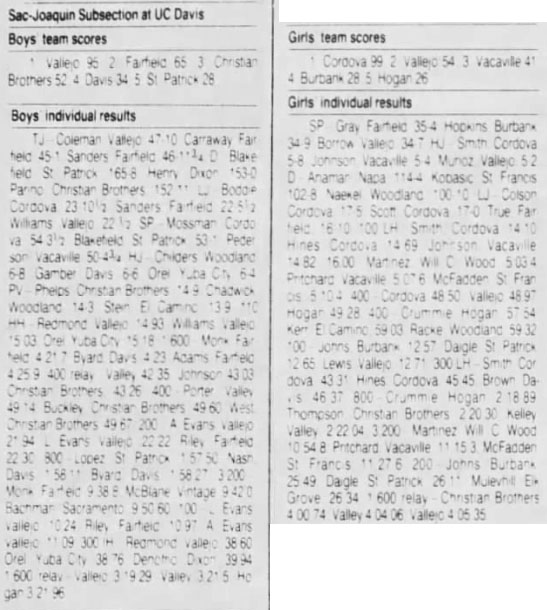 Licensed to Bella Vista High School Hy-Tek's Meet Manager Sac-Joaquin Sub-Section III Meet 5/17/1991 UC Davis Results Girls 100 Meter Dash Varsity ============================================================================ Name Year School Finals Wind Points ============================================================================ 1 Johns, Tanisha 11 Luther Burbank 12.57 NWI 2 Daigle, Angela 9 St Patrick/St Vincent 12.65 NWI 3 Lewis, Unknown 12 Vallejo 12.71 NWI Girls 200 Meter Dash Varsity ============================================================================ Name Year School Finals Wind Points ============================================================================ 1 Johns, Tanisha 11 Luther Burbank 25.49 NWI 2 Daigle, Angela 9 St Patrick/St Vincent 26.11 NWI 3 Mulvehill, Melissa 12 Elk Grove 26.34 NWI Girls 400 Meter Dash Varsity ======================================================================= Name Year School Finals Points ======================================================================= 1 Crummie, LaShandra 11 Hogan 57.54 2 Kerr, Krista 11 El Camino 59.03 3 Radke, Kristi 10 Woodland 59.32 Girls 800 Meter Run Varsity ======================================================================= Name Year School Finals Points ======================================================================= 1 Crummie, LaShandra 11 Hogan 2:18.89 2 Thompson, D 12 Christian Brothers 2:20.30 3 Kelly, Tiffany 12 Valley 2:22.02 Girls 1600 Meter Run Varsity ======================================================================= Name Year School Finals Points ======================================================================= 1 Martinez, Magi 9 Will C. Wood 5:03.4 2 Prichard, Brooke 12 Vacaville 5:07.6 3 McFadden, Cybelle 10 St Francis 5:10.4 Girls 3200 Meter Run Varsity ======================================================================= Name Year School Finals Points ======================================================================= 1 Martinez, Magi 9 Will C. Wood 10:54.8 2 Prichard, Brooke 12 Vacaville 11:15.3 3 McFadden, Cybelle 10 St Francis 11:27.6 Girls 100 Meter Hurdles Varsity ============================================================================ Name Year School Finals Wind Points ============================================================================ 1 Smith, Tanya 12 Cordova 14.10 NWI 2 Hinds, Legretta 12 Cordova 14.69 NWI 3 Johnson, Michelle 11 Vacaville 14.82 NWI Girls 300 Meter Hurdles Varsity ======================================================================= Name Year School Finals Points ======================================================================= 1 Smith, Tanya 12 Cordova 43.31 2 Hines, Legretta 12 Cordova 45.45 3 Brown, Katie 12 Davis 46.37 Girls 4x100 Meter Relay Varsity ======================================================================= School Finals Points ======================================================================= 1 Cordova 48.50 2 Vallejo 48.97 3 Hogan 49.28 Girls 4x400 Meter Relay Varsity ======================================================================= School Finals Points ======================================================================= 1 Christian Brothers 4:00.74 2 Valley 4:04.06 3 Vallejo 4:05.35 Girls High Jump Varsity ======================================================================= Name Year School Finals Points ======================================================================= 1 Smith, Tanya 12 Cordova 5-08.00 2 Johnson, Michelle 11 Vacaville 5-04.00 3 Munoz, Rheena 12 Vallejo 5-02.00 Girls Long Jump Varsity ============================================================================ Name Year School Finals Wind Points ============================================================================ 1 Colson, Tangela 11 Cordova 17-05.00 NWI 2 Scott, Angie 12 Cordova 17-00.00 NWI 3 True, Sarah 9 Fairfield 16-10.00 NWI Girls Triple Jump Varsity ============================================================================ Name Year School Finals Wind Points ============================================================================ Girls Shot Put Varsity ======================================================================= Name Year School Finals Points ======================================================================= 1 Gray, Zarath 11 Fairfield 35-04.00 2 Hopkins, Renee 11 Luther Burbank 34-09.00 3 Barrows, Unknown 11 Vallejo 34-07.00 Girls Discus Throw Varsity ======================================================================= Name Year School Finals Points ======================================================================= 1 Ahaman, Erica 12 Napa 114-04 2 Kobasic, X 12 St Francis 102-08 3 Naekel, Heidi 12 Woodland 100-10 Boys 100 Meter Dash Varsity ============================================================================ Name Year School Finals Wind Points ============================================================================ 1 Evans, Larry 12 Vallejo 10.74 NWI 2 Riley, Derrick 12 Fairfield 10.97 NWI 3 Evans, Ali 9 Vallejo 11.09 NWI Boys 200 Meter Dash Varsity ============================================================================ Name Year School Finals Wind Points ============================================================================ 1 Evans, Ali 9 Vallejo 21.94 NWI 2 Evans, Larry 12 Vallejo 22.22 NWI 3 Riley, Derrick 12 Fairfield 22.30 NWI Boys 400 Meter Dash Varsity ======================================================================= Name Year School Finals Points ======================================================================= 1 Porter, Jerome 12 Valley 49.14 2 Buckley, Monty 12 Christian Brothers 49.60 3 West, Cornel 12 Christian Brothers 49.67 Boys 800 Meter Run Varsity ======================================================================= Name Year School Finals Points ======================================================================= 1 Lopez, Emilio 12 St Patrick/St Vincent 1:57.50 2 Nusch, Florian 12 Davis 1:58.11 3 B