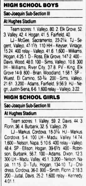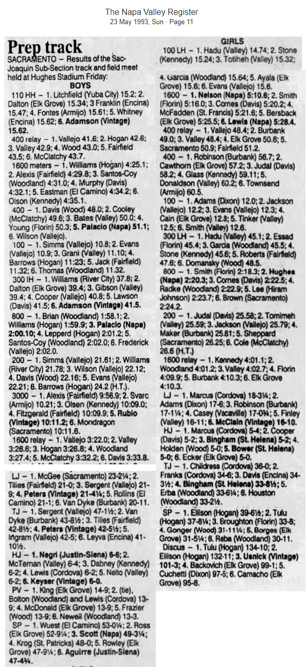 Licensed to Bella Vista High School Hy-Tek's Meet Manager Sac-Joaquin Sub-Section III Meet 5/21/1993 Hughes Stadium Results Girls 100 Meter Dash Varsity ============================================================================ Name Year School Finals Wind Points ============================================================================ 1 Adams, Tonya 9 Dixon 12.0 NWI 10 2 Jackson, Tiffany 11 Vallejo 12.2 NWI 8 3 Evans, X 12 Vallejo 12.3 NWI 6 4 Cain, Kya 12 Elk Grove 12.5 NWI 4 5 Tinker, Julie 9 Valley 12.5 NWI 2 6 Smith, Iana 12 Valley 12.6 NWI 1 Girls 200 Meter Dash Varsity ============================================================================ Name Year School Finals Wind Points ============================================================================ 1 Judal, Noel 11 Davis 25.58 NWI 10 2 Totimeh, Dawah 10 Valley 25.59 NWI 8 3 Jackson, Tiffany 11 Vallejo 25.79 NWI 6 4 Maker, Jonniquenett 11 Luther Burbank 25.81 NWI 4 5 Sheppard, Felicia 12 Sacramento 26.25 NWI 2 6 Cole, Phyliss 12 McClatchy 26.84 NWI 1 Girls 400 Meter Dash Varsity ======================================================================= Name Year School Finals Points ======================================================================= 1 Robinson, Marlene 11 Luther Burbank 56.7 10 2 Cawthorn, Nicole 12 Elk Grove 57.2 8 3 Judal, Noel 11 Davis 58.2 6 4 Glass, Monique 10 Kennedy 59.1 4 5 Donaldson, Nadine 10 Valley 60.2 2 6 Townsend, Marie 10 Armijo 60.5 1 Girls 800 Meter Run Varsity ======================================================================= Name Year School Finals Points ======================================================================= 1 Smith, Theresa 12 Florin 2:18.3 10 2 Hughes, Kelly 10 Napa 2:20.3 8 3 Cornes, Saskia 9 Davis 2:22.5 6 4 Radke, Kristi 12 Woodland 2:22.9 4 5 Lee, Barbara 11 Hiram Johnson 2:23.7 2 6 Brown, Nola 12 Sacramento 2:24.2 1 Girls 1600 Meter Run Varsity ======================================================================= Name Year School Finals Points ======================================================================= 1 Nelson, Danielle 12 Napa 5:10.6 10 2 Smith, Theresa 12 Florin 5:16.0 8 3 Cornes, Saskia 9 Davis 5:20.2 6 4 McFadden, Cybelle 12 St Francis 5:21.6 4 5 Bersbach, Delee 10 Elk Grove 5:25.5 2 6 Lewis, Darci 10 Napa 5:28.4 1 Girls 3200 Meter Run Varsity ======================================================================= Name Year School Finals Points ======================================================================= 1 Nelson, Danielle 12 Napa 11:15.0 10 Girls 100 Meter Hurdles Varsity ============================================================================ Name Year School Finals Wind Points ============================================================================ 1 Madu, Chidera 11 Valley 14.74 NWI 10 2 Stone, Felicia 11 Kennedy 15.24 NWI 8 3 Totimeh, Dawah 10 Valley 15.32 NWI 6 4 Garcia, Sara 12 Woodland 15.64 NWI 4 5 Ayala, Andrea 11 Elk Grove 15.84 NWI 2 6 Evans, X 12 Vallejo 15.84 NWI 1 Girls 300 Meter Hurdles Varsity ======================================================================= Name Year School Finals Points ======================================================================= 1 Madu, Chidera 11 Valley 45.1 10 2 Essad, Wendy 12 Florin 45.4 8 3 Garcia, Sara 12 Woodland 45.5 6 4 Stone, Felicia 11 Kennedy 45.6 4 5 Roberts, Dunia 10 Fairfield 47.6 2 6 Domansky, Julia 9 Will C. Wood 48.5 1 Girls 4x100 Meter Relay Varsity ======================================================================= School Finals Points ======================================================================= 1 Vallejo 48.4 10 2 Luther Burbank 49.0 8 3 Valley 49.4 6 4 Elk Grove 50.6 4 5 Sacramento 50.9 2 6 Fairfield 51.2 1 Girls 4x400 Meter Relay Varsity ======================================================================= School Finals Points ======================================================================= 1 Kennedy 4:01.1 10 2 Woodland 4:01.2 8 3 Valley 4:02.7 6 4 Florin 4:09.9 4 5 Luther Burbank 4:10.3 2 6 Elk Grove 4:10.3 1 Girls High Jump Varsity ======================================================================= Name Year School Finals Points ======================================================================= 1 Markus, Melanie 10 Cordova 5-04.00 10 2 Cooper, Carrie 12 Davis 5-02.00 8 3 Bingham, Janet 11 St Helena 5-02.00 6 4 Holden, Tait 9 Will C. Wood 5-00.00 4 5 Bower, Amy 12 St Helena 5-00.00 2 6 Ecker, Endre 12 Elk Grove 5-00.00 1 Girls Long Jump Varsity ============================================================================ Name Year School Finals Wind Points ============================================================================ 1 Markus, Melanie 10 Cordova 18-03.25 NWI 10 2 Adams, Tonya 9 Dixon 17-06.00 NWI 8 3 Robinson, Marlene 11 Luther Burbank 17-01.25 NWI 6 4 Casey, Karen 11 Vacaville 17-00.75 NWI 4 5 Finley, X 12 Valley 16-11.00 NWI 2 6 McClain, X 12 Vintage 16-10.00 NWI 1 Girls Triple Jump Varsity ============================================================================ Name Year School Finals Wind Points ============================================================================ 1 Childress, Khalilah 11 Cordova 36-00.00 NWI 10 2 Franks, X 12 Cordova 34-06.00 NWI 8 3 Davis, Danielle 10 Encina 34-03.50 NWI 6 4 Bingham, Janet 11 St Helena 33-08.50 NWI 4 5 Erba, Stephanie 11 Woodland 33-06.25 NWI 2 6 Houston, Unknown 10 Woodland 33-02.50 NWI 1 Girls Shot Put Varsity ======================================================================= Name Year School Finals Points ======================================================================= 1 Ellison, Sherita 11 Hogan 39-06.50 10 2 Tufu, Jeannie 11 Hogan 37-08.25 8 3 Broughton, Tamara 10 Florin 33-08.00 6 4 Gonger, X 12 Will C. Wood 31-11.25 4 5 Borges, Julie 11 Elk Grove 31-05.25 2 6 Erba, Stephanie 11 Woodland 30-11.00 1 Girls Discus Throw Varsity ======================================================================= Name Year School Finals Points
