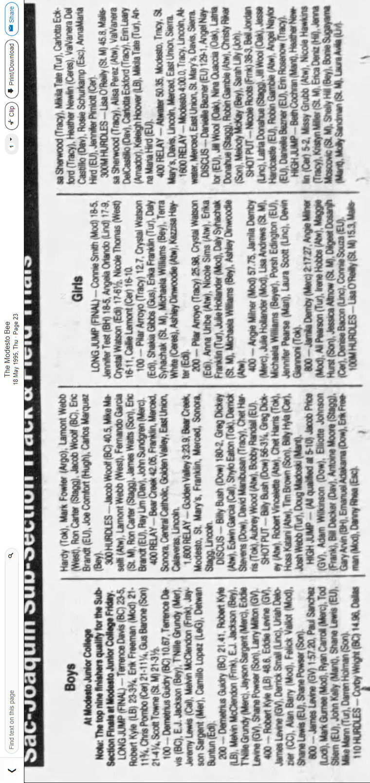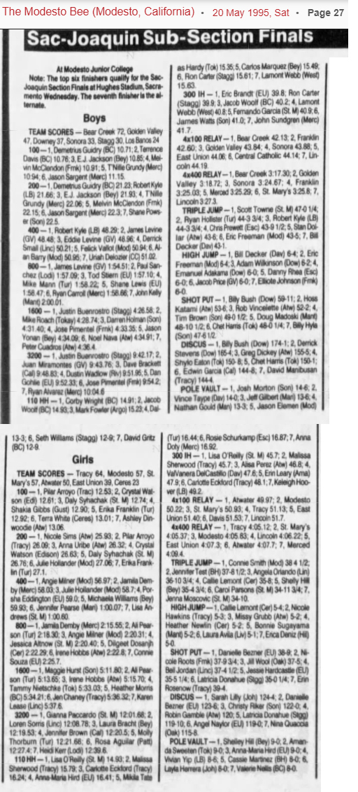 Licensed to Bella Vista High School Hy-Tek's Meet Manager Sac-Joaquin Sub-Section I Meet 5/19/1995 Modesto Junior College Results Girls 100 Meter Dash Varsity ============================================================================ Name Year School Finals Wind Points ============================================================================ 1 Arroyo, Pilar 11 Tracy 12.53 2 Watson, Crystal 11 Edison 12.61 3 Syhachack, Daly 11 St Mary's 12.74 4 Gibbs, Shakia 12 Gustine 12.90 5 Franklin, Erica 11 Turlock 12.92 6 White, Terra 12 Ceres 13.01 7 Dinwoodie, Ashley 10 Atwater 13.06 Girls 200 Meter Dash Varsity ======================================================================== Name Year School Finals Wind H# ======================================================================== 1 Sims, Nicole 9 Atwater 25.93 2 Arroyo, Pilar 11 Tracy 26.09 3 Uribe, Anna 12 Atwater 26.32 4 Watson, Crystal 11 Edison 26.63 5 Syhachack, Daly 11 St Mary's 26.76 6 Hollander, Julie 11 Modesto 27.06 7 Franklin, Erica 11 Turlock 27.10 Girls 400 Meter Dash Varsity =================================================================== Name Year School Finals =================================================================== 1 Milner, Angie 10 Modesto 56.97 2 Demby, Jamila 12 Merced 58.03 3 Hollander, Julie 11 Modesto 58.70 4 Edington, Porsha 11 East Union 59.00 5 Williams, Michaela 9 Beyer 59.93 6 Pearse, Jennifer 12 Mariposa 1:00.07 7 Andrews, Lisa 12 St Mary's 1:00.60 Girls 800 Meter Run Varsity =================================================================== Name Year School Finals =================================================================== 1 Demby, Jamila 12 Merced 2:15.55 2 Pearson, Ali 11 Turlock 2:18.30 3 Milner, Angie 10 Modesto 2:20.31 4 Altnow, Jessica 10 St Mary's 2:20.40 5 Dosanjh, Dilgeet 12 Ceres 2:22.29 6 Hobbs, Irene 12 Atwater 2:22.80 7 Souza, Connie 10 East Union 2:25.70 Girls 1600 Meter Run Varsity ======================================================================= Name Year School Finals ======================================================================= 1 Hurst, Maggie 12 Sonora 5:11.80 2 Pearson, Ali 11 Turlock 5:13.65 3 Hobbs, Irene 12 Atwater 5:15.70 4 Nietske, Tammy 11 Tokay 5:33.03 5 Morris, Heather 11 Bear Creek 5:34.21 6 Chaney, Jen 11 Tracy 5:36.32 7 Lease, Karen 12 Lincoln 5:37.60 Girls 3200 Meter Run Varsity ======================================================================= Name Year School Finals Points ======================================================================= 1 Paccardo, Gianna 12 St Mary's 12:01.68 2 Sorris, Loren 12 Lincoln 12:08.78 3 Bracht, Laura 12 Beyer 12:19.53 4 Brown, Jennifer 12 Calaveras 12:20.50 5 Thorburn, Molly 12 Turlock 12:21.68 6 Aguilar, Rosa 12 Patterson 12:27.40 7 Kerr, Heidi 12 Lodi 12:39.30 Girls 100 Meter Hurdles Varsity ======================================================================== Name Year School Finals Wind ======================================================================== 1 O'Reilly, Lisa 11 St Marys 14.93 2 Sherwood, Malissa 12 Tracy 15.79 3 Eckford, Carlotta 11 Tracy 16.24 4 Hird, Anna-Maria 12 East Union 16.41 5 Tate, Mickila 10 Turlock 16.44 6 Schurkamp, Rosie 11 Escalon 16.87 7 Doty, Anna 9 Merced 16.92 Girls 300 Meter Hurdles Varsity ======================================================================= Name Year School Finals Points ======================================================================= 1 O'Reilly, Lisa 10 St Marys 45.7 2 Sherwood, Malissa 12 Tracy 45.7 3 Perez, Alisa 12 Atwater 46.8 4 Del Castillo, Valvanera 12 Grace Davis 47.6 5 Leary, Erin 12 Amador 47.9 6 Eckford, Carlotta 11 Tracy 48.1 7 Hoover, Keleigh 11 Los Banos 49.2 Girls 4x100 Meter Relay Varsity =================================================================== School Finals =================================================================== 1 Atwater 49.97 2 Modesto 50.22 3 St Mary's 50.93 4 Tracy 51.13 5 East Union 51.40 6 Grace Davis 51.53 7 Lincoln 51.70 Girls 4x400 Meter Relay Varsity ======================================================================= School Finals Points ======================================================================= 1 Tracy 4:05.12 2 St Mary's 4:05.37 3 Modesto 4:05.83 4 Lincoln 4:06.22 5 East Union 4:07.30 6 Atwater 4:07.70 7 Merced 4:09.40 Girls High Jump Varsity ======================================================================= Name Year School Finals Points ======================================================================= 1 Lemont, Callie 10 Ceres 5-04.00 2 Hawkins, Nicole 10 Tracy 5-03.00 3 Grubb, Missy 10 Atwater 5-02.00 4 Newlin, Heather 11 Ceres 5-02.00 5 Sugayama, Bonnie 12 Manteca 5-02.00 6 Avila, Laura 10 Livingston 5-01.00 7 Deniz, Erica 12 Hilmar 5-00.00 Girls Pole Vault Varsity ======================================================================= Name Year School Finals Points ======================================================================= 1 Hill, Shelley 11 Beyer 9-00.00 2 Sweeten, Amanda 9 Tokay 9-00.00 3 Hird, Anna-Maria 12 East Union 9-00.00 4 Yip, Vivian 11 Los Banos 8-06.00 5 Martinez, Cassie 11 Bret Harte 8-00.00 6 Herrera, Layla 12 Johansen 8-00.00 7 Nellis, Valerie 10 Bear Creek 8-00.00 Girls Long Jump Varsity ============================================================================ Name Year School Finals Wind Points ============================================================================ 1 Smith, Connie 11 Modesto 18-05.00 2 Test, Jennifer 12 Bret Harte 18-05.00 3 Orlando, Angela 12 Linden 17-09.00 4 Watson, Crystal 11 Edison 17-06.50 5 Thomas, Nicole 11 Merrill West 16-11.00 6 Lemont, Callie 10 Ceres 16-10.00 Girls Triple Jump Varsity ============================================================================ Name Year School Finals Wind Points ============================================================================ 1 Smith, Connie 11 Modesto 38-04.50 2 Test, Jennifer 12 Bret Harte 37-08.50 3 Orlando, Angela 12 Linden 36