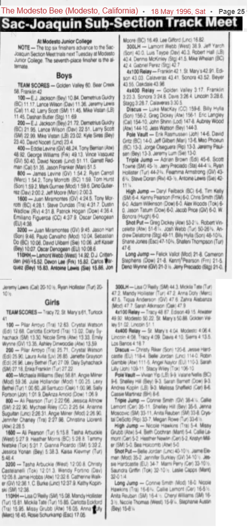 Licensed to Bella Vista High School Hy-Tek's Meet Manager Sac-Joaquin Sub-Section I Meet 5/17/1996 Modesto Junior College Results Girls 100 Meter Dash Varsity ============================================================================ Name Year School Finals Wind Points ============================================================================ 1 Arroyo, Pilar 12 Tracy 12.63 2 Watson, Crystal 12 Edison 12.68 3 Eckford, Carlotta 12 Tracy 13.02 4 Syhachack, Daly 12 St Mary's 13.30 5 Sims, Nicole 10 Atwater 13.33 6 Wynne, Emily 11 Golden Valley 13.35 7 Dinwoodie, Ashley 11 Atwater 13.59 Girls 200 Meter Dash Varsity ======================================================================== Name Year School Finals Wind H# ======================================================================== 1 Arroyo, Pilar 12 Tracy 25.71 2 Watson, Crystal 12 Edison 25.90 3 Avila, Laura 11 Livingston 26.85 4 Grayson, Jynette 11 Edison 26.96 5 Bethel, Lexy 11 Turlock 27.09 6 Syhachack, Daly 12 St Mary's 27.18 7 Franklin, Erika 11 Turlock 27.22 Girls 400 Meter Dash Varsity =================================================================== Name Year School Finals =================================================================== 1 Williams, Michaela 10 Beyer 58.81 2 Milner, Angie 11 Modesto 59.36 3 Hollander, Julie 12 Modesto 1:00.25 4 Bethel, Lexy 11 Turlock 1:00.60 5 Santucci, Jill 11 Oakdale 1:00.98 6 Fortson, Sally 9 Johansen 1:01.90 7 Arnold, DeAnza 12 Downey 1:06.90 Girls 800 Meter Run Varsity =================================================================== Name Year School Finals =================================================================== 1 Pearson, Ali 12 Turlock 2:22.06 2 Altnow, Jessica 11 St Mary's 2:22.90 3 Riley, Mychael 10 Central Catholic 2:25.64 4 Suguitan, Arianne 11 Lincoln 2:26.31 5 Milner, Angie 11 Modesto 2:26.90 6 Chaney, Jennifer 12 Tracy 2:27.98 7 Llorenti, Christina 12 Atwater 2:28.50 Girls 1600 Meter Run Varsity ======================================================================= Name Year School Finals ======================================================================= 1 Pearson, Ali 12 Turlock 5:15.8 2 Arbuckle, Tasha 9 Merrill West 5:27.9 3 Morris, Heather 12 Bear Creek 5:28.8 4 Nietske, Tammy 12 Tokay 5:31.7 5 Picardo, Gianna 12 St Mary's 5:32.2 6 Yonan, Jessica 10 Beyer 5:38.3 7 Kiavmyr, Kaisa 12 Turlock 5:48.4 Girls 3200 Meter Run Varsity ======================================================================= Name Year School Finals Points ======================================================================= 1 Arbuckle, Tasha 9 Merrill West 12:00.8 2 Castelanelli, Christy 12 Tokay 12:01.3 3 Fortino, Wendy 9 Grace Davis 12:05.8 4 Hobbs, Jamie 12 Atwater 12:32.6 5 Walker, Catherine 9 Golden Valley 12:36.1 6 Burke, Christy 12 Lincoln 12:37.9 7 Kopinski, Kathy 12 St Mary's 12:38.0 Girls 100 Meter Hurdles Varsity ======================================================================== Name Year School Finals Wind ======================================================================== 1 O'Reilly, Lisa 11 St Marys 15.08 2 Hollister, Mandy 9 Turlock 15.81 3 Tate, Mickila 11 Turlock 15.85 4 Eckford, Carlotta 12 Tracy 15.95 5 Grubb, Missy 11 Atwater 16.05 6 Doty, Anna 9 Merced 16.45 7 Schurkamp, Rosie 12 Escalon 17.05 Girls 300 Meter Hurdles Varsity ======================================================================= Name Year School Finals Points ======================================================================= 1 O'Reilly, Lisa 11 St Marys 44.3 2 Tate, Mickila 11 Turlock 47.2 3 Hollister, Mandy 9 Turlock 47.2 4 Doty, Anna 9 Merced 47.5 5 Anderson, Tiqua 12 Golden Valley 47.6 6 Alabanza, Zahra 10 Modesto 47.7 7 Atkinson, Sarah 12 Oakdale 47.9 Girls 4x100 Meter Relay Varsity =================================================================== School Finals =================================================================== 1 Tracy 48.87 2 Edison 49.15 3 Atwater 49.92 4 Modesto 50.22 5 St Mary's 50.88 6 Golden Valley 51.02 7 Lincoln 51.10 Girls 4x400 Meter Relay Varsity ======================================================================= School Finals Points ======================================================================= 1 St Mary's 4:04.0 2 Modesto 4:06.4 3 Lincoln 4:08.0 4 Tracy 4:09.0 5 Grace Davis 4:10.0 6 Sierra 4:13.5 7 Los Banos 4:18.7 Girls High Jump Varsity ======================================================================= Name Year School Finals Points ======================================================================= 1 Hawkins, Nicole 11 Tracy 5-04.00 2 Grubb, Missy 11 Atwater 5-04.00 3 Cochran, Elizabeth 12 Manteca 5-04.00 4 Lemont, Callie 11 Ceres 5-02.00 5 Newlin, Heather 12 Ceres 5-02.00 6 Miller, Kristyn 10 St Mary's 5-00.00 7 Holcomb, Bea 12 Atwater 5-00.00 Girls Pole Vault Varsity ======================================================================= Name Year School Finals Points ======================================================================= 1 Yip, Vivian 12 Los Banos 9-09.00 2 Nellis, Valerie 11 Bear Creek 9-06.00 3 Hill, Shelley 12 Beyer 9-03.00 4 Barnett, Sarah 10 Downey 9-03.00 5 Koplin, Andrea 9 Los Banos 9-03.00 6 Sheffeld, Melissa 12 Ceres 8-06.00 7 Martinez, Cassie 12 Bret Harte 8-06.00 Girls Long Jump Varsity ============================================================================ Name Year School Finals Wind Points ============================================================================ 1 Smith, Connie 12 Modesto 18-00.00 2 Hawkins, Nicole 11 Tracy 16-06.75 3 Lemont, Callie 11 Ceres 16-05.50 4 Reuban, Anita 10 St Mary's 16-04.50 5 Williams, Cheryl 11 St Marys 16-03.50 6 Thomas, Nicole 12 Merrill West 15-09.25 7 Austin, Stephanie 11 Beyer 15-08.25 Girls Triple Jump Varsity ============================================================================ Name Year School Finals Wind Points ============================================================================ 1 Smith, Connie 12 Modesto 38-04.25