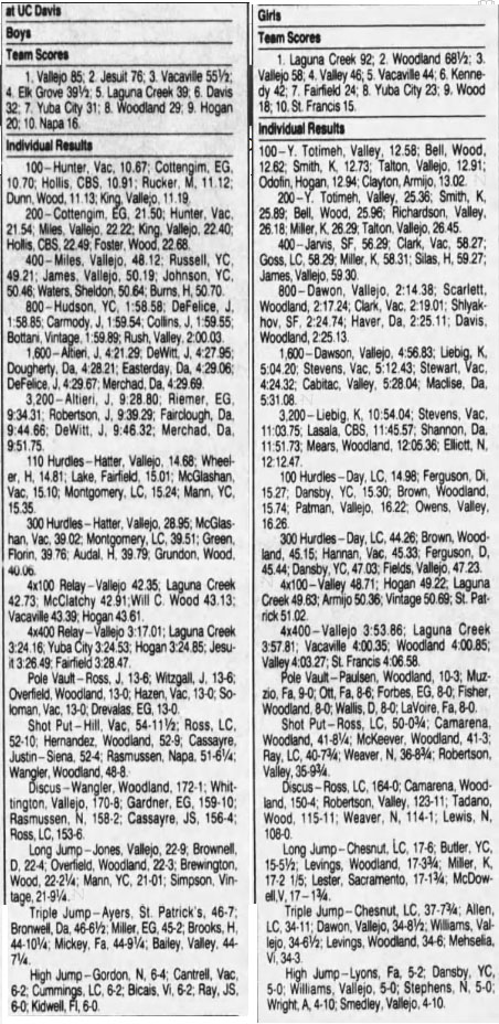 Licensed to Bella Vista High School Hy-Tek's Meet Manager Sac-Joaquin Sub-Section III Meet 5/22/1998 U.C. Davis Results Girls 100 Meter Dash Varsity ============================================================================ Name Year School Finals Wind Points ============================================================================ 1 Totimeh, Yahvoh 12 Valley 12.58 NWI 10 2 Bell, Carina 12 Will C. Wood 12.62 NWI 8 3 Smith, Shequilla 12 Kennedy 12.73 NWI 6 4 Talton, Ordenda 11 Vallejo 12.91 NWI 4 5 Odolin, X 12 Hogan 12.94 NWI 2 6 Clayton, Amber 11 Armijo 13.02 NWI 1 Girls 200 Meter Dash Varsity ============================================================================ Name Year School Finals Wind Points ============================================================================ 1 Totimeh, Yahvoh 12 Valley 25.36 NWI 10 2 Smith, Shequilla 12 Kennedy 25.89 NWI 8 3 Bell, Carina 12 Will C. Wood 25.96 NWI 6 4 Richardson, Unknown 12 Valley 26.18 NWI 4 5 Miller, Vishani 11 Kennedy 26.29 NWI 2 6 Talton, Ordenda 11 Vallejo 26.45 NWI 1 Girls 400 Meter Dash Varsity ======================================================================= Name Year School Finals Points ======================================================================= 1 Jarvis, Chloe 10 St Francis 56.29 10 2 Clark, Heather 11 Vacaville 58.27 8 3 Goss, Sheena 10 Laguna Creek 58.29 6 4 Miller, Vishani 11 Kennedy 58.31 4 5 Silas, Ilia 10 Hogan 59.27 2 6 James, X 12 Vallejo 59.30 1 Girls 800 Meter Run Varsity ======================================================================= Name Year School Finals Points ======================================================================= 1 Dawson, Spring 10 Vallejo 2:14.38 10 2 Scarlet, Katie 10 Woodland 2:17.24 8 3 Clark, Heather 11 Vacaville 2:19.01 6 4 Shlyakhov, Sonia 11 St Francis 2:24.74 4 5 Haver, Andrea 12 Davis 2:25.11 2 6 Davis, Kayla 12 Woodland 2:25.13 1 Girls 1600 Meter Run Varsity ======================================================================= Name Year School Finals Points ======================================================================= 1 Dawson, Spring 10 Vallejo 4:56.83 10 2 Liebig, Yvonne 12 Kennedy 5:04.20 8 3 Stevens, Robyn 10 Vacaville 5:12.43 6 4 Stewart, Rachelle 12 Vacaville 5:24.32 4 5 Cabitac, Andrea 9 Valley 5:28.04 2 6 Maclise, Lindsey 9 Davis 5:31.08 1 Girls 3200 Meter Run Varsity ======================================================================= Name Year School Finals Points ======================================================================= 1 Liebig, Yvonne 12 Kennedy 10:54.04 10 2 Stevens, Robyn 10 Vacaville 11:03.75 8 3 Lasala, Michelle 12 Christian Brothers 11:45.57 6 4 Shannon, Molly 12 Davis 11:51.73 4 5 Mears, Jennifer 12 Woodland 12:05.36 2 6 Elliott, Caitlin 11 Napa 12:12.47 1 Girls 100 Meter Hurdles Varsity ============================================================================ Name Year School Finals Wind Points ============================================================================ 1 Day, Chanel 11 Laguna Creek 14.98 NWI 10 2 Ferguson, Melissa 12 Dixon 15.27 NWI 8 3 Dansby, Dawn 11 Yuba City 15.30 NWI 6 4 Brown, Sarah 12 Woodland 15.74 NWI 4 5 Patman, X 12 Vallejo 16.22 NWI 2 6 Owens, Unknown 12 Valley 16.26 NWI 1 Girls 300 Meter Hurdles Varsity ======================================================================= Name Year School Finals Points ======================================================================= 1 Day, Chanel 11 Laguna Creek 44.26 10 2 Brown, Sarah 12 Woodland 45.15 8 3 Hannan, Linda 11 Vacaville 45.33 6 4 Ferguson, Melissa 12 Dixon 45.44 4 5 Dansby, Dawn 11 Yuba City 47.03 2 6 Fields, Danielle 11 Vallejo 47.23 1 Girls 4x100 Meter Relay Varsity ======================================================================= School Finals Points ======================================================================= 1 Vallejo 48.71 10 2 Hogan 49.22 8 3 Laguna Creek 49.63 6 4 Armijo 50.36 4 5 Vintage 50.69 2 6 St Patrick/St Vincent 51.02 1 Girls 4x400 Meter Relay Varsity ======================================================================= School Finals Points ======================================================================= 1 Vallejo 3:53.86 10 2 Laguna Creek 3:57.81 8 3 Vacaville 4:00.35 6 4 Woodland 4:00.85 4 5 Valley 4:03.27 2 6 St Francis 4:06.58 1 Girls High Jump Varsity ======================================================================= Name Year School Finals Points ======================================================================= 1 Lyons, Mandisa 12 Fairfield 5-02.00 10 2 Dansby, Dawn 11 Yuba City 5-00.00 8 3 Williams, Savannah 9 Vallejo 5-00.00 6 4 Stephens, Mandy 11 Napa 5-00.00 4 5 Wright, Telita 10 Armijo 4-10.00 2 6 Smedley, Jessica 10 Vallejo 4-10.00 1 Girls Pole Vault Varsity ======================================================================= Name Year School Finals Points ======================================================================= 1 Paulsen, Wendy 11 Woodland 10-03.00 10 2 Muzzio, Jamie 12 Fairfield 9-00.00 8 3 Ott, Karen 11 Fairfield 8-06.00 6 4 Forbes, Lydsey 12 Elk Grove 8-00.00 4 5 Fisher, Ali 9 Woodland 8-00.00 2 6 Wallis, X 12 Davis 8-00.00 0.5 6 LaVoire, Michelle 12 Fairfield 8-00.00 0.5 Girls Long Jump Varsity ============================================================================ Name Year School Finals Wind Points ============================================================================ 1 Chesnut, Lauren 10 Laguna Creek 17-06.00 NWI 10 2 Butler, Abbey 9 Yuba City 17-05.50 NWI 8 3 Levings, Kristy 12 Woodland 17-03.75 NWI 6 4 Miller, Vishani 10 Kennedy 17-02.25 NWI 4 5 Lester, Rashida 11 Sacramento 17-01.75 NWI 2 6 McDowell, Beyonka 10 Vallejo 17-01.75 NWI 1 Girls Triple Jump Varsity ============================================================================ Name Year School Finals Wind Points ============================================================================ 1 Chesnut, Lauren 10 Laguna Creek 37-07.75 NWI 10 2 Allen, Cor
