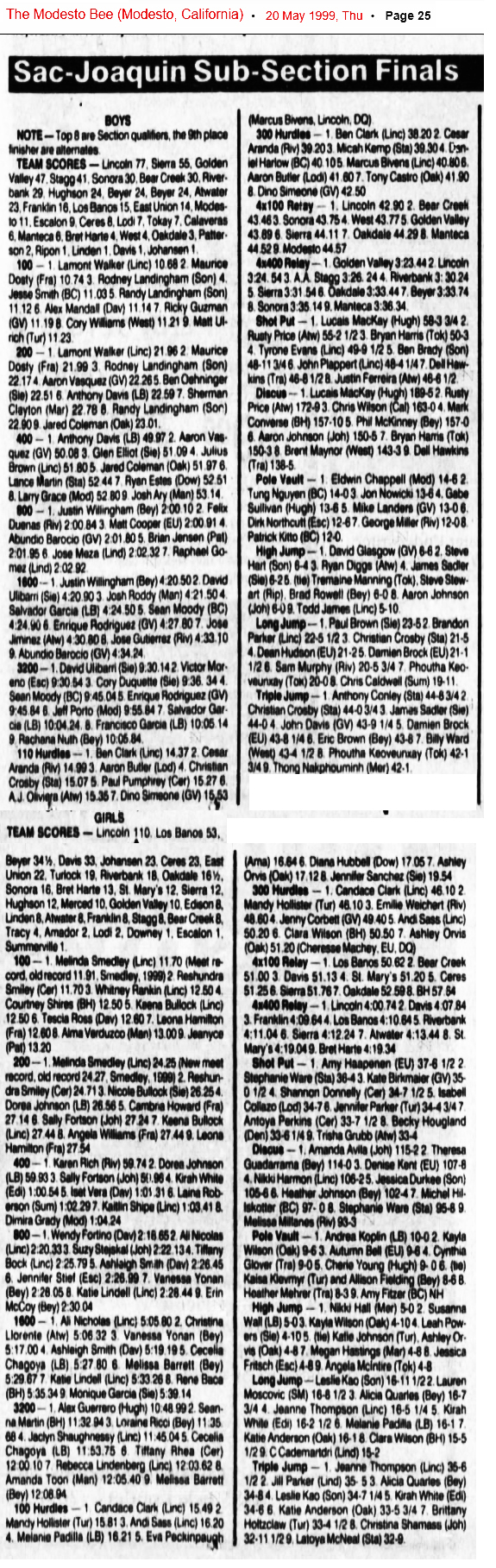Licensed to Bella Vista High School Hy-Tek's Meet Manager Sac-Joaquin Sub-Section I Meet 5/19/1999 Modesto Junior College Results Girls 100 Meter Dash Varsity ============================================================================ Name Year School Finals Wind Points ============================================================================ 1 Smedley, Melinda 12 Lincoln 11.94 2 Smiley, Reshundra 10 Ceres 11.94 3 Rankin, Whitney 12 Lincoln 12.74 4 Shires, Courtney 10 Bret Harte 12.74 5 Bullock, Keena 11 Lincoln 12.74 6 Ross, Tescia 12 Grace Davis 12.84 7 Hamilton, Leona 11 Franklin 12.84 8 Verduzco, Alma 12 Manteca 13.00 9 Thompson, Jeanyce 12 Patterson 13.20 Girls 200 Meter Dash Varsity ======================================================================== Name Year School Finals Wind H# ======================================================================== 1 Smedley, Melinda 12 Lincoln 24.25 2 Smiley, Reshundra 10 Ceres 24.71 3 Bullock, Nicole 10 Sierra 26.52 4 Johnson, Dorea 10 Los Banos 26.56 5 Howard, Cambria 12 Franklin 27.14 6 Fortson, Sally 12 Johansen 27.24 7 Bullock, Keena 11 Lincoln 27.44 8 Williams, Angela 12 Franklin 27.44 9 Hamilton, Leona 11 Franklin 27.54 Girls 400 Meter Dash Varsity =================================================================== Name Year School Finals =================================================================== 1 Rich, Karen 12 Riverbank 59.74 2 Johnson, Dorea 10 Los Banos 59.93 3 Fortson, Sally 12 Johansen 59.96 4 White, Kirah 9 Edison 1:00.54 5 Vera, Iset 12 Grace Davis 1:01.31 6 Roberson, Laina 12 Summerville 1:02.29 7 Shipe, Kaitlin 12 Lincoln 1:03.41 8 Grady, Dimira 12 Modesto 1:04.64 Girls 800 Meter Run Varsity =================================================================== Name Year School Finals =================================================================== 1 Fortino, Wendy 12 Grace Davis 2:18.65 2 Nicolas, Ali 11 Lincoln 2:20.33 3 Stejskal, Suzy 12 Johansen 2:22.13 4 Bock, Tiffany 11 Lincoln 2:25.79 5 Smith, Ashleigh 11 Grace Davis 2:26.45 6 Steif, Jennifer 11 Escalon 2:26.99 7 Yonan, Vanessa 12 Beyer 2:28.05 8 Lindell, Katie 11 Lincoln 2:28.44 9 McCoy, Erin 9 Beyer 2:30.04 Girls 1600 Meter Run Varsity ======================================================================= Name Year School Finals ======================================================================= 1 Nicolas, Ali 11 Lincoln 5:05.80 2 Llorente, Christina 12 Atwater 5:06.32 3 Yonan, Vanessa 12 Beyer 5:17.00 4 Smith, Ashleigh 11 Grace Davis 5:19.19 5 Chagoya, Cecelia 12 Los Banos 5:27.80 6 Barrett, Mellisa 11 Beyer 5:29.67 7 Lindell, Katie 11 Lincoln 5:33.26 8 Baca, Rene 9 Bret Harte 5:35.34 9 Garcia, Monique 11 Sierra 5:39.14 Girls 3200 Meter Run Varsity ======================================================================= Name Year School Finals Points ======================================================================= 1 Guerrero, Alexandra 11 Hughson 10:48.99 2 Martin, Seanna 9 Bret Harte 11:32.94 3 Ricci, Loraine 12 Beyer 11:35.68 4 Shaughnessy, Jaclyn 11 Lincoln 11:45.04 5 Chagoya, Cecelia 11 Los Banos 11:53.75 6 Rhea, Tiffany 12 Ceres 12:00.10 7 Lindenberg, Rebecca 12 Lincoln 12:03.62 8 Toon, Amanda 9 Manteca 12:05.40 9 Barrett, Mellisa 11 Beyer 12:08.94 Girls 100 Meter Hurdles Varsity ======================================================================== Name Year School Finals Wind ======================================================================== 1 Clark, Candace 10 Lincoln 15.49 2 Hollister, Mandy 12 Turlock 15.81 3 Sass, Andi 10 Lincoln 16.20 4 Padilla, Melanie 12 Los Banos 16.21 5 Peckinpaugh, Eva 12 Amador 16.64 6 Hubbell, Diana 12 Downey 17.05 7 Orvis, Ashley 9 Oakdale 17.12 8 Sanchez, Jennifer 10 Sierra 19.54 Girls 300 Meter Hurdles Varsity ======================================================================= Name Year School Finals Points ======================================================================= 1 Clark, Candace 10 Lincoln 46.24 2 Hollister, Mandy 12 Turlock 46.24 3 Weichert, Emilie 11 Riverbank 48.74 4 Corbett, Jenny 12 Golden Valley 49.54 5 Sass, Andi 10 Lincoln 50.34 6 Wilson, Clara 12 Bret Harte 50.64 7 Orvis, Ashley 9 Oakdale 51.34 8 Machey, Cheresse 12 East Union DQ Girls 4x100 Meter Relay Varsity =================================================================== School Finals =================================================================== 1 Los Banos 50.62 2 Bear Creek 51.00 3 Grace Davis 51.13 4 St Mary's 51.20 5 Ceres 51.25 6 Sierra 51.76 7 Oakdale 52.59 8 Bret Harte 57.64 Girls 4x400 Meter Relay Varsity ======================================================================= School Finals Points ======================================================================= 1 Lincoln 4:00.74 2 Grace Davis 4:07.84 3 Franklin 4:09.64 4 Los Banos 4:10.64 5 Riverbank 4:11.04 6 Sierra 4:12.24 7 Atwater 4:13.44 8 St Mary's 4:19.04 9 Bret Harte 4:19.34 Girls High Jump Varsity ======================================================================= Name Year School Finals Points ======================================================================= 1 Hall, Nikki 11 Merced 5-00.00 2 Wall, Susanna 12 Los Banos 5-00.00 3 Wilson, Kayla 11 Oakdale 4-10.00 4 Powers, Leah 11 Sierra 4-10.00 5 Johnson, Katie 11 Turlock 4-10.00 5 Orvis, Ashley 9 Oakdale 4-10.00 7 Hastings, Megan 12 Mariposa 4-08.00 8 Fritsch, Jessica 12 Escalon 4-08.00 9 McIntire, Angela 12 Tokay 4-08.00 Girls Pole Vault Varsity ======================================================================= Name Year School Finals Points ======================================================================= 1 Koplin, Andrea 12 Los Banos 10-00.00 2 Wilson, Kayla 11 Oakdale 9-06.00 3 Bell, Autumn 12 East Union 9-06.00 4 Glover, Cynthia 12 Tracy 9-00.00 5 Young, Cherie 12 Hughson 9-00.00 6 Klevmyr, Kaisa 12 Turlock 8-06.00 6 Fielding, Allison 12 Beyer 8-06.00 8 Mehrer, Heather 12 Tracy 8-03.00 9 Fitzer, Amy 12 Bear Creek NH Girls Long Jump Varsity ============
