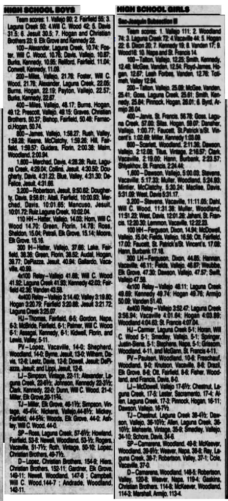Licensed to Bella Vista High School Hy-Tek's Meet Manager Sac-Joaquin Sub-Section III Meet 5/21/1999 U.C. Davis Results Girls 100 Meter Dash Varsity ============================================================================ Name Year School Finals Wind Points ============================================================================ 1 Talton, Ordenda 12 Vallejo 12.25 NWI 10 2 Smith, Shequilla 12 Kennedy 12.48 NWI 8 3 McGee, Regina 10 Vanden 12.54 NWI 6 4 Floyd-James, X 12 Hogan 12.67 NWI 4 5 Forbes, Leah 11 Vanden 12.76 NWI 2 6 Totimeh, Naweh 11 Valley 12.94 NWI 1 Girls 200 Meter Dash Varsity ============================================================================ Name Year School Finals Wind Points ============================================================================ 1 Talton, Ordenda 12 Vallejo 25.09 NWI 10 2 McGee, Regina 10 Vanden 25.41 NWI 8 3 Goss, Sheena 11 Laguna Creek 25.61 NWI 6 4 Smith, Shequilla 12 Kennedy 25.84 NWI 4 5 Pinnock, Odiri 12 Hogan 26.01 NWI 2 6 Byrd, Stephanie 11 Armijo 26.04 NWI 1 Girls 400 Meter Dash Varsity ======================================================================= Name Year School Finals Points ======================================================================= 1 Jarvis, Chloe 11 St Francis 56.78 10 2 Goss, Sheena 11 Laguna Creek 57.00 8 3 Silas, Ilia 11 Hogan 59.07 6 4 Danaher, Erin 11 Vallejo 1:00.77 4 5 Faucett, Elayne 12 St Patrick/St Vincent 1:02.69 2 6 Miller, Vishani 12 Kennedy 1:03.09 1 Girls 800 Meter Run Varsity ======================================================================= Name Year School Finals Points ======================================================================= 1 Scarlet, Katie 11 Woodland 2:11.36 10 2 Dawson, Spring 11 Vallejo 2:12.08 8 3 Titus, Jamillah 9 Vintage 2:16.57 6 4 Clark, Heather 12 Vacaville 2:19.00 4 5 Hann, Brooklyne 10 Luther Burbank 2:23.57 2 6 Shlyakhov, Sonia 12 St Francis 2:24.44 1 Girls 1600 Meter Run Varsity ======================================================================= Name Year School Finals Points ======================================================================= 1 Dawson, Spring 11 Vallejo 5:00.03 10 2 Stevens, Robyn 10 Vacaville 5:17.33 8 3 Muller, Laura 9 Woodland 5:24.93 6 4 Mintier, Gillian 9 McClatchy 5:30.24 4 5 Maclise, Lindsey 10 Davis 5:31.09 2 6 West, Sarah 9 Davis 5:31.17 1 Girls 3200 Meter Run Varsity ======================================================================= Name Year School Finals Points ======================================================================= 1 Stevens, Robyn 10 Vacaville 11:11.05 10 2 Dahl, Kelly 9 Will C. Wood 11:31.38 8 3 Muller, Laura 9 Woodland 11:51.23 6 4 West, Sarah 9 Davis 12:01.26 4 5 Jahani, Roxana 12 St Francis 12:20.30 2 6 Lemmon, Jessica 9 Vacaville 12:22.23 1 Girls 100 Meter Hurdles Varsity ============================================================================ Name Year School Finals Wind Points ============================================================================ 1 Ferguson, Melissa 12 Dixon 14.94 NWI 10 2 McDowell, Beyonka 11 Vallejo 15.04 NWI 8 3 Fields, Danielle 11 Vallejo 16.56 NWI 6 4 Ott, Karen 12 Fairfield 17.00 NWI 4 5 Faucett, Elayne 12 St Patrick/St Vincent 17.08 NWI 2 6 Hann, Brooklyne 10 Luther Burbank 17.18 NWI 1 Girls 300 Meter Hurdles Varsity ======================================================================= Name Year School Finals Points ======================================================================= 1 Ferguson, Melissa 12 Dixon 44.85 10 2 Hannan, Linda 11 Vacaville 46.11 8 3 Fields, Danielle 11 Vallejo 46.87 6 4 Weubbe, Christina 9 Elk Grove 47.30 4 5 Dawson, Brooke 10 Vallejo 47.57 2 6 Swift, Alicia 11 Vallejo 47.58 1 Girls 4x100 Meter Relay Varsity ======================================================================= School Finals Points ======================================================================= 1 Vallejo 48.11 10 2 Laguna Creek 49.69 8 3 Kennedy 49.74 6 4 Hogan 49.76 4 5 Armijo 50.09 2 6 Vanden 51.40 1 Girls 4x400 Meter Relay Varsity ======================================================================= School Finals Points ======================================================================= 1 Vallejo 3:52.47 10 2 Laguna Creek 3:56.94 8 3 Vacaville 4:01.64 6 4 Hogan 4:03.89 4 5 Woodland 4:04.63 2 6 St Francis 4:07.04 1 Girls High Jump Varsity ======================================================================= Name Year School Finals Points ======================================================================= 1 Carmier, Nicole 9 Laguna Creek 5-01.00 10 2 Horan, Felisha 9 Will C. Wood 5-01.00 8 3 Smedley, Jessica 11 Vallejo 5-01.00 6 4 Springer, Kathleen 9 Justin-Siena 5-01.00 4 5 Stephens, Mandy 12 Napa 5-01.00 2 6 Grissom, Catherine 10 Woodland 4-11.00 0.5 6 McGann, Katie 12 St Francis 4-11.00 0.5 Girls Pole Vault Varsity ======================================================================= Name Year School Finals Points ======================================================================= 1 Paulsen, Wendy 12 Woodland 10-06.00 10 2 Freschoff, Amanda 11 Woodland 9-00.00 8 3 Knutson, X 12 Vacaville 8-06.00 6 4 Drazil, Kara 12 Elk Grove 8-06.00 4 5 Ott, Karen 12 Fairfield 8-06.00 2 6 Fisher, Ali 10 Woodland 8-00.00 0.5 6 Francis, Dona 11 Davis 8-00.00 0.5 Girls Long Jump Varsity ============================================================================ Name Year School Finals Wind Points ============================================================================ 1 McDowell, Beyonka 11 Vallejo 17-06.50 NWI 10 2 Chesnut, Lauren 11 Laguna Creek 17-05.00 NWI 8 3 Lester, Rashida 12 Sacramento 17-04.00 NWI 6 4 Allen, Corri 11 Laguna Creek 17-03.00 NWI 4 5 Pinnock, Odiri 12 Hogan 16-11.00 NWI 2 6 Dawson, Brooke 10 Vallejo 16-07.50 NWI 1 Girls Triple Jump Varsity ============================================================================ Name Year School Finals Wind Points ===========================================================