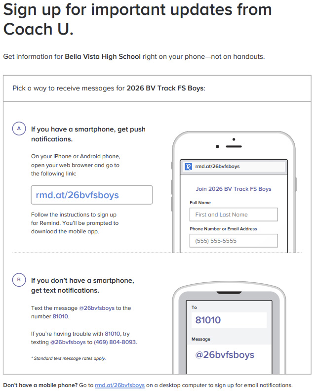 To receive Bella Vista Track and Field text message or email announcements follow these instructions.
