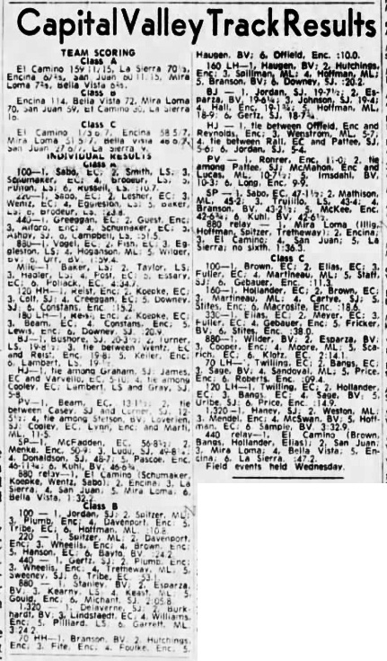 Licensed to Bella Vista High School HY-TEK's Meet Manager Capital Valley Conference Finals - 5/12/1962 El Camino High School Results (Hand Timed) Event 1 Boys 1 Mile Run ================================================================ Name Year School Finals ================================================================ 1 Baker, Gary 12 La Sierra 4:34.7 Event 2 Boys 120 Yard Hurdles ===================================================================== Name Year School Finals Wind ===================================================================== 1 Reist, Lloyd 11 Encina 15.2 Event 3 Boys 440 Yard Run ================================================================ Name Year School Finals ================================================================ 1 Creeggan, Rich 12 Encina 51.5 Event 4 Boys 100 Yard Dash ===================================================================== Name Year School Finals Wind ===================================================================== 1 Sabo, John 12 El Camino 10.7 Event 5 Boys 880 Yard Run ================================================================ Name Year School Finals ================================================================ 1 Vogel, Roy 11 El Camino 1:59.4 Event 6 Boys 180 Yard Hurdles =============================================================== Name Year School Finals =============================================================== 1 Reist, Lloyd 11 Encina 20.9 Event 7 Boys 220 Yard Dash ===================================================================== Name Year School Finals Wind ===================================================================== 1 Sabo, John 12 El Camino 23.8 Event 8 Boys 2 Mile Run ================================================================ Name Year School Finals ================================================================ 1 Colburn, Chuck 12 El Camino 10:02.2 Event 9 Boys 4x220 Yard Relay ================================================================ School Finals ================================================================ 1 El Camino 1:32.2 Event 10 Boys High Jump ================================================================ Name Year School Finals ================================================================ 1 Graham, George 12 San Juan 5-10.00 1 James, Bob 11 El Camino 5-10.00 1 Varvello, Ed 12 El Camino 5-10.00 3 Cooley, George 12 El Camino 5-08.00 3 Lynn, Rocky 12 Encina 5-08.00 3 Lambert, Terry 12 La Sierra 5-08.00 Event 11 Boys Pole Vault ================================================================ Name Year School Finals ================================================================ 1 Beam, Jim 12 El Camino 13-01.50 2 Casey, Mike 12 San Juan 12-05.50 2 Corner, Wally 12 San Juan 12-05.50 4 Stetson, Dave 11 Bella Vista 11-05.00 4 Cooley, George 12 El Camino 11-05.00 4 Lynn, Rocky 12 Encina 11-05.00 4 Marti, Gary 11 Mira Loma 11-05.00 Event 12 Boys Long Jump ===================================================================== Name Year School Finals Wind ===================================================================== 1 Bushore, Michael 12 San Juan 20-03.50 2 Turner, John 10 La Sierra 19-08.50 3 Wentz, Don 12 El Camino 19-08.00 3 Reist, Lloyd 11 Encina 19-08.00 5 Keller, Bob 12 Encina 19-00.50 6 Lambert, Terry 12 La Sierra 19-00.50 Event 13 Boys Shot Put ================================================================ Name Year School Finals ================================================================ 1 McFadden, Barry 12 El Camino 56-08.50 2 Menke, John 11 Encina 50-09.00 3 Ludu, Lloyd 12 San Juan 49-08.25 4 Donaldson, Bradley 12 San Juan 48-07.00 5 Pascoe, Mike 12 Encina 46-11.75 6 Kuhl, Carl 11 Bella Vista 46-06.75