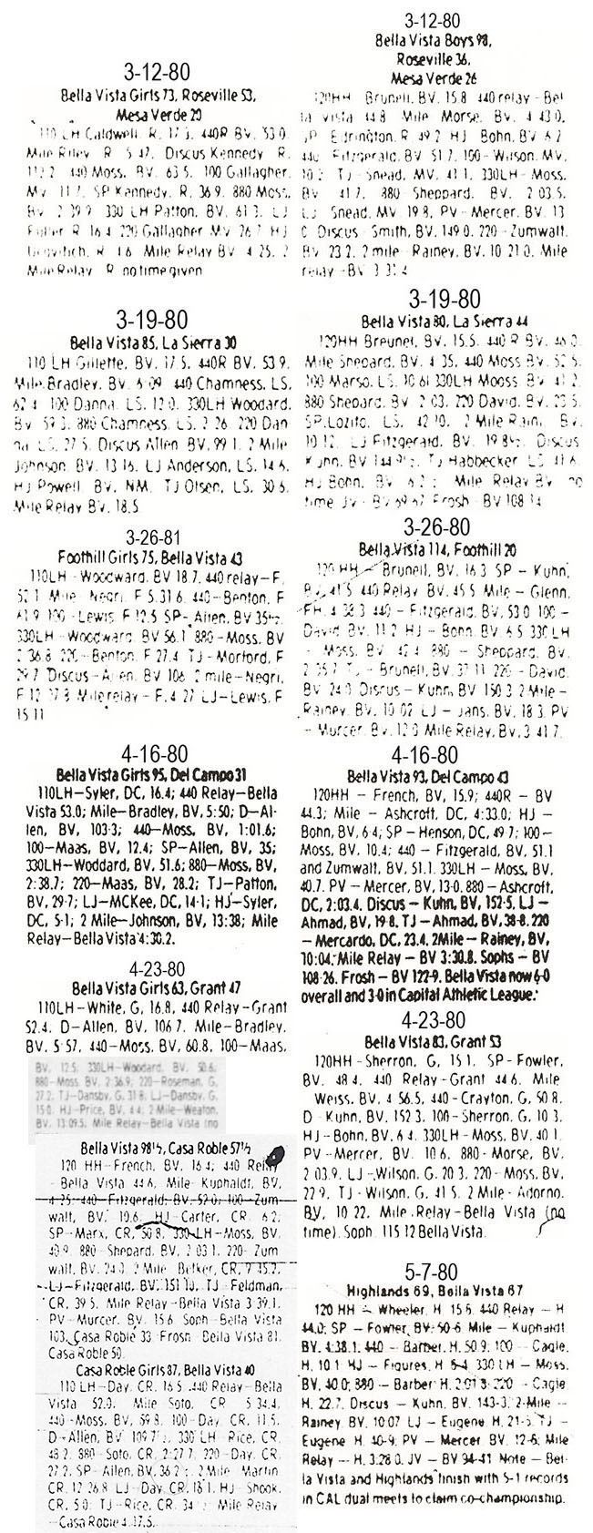 1980 BV Dual Meet Results