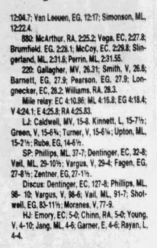 Licensed to Bella Vista High School HY-TEK's Meet Manager Capital Valley Conference Finals Elk Grove High School 5-16-1980 Event 1 Girls 110 Yard Hurdles Varsity =============================================================================== Name Year School Finals Wind H# Points =============================================================================== 1 McArthur, M 12 Rio Americano 15.6 Event 2 Boys 120 Yard Hurdles Varsity ============================================================================ Name Year School Finals Wind Points ============================================================================ 1 Klotz, Dean 12 Mira Loma 15.2 Event 3 Girls 4x110 Yard Relay Varsity ======================================================================= School Finals Points ======================================================================= 1 Valley 51.3 Event 7 Boys 4x110 Yard Relay Varsity ======================================================================= School Finals Points ======================================================================= 1 Elk Grove 44.1 Event 8 Girls 1 Mile Run Varsity ======================================================================= Name Year School Finals Points ======================================================================= 1 Skaden, Heika 11 Encina 5:08.5 2 Slingerland, Jeanette 12 Mira Loma 5:21.1 Event 9 Boys 1 Mile Run Varsity ======================================================================= Name Year School Finals Points ======================================================================= 1 Vail, Mike 12 Mira Loma 4:16.7 2 Spencer, Mark 12 Elk Grove 4:18.0 3 Swafford, Win 10 Encina 4:24.9 Event 11 Girls 440 Yard Dash Varsity ========================================================================== Name Year School Finals H# Points ========================================================================== 1 Longnecker, Carroll 10 El Camino 60.9 Event 12 Boys 440 Yard Dash Varsity ========================================================================== Name Year School Finals H# Points ========================================================================== 1 Harris, Mike 11 Valley 50.4 Event 14 Girls 100 Yard Dash Varsity =============================================================================== Name Year School Finals Wind H# Points =============================================================================== 1 Smith, Sonja 11 Valley 11.7 Event 15 Boys 100 Yard Dash Varsity =============================================================================== Name Year School Finals Wind H# Points =============================================================================== 1 Wilson, Byron 11 Mesa Verde 10.3 Event 17 Girls 330 Yard Hurdles Varsity ========================================================================== Name Year School Finals H# Points ========================================================================== Event 18 Boys 330 Yard Hurdles Varsity ========================================================================== Name Year School Finals H# Points ========================================================================== 1 Franklin, Jeff 11 Elk Grove 39.8 Event 20 Girls 880 Yard Run Varsity ======================================================================= Name Year School Finals Points ======================================================================= 1 McArthur, M 12 Rio Americano 2:25.2 2 Vega, Ruth 12 El Camino 2:27.8 3 Brumfield, Kathy 11 Elk Grove 2:28.1 Event 21 Boys 880 Yard Run Varsity ======================================================================= Name Year School Finals Points ======================================================================= 1 Spencer, Mark 12 Elk Grove 1:57.8 2 Immoos, Mike 12 Elk Grove 1:59.1 Event 23 Girls 220 Yard Dash Varsity =============================================================================== Name Year School Finals Wind H# Points =============================================================================== 1 Gallagher, Michelle 9 Mesa Verde 26.4 2 Smith, Sonja 11 Valley 26.6 Event 24 Boys 220 Yard Dash Varsity =============================================================================== Name Year School Finals Wind H# Points =============================================================================== 1 Corbett, C 12 Elk Grove 23.4 Event 26 Girls 2 Mile Run Varsity ======================================================================= Name Year School Finals Points ======================================================================= 1 Skaden, Heika 11 Encina 11:32.9 2 Slingerland, Jeanette 12 Mira Loma 11:50.6 3 Morrison, Donna 12 El Camino 11:55.0 Event 27 Boys 2 Mile Run Varsity ======================================================================= Name Year School Finals Points ======================================================================= 1 Scott, Jeff 11 El Camino 9:33.1 2 Vail, Mike 12 Mira Loma 9:39.3 3 Grubbs, Jeff 12 Elk Grove 9:42.0 4 Carroll, Dave 11 Mira Loma 9:42.8 Event 29 Girls 4x440 Yard Relay Varsity ======================================================================= School Finals Points ======================================================================= 1 El Camino 4:10.9 2 Mira Loma 4:16.8 3 Elk Grove 4:18.4 Event 30 Boys 4x440 Yard Relay Varsity ======================================================================= School Finals Points ======================================================================= 1 Valley 3:29.3 2 Mira Loma 3:29.4 Event 31 Girls High Jump Varsity ======================================================================= Name Year School Finals Points ======================================================================= 1 Emory, Shannon 12 El Camino 5-00.00 2 Chinn, Rebecca 10 Rio Americano 5-00.00 Event 32 Girls Pole Vault Varsity ======================================================================= Name Year School Finals Points =========