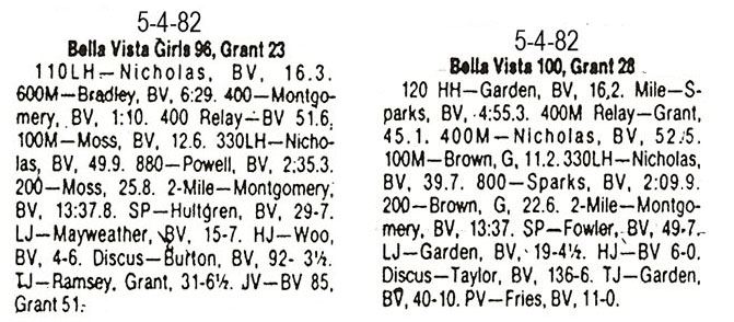 Licensed to Bella Vista High School HY-TEK's Meet Manager Bella Vista - Grant Dual - 5/5/1982 Grant High School Results Event 1 Girls 4x110 Yard Relay ================================================================ School Finals ================================================================ 1 Bella Vista 51.6h Event 2 Boys 4x110 Yard Relay ================================================================ School Finals ================================================================ 1 Grant 45.1h Event 3 Girls 1 Mile Run ================================================================ Name Year School Finals ================================================================ 1 Bradley, Tina 11 Bella Vista 6:29.0h Event 4 Boys 1 Mile Run ================================================================ Name Year School Finals ================================================================ 1 Sparks, Nick 10 Bella Vista 4:55.3h Event 5 Girls 110 Yard Hurdles ===================================================================== Name Year School Finals Wind ===================================================================== 1 Nicholas, Cris 10 Bella Vista 16.3h NWI Event 6 Boys 120 Yard Hurdles ===================================================================== Name Year School Finals Wind ===================================================================== 1 Gordon, Chris 11 Bella Vista 16.2h NWI Event 7 Girls 440 Yard Run ================================================================ Name Year School Finals ================================================================ 1 Montgomery, Laura 10 Bella Vista 1:10.0h Event 8 Boys 440 Yard Run ================================================================ Name Year School Finals ================================================================ 1 Nicholas, Craig 12 Bella Vista 52.5h Event 9 Girls 100 Meter Dash ===================================================================== Name Year School Finals Wind ===================================================================== 1 Moss, Jill 12 Bella Vista 12.6h NWI Event 10 Boys 100 Meter Dash ===================================================================== Name Year School Finals Wind ===================================================================== 1 Brown_82, James 11 Grant 11.2h NWI Event 11 Girls 880 Yard Run ================================================================ Name Year School Finals ================================================================ 1 Powell, Carrie 12 Bella Vista 2:35.3h Event 12 Boys 880 Yard Run ================================================================ Name Year School Finals ================================================================ 1 Sparks, Nick 11 Bella Vista 2:09.90 Event 13 Girls 330 Yard Hurdles =============================================================== Name Year School Finals =============================================================== 1 Nicholas, Cris 11 Bella Vista 49.9h Event 14 Boys 330 Yard Hurdles =============================================================== Name Year School Finals =============================================================== 1 Nicholas, Craig 12 Bella Vista 39.7h Event 15 Girls 200 Meter Dash ===================================================================== Name Year School Finals Wind ===================================================================== 1 Moss, Jill 12 Bella Vista 25.8h NWI Event 16 Boys 200 Meter Dash ===================================================================== Name Year School Finals Wind ===================================================================== 1 Brown_82, James 11 Grant 22.6h NWI Event 17 Girls 2 Mile Run ================================================================ Name Year School Finals ================================================================ 1 Montgomery, Laura 10 Bella Vista 13:37.8h Event 18 Boys 2 Mile Run ================================================================ Name Year School Finals ================================================================ 1 Lee, Mike 12 Bella Vista NT Event 21 Girls High Jump ================================================================ Name Year School Finals ================================================================ 1 Woo, Annette 9 Bella Vista 4-06.00 Event 22 Girls Long Jump ===================================================================== Name Year School Finals Wind ===================================================================== 1 Mayweather, Carletta 11 Bella Vista 15-07.00 NWI Event 23 Girls Triple Jump ===================================================================== Name Year School Finals Wind ===================================================================== 1 Ramsey, Arlette 12 Grant 31-06.50 NWI Event 24 Girls Shot Put ================================================================ Name Year School Finals ================================================================ 1 Hultgren, Jennifer 10 Bella Vista 29-07.00 Event 25 Girls Discus Throw ================================================================ Name Year School Finals ================================================================ 1 Burton, Britt 9 Bella Vista 92-03 Event 26 Boys High Jump ================================================================ Name Year School Finals ================================================================ 1 Unterholzner, David 11 Bella Vista 6-00.00 Event 27 Boys Pole Vault ================================================================ Name Year School Finals ================================================================ 1 Fries, Steve 12 Bella Vista 11-00.00 Event 28 Boys Long Jump ===================================================================== Name Year School Finals Wind ===================================================================== 1 Gordon, Chris 11 Bella Vista 19-04.50 NWI Event 29 Boys Triple Jump ===================================