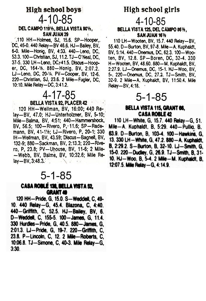 1985 BV Dual Meet Results
